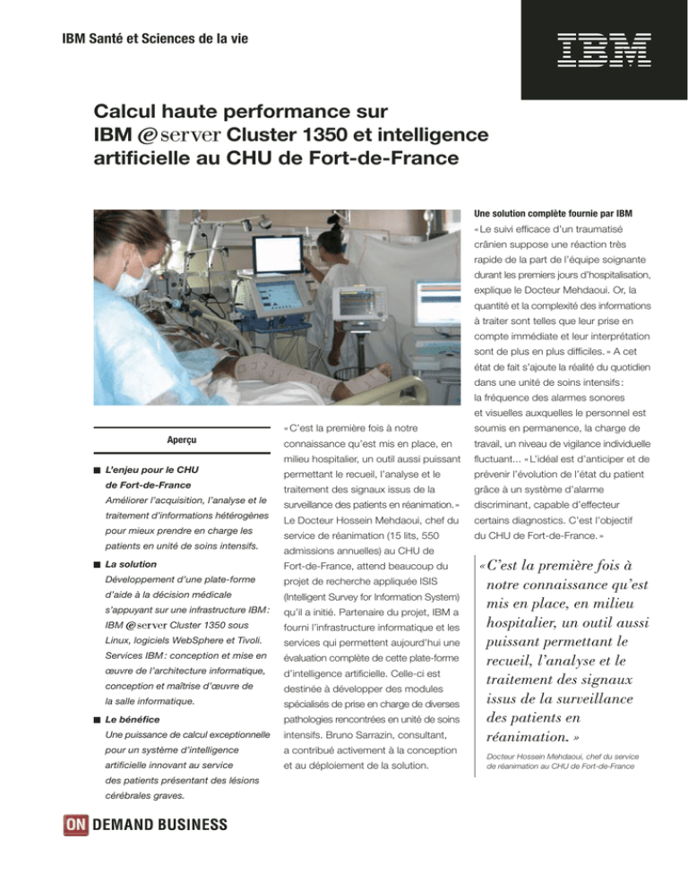 IBM Santé et Sciences de la vie Calcul haute performance sur IBM Cluster 1350 et intelligence artificielle au CHU de Fort-de-France Une solution complète fournie par IBM « Le suivi efficace d’un traumatisé crânien suppose une réaction très rapide de la part de l’équipe soignante durant les premiers jours d’hospitalisation, explique le Docteur Mehdaoui. Or, la quantité et la complexité des informations à traiter sont telles que leur prise en compte immédiate et leur interprétation sont de plus en plus difficiles. » A cet état de fait s’ajoute la réalité du quotidien dans une unité de soins intensifs : la fréquence des alarmes sonores et visuelles auxquelles le personnel est Aperçu « C’est la première fois à notre soumis en permanence, la charge de connaissance qu’est mis en place, en travail, un niveau de vigilance individuelle milieu hospitalier, un outil aussi puissant fluctuant... « L’idéal est d’anticiper et de L’enjeu pour le CHU permettant le recueil, l’analyse et le prévenir l’évolution de l’état du patient de Fort-de-France traitement des signaux issus de la grâce à un système d’alarme Améliorer l’acquisition, l’analyse et le surveillance des patients en réanimation. » discriminant, capable d’effecteur traitement d’informations hétérogènes Le Docteur Hossein Mehdaoui, chef du certains diagnostics. C’est l’objectif pour mieux prendre en charge les service de réanimation (15 lits, 550 du CHU de Fort-de-France. » patients en unité de soins intensifs. admissions annuelles) au CHU de La solution Fort-de-France, attend beaucoup du Développement d’une plate-forme projet de recherche appliquée ISIS d’aide à la décision médicale (Intelligent Survey for Information System) s’appuyant sur une infrastructure IBM : qu’il a initié. Partenaire du projet, IBM a IBM fourni l’infrastructure informatique et les Cluster 1350 sous Linux, logiciels WebSphere et Tivoli. services qui permettent aujourd’hui une Services IBM : conception et mise en évaluation complète de cette plate-forme œuvre de l’architecture informatique, d’intelligence artificielle. Celle-ci est conception et maîtrise d’œuvre de destinée à développer des modules la salle informatique. spécialisés de prise en charge de diverses Le bénéfice pathologies rencontrées en unité de soins Une puissance de calcul exceptionnelle intensifs. Bruno Sarrazin, consultant, pour un système d’intelligence a contribué activement à la conception artificielle innovant au service et au déploiement de la solution. des patients présentant des lésions cérébrales graves. «C’est la première fois à notre connaissance qu’est mis en place, en milieu hospitalier, un outil aussi puissant permettant le recueil, l’analyse et le traitement des signaux issus de la surveillance des patients en réanimation. » Docteur Hossein Mehdaoui, chef du service de réanimation au CHU de Fort-de-France Constitué autour d’un besoin d’aide à IBM TotalStorage DS4300 et d’un la décision médicale, ce projet fait appel lecteur de bande LTO IBM TotalStorage à diverses disciplines : automatique, 3580. Autre avantage : le logiciel de informatique, intelligence artificielle, supervision Cluster System Management mathématiques. D’où la présence au (CSM) qui simplifie l’administration du sein d’ISIS de cliniciens, d’universités, Cluster et en améliore la disponibilité. de laboratoires de recherche et d’entreprises informatiques et biomédicales. IBM s’est rapidement positionné grâce à son implantation locale et à une solution complète : • des services de conception et de mise en œuvre (l’architecture du système et une salle informatique «Avec IBM, nous avons une solution stable, sûre et puissante, qui ne nécessite pas de support informatique important. » Docteur Hossein Mehdaoui, chef du service de réanimation au CHU de Fort-de-France sécurisée, abritée dans une construction modulaire à l’extérieur La mise en œuvre par IBM de cette de l’hôpital) ; infrastructure entre octobre 2005 et • l’IBM Cluster 1350 sous satisfaction bien que soumise à des performance fiable, intégrée et facile contraintes techniques fortes liées à à superviser ; la poursuite de l’activité du service de réanimation. les fonctionnalités du Web (IBM WebSphere Application Server, IBM Progresser dans l’analyse de la complexité WebSphere Portal Server) et administrer S’il existe de nombreux produits le système (Tivoli Storage Manager). commerciaux permettant l’acquisition de données dans les chambres Une solution performante pour de soins intensifs, ISIS est la première un budget contraint plate-forme destinée à progresser « Avec IBM, nous avons une solution de façon significative dans l’analyse de stable, sûre et puissante, qui ne nécessite la complexité. Pour le Docteur Mehdaoui, pas de support informatique important, il s’agit « d’un bon modèle d’hétérogénéité souligne le Docteur Mehdaoui. De de l’information à traiter » puisqu’il nombreux automatismes aident au intègre des signaux analogiques et pilotage des serveurs. C’est indispensable numériques issus de techniques de en milieu hospitalier. » monitoring multimodales. A terme, il permettra de mettre en service un Disposant d’un budget contraint et système d’alarmes intelligentes et de désireux d’exploiter une infrastructure modéliser les événements cliniques à la fois performante et évolutive, le CHU pour améliorer significativement la prise de Fort-de-France a toute satisfaction en charge des patients. avec l’IBM Pour plus d’informations sur le On Demand Business, rendez-vous sur ibm.com/ondemand/fr IBM, le logo IBM, eServer Cluster 1350, le logo eServer, le logo On Demand Business, Tivoli, System x, WebSphere sont des marques de International Business Machines Corporation aux Etats-Unis et/ou dans les autres
