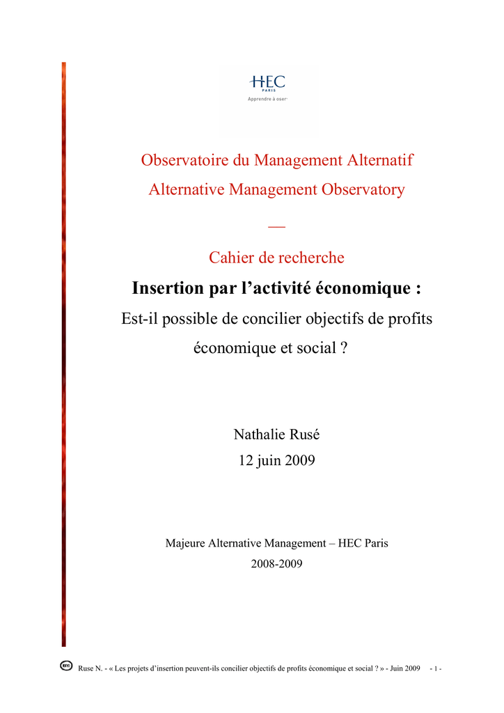 Observatoire du Management Alternatif Alternative Management Observatory __ Cahier de recherche Insertion par l’activité économique : Est-il possible de concilier objectifs de profits économique et social ? Nathalie Rusé 12 juin 2009 Majeure Alternative Management – HEC Paris 2008-2009 Ruse N. - « Les projets d’insertion peuvent-ils concilier objectifs de profits économique et social ? » - Juin 2009 -1- Genèse du présent document Ce cahier de recherche a été réalisé sous la forme initiale d’un mémoire de recherche dans le cadre de la Majeure Alternative Management, spécialité de troisième année du programme Grande Ecole d’HEC Paris. Il a été dirigé par Bernard Garrette, Professeur à HEC Paris, Responsable du Département Stratégie et Politique d’Entreprise, et soutenu le 18 juin 2009 en présence de Bernard Garrette et Nicole D’Anglejan, Responsable de la chaire entreprise et pauvreté et professeur à HEC Paris. Origins of this research This research was originally presented as a research essay within the framework of the “Alternative Management” specialization of the third-year HEC Paris business school programme. The essay has been supervised by Bernard Garrette, Professor in HEC Paris, Strategy and Business Policy Area Head, and delivered on June, 18th 2009 in the presence of Bernard Garrette and Nicole D’Angeljan, Professor within HEC Paris. Charte Ethique de l'Observatoire du Management Alternatif Les documents de l'Observatoire du Management Alternatif sont publiés sous licence Creative Commons http://creativecommons.org/licenses/by/2.0/fr/ pour promouvoir l'égalité de partage des ressources intellectuelles et le libre accès aux connaissances. L'exactitude, la fiabilité et la validité des renseignements ou opinions diffusés par l'Observatoire du Management Alternatif relèvent de la responsabilité exclusive de leurs auteurs. Ruse N. - « Les projets d’insertion peuvent-ils concilier objectifs de profits économique et social ? » - Juin 2009 -2- Les projets d’insertion permettent-ils de concilier durablement profits économique et social ? Résumé : Ce mémoire se propose d’analyser un nouveau modèle d’organisation qui met ses préoccupations sociales au cœur de son projet d’entreprise sans renier ses objectifs de performances économiques, le social business. Ce modèle permet-il réellement de créer de la valeur sur les plans sociaux et environnementaux ? La pertinence de ce concept sera ici étudiée dans le cas du secteur de l’insertion par l’activité économique. Profits et mission d’insertion sociale sont-ils vraiment conciliables comme l’affirment les théoriciens du concept de « triple bottom line »? Si oui, comment les structures de l’économie sociale et solidaire parviennent-elles à allier performance économique et sociale de manière pérenne ? Mots-clés : Développement durable, Triple bottom line, Entreprise sociale et solidaire Do reinsertion projects offer a sustainable means of reconciling economic and social profit? Abstract: The purpose of this dissertation is to analyse a new business model, which places social preoccupations at its heart without neglecting economic performance: social business. Does this alternative business model really create social and economic value? The relevance of this new concept will be analysed in the context of France’s social reintegration sector. Can profit and social reinsertion really be reconciled as is claimed by theoreticians from both the academic and the business worlds, who adhere to the concept of the “triple bottom line”? If so, what are the conditions necessary to achieving this double economic and social objective? Keywords: Sustainable development, Triple bottom line, Social business Ruse N. - « Les projets d’insertion peuvent-ils concilier objectifs de profits économique et social ? » - Juin 2009 -3- Remerciements Avant tout, un immense merci à Eve Chiapello et Karim Medjad, qui nous ont permis, grâce à la majeure Alternative Management, d’aborder autrement l’enseignement à HEC. Merci à toutes les personnes qui m’ont apporté leur soutien en me faisant profiter de leur expérience et de leurs contacts, notamment Nicole D’Anglejan, Patrick Sapy, Matthieu Grosset, Jean François Connan, ainsi que Mesdames Lesca, Clément et Boulenouar, Messieurs Guilly, Giffard, Trévisan, Desurmont, Clément, Bertonazzi, Tissier, Desbrest, Richou et Vincent. Un grand merci et toute ma reconnaissance à Monsieur Garrette pour ses conseils et ses commentaires qui m’ont permis d’orienter ma réflexion et d’adopter une approche critique. Tous mes remerciements également à Madame D’Anglejan pour avoir témoigné de l’intérêt à l’égard de mon travail et avoir accepté de l’évaluer. Merci à ma famille pour son soutien pendant toute ma scolarité et notamment pendant la réalisation de ce mémoire. Ruse N. - « Les projets d’insertion peuvent-ils concilier objectifs de profits économique et social ? » - Juin 2009 -4- Table des matières INTRODUCTION................................................................................................................................. 7 PARTIE 1............................................................................................................................................... 9 CADRAGE HISTORIQUE ET CONCEPTUEL DU SOCIAL BUSINESS ET DE L’IAE ............ 9 1.1. MISE EN PERSPECTIVE HISTORIQUE : LE SOCIAL BUSINESS, UNE THEORISATION ET UNE DIFFUSION RECENTE .................................................................................................................................................. 9 1.1.1. Les prémices du social business, de l’économie sociale et solidaire et de l’IAE.......................... 9 1.1.2. Une diffusion portée par l’engouement pour des comportements plus responsables et éthiques et la prise de conscience d’enjeux sociau