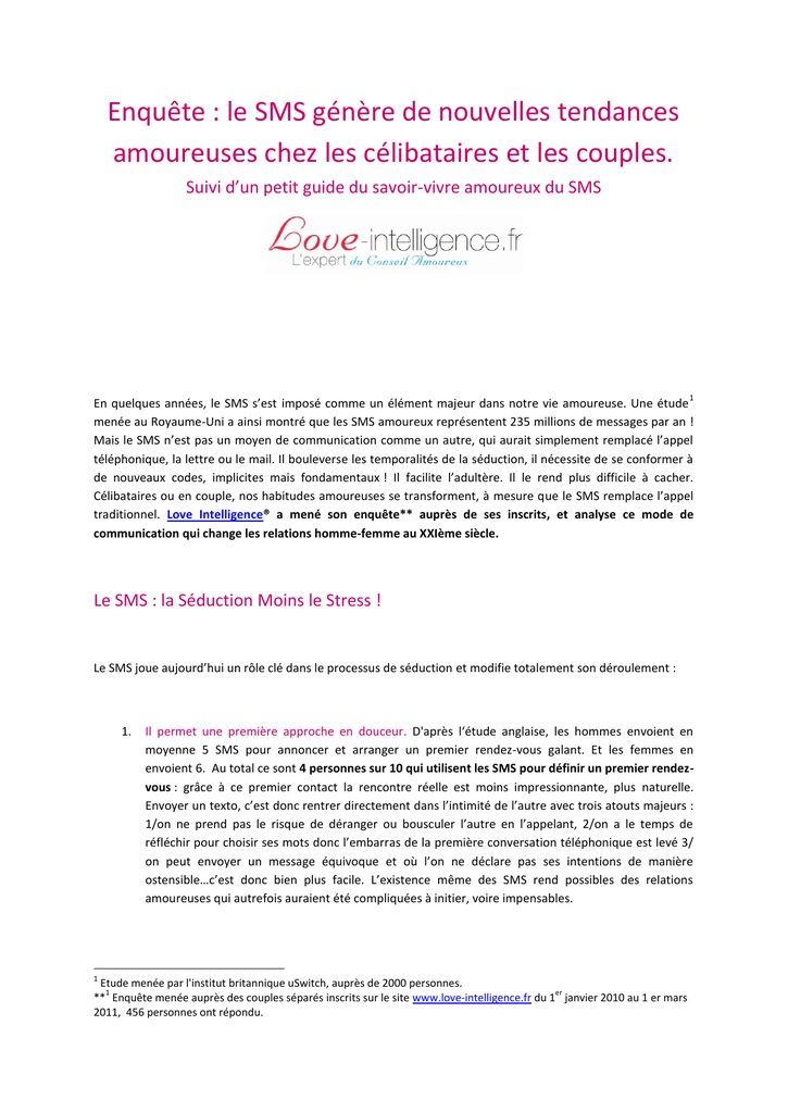 Enquête : le SMS génère de nouvelles tendances amoureuses chez les célibataires et les couples. Suivi d’un petit guide du savoir-vivre amoureux du SMS 1 En quelques années, le SMS s’est imposé comme un élément majeur dans notre vie amoureuse. Une étude menée au Royaume-Uni a ainsi montré que les SMS amoureux représentent 235 millions de messages par an ! Mais le SMS n’est pas un moyen de communication comme un autre, qui aurait simplement remplacé l’appel téléphonique, la lettre ou le mail. Il bouleverse les temporalités de la séduction, il nécessite de se conformer à de nouveaux codes, implicites mais fondamentaux ! Il facilite l’adultère. Il le rend plus difficile à cacher. Célibataires ou en couple, nos habitudes amoureuses se transforment, à mesure que le SMS remplace l’appel traditionnel. Love Intelligence® a mené son enquête** auprès de ses inscrits, et analyse ce mode de communication qui change les relations homme-femme au XXIème siècle. Le SMS : la Séduction Moins le Stress ! Le SMS joue aujourd’hui un rôle clé dans le processus de séduction et modifie totalement son déroulement : 1. 1 Il permet une première approche en douceur. D'après l‘étude anglaise, les hommes envoient en moyenne 5 SMS pour annoncer et arranger un premier rendez-vous galant. Et les femmes en envoient 6. Au total ce sont 4 personnes sur 10 qui utilisent les SMS pour définir un premier rendezvous : grâce à ce premier contact la rencontre réelle est moins impressionnante, plus naturelle. Envoyer un texto, c’est donc rentrer directement dans l’intimité de l’autre avec trois atouts majeurs : 1/on ne prend pas le risque de déranger ou bousculer l’autre en l’appelant, 2/on a le temps de réfléchir pour choisir ses mots donc l’embarras de la première conversation téléphonique est levé 3/ on peut envoyer un message équivoque et où l’on ne déclare pas ses intentions de manière ostensible…c’est donc bien plus facile. L’existence même des SMS rend possibles des relations amoureuses qui autrefois auraient été compliquées à initier, voire impensables. Etude menée par l'institut britannique uSwitch, auprès de 2000 personnes. 1 er ** Enquête menée auprès des couples séparés inscrits sur le site www.love-intelligence.fr du 1 janvier 2010 au 1 er mars 2011, 456 personnes ont répondu. 2. Les SMS permettent d’échanger plus et plus vite, et quasiment instantanément. Envoyer un texto est plus rapide que de passer un appel et est surtout moins impliquant. Avec le SMS on n’hésite plus à « relancer » la personne après un premier rendez-vous. Souvenez-vous de votre adolescence, quand, pour parler à votre amoureux(se), vous deviez appeler sur son fixe, et passer l’obstacle fatidique de ses parents… Si le téléphone portable révolutionne notre vie amoureuse, c’est parce qu’il est par définition personnel. 3. Une drague plus spirituelle. A nouvel outil, nouvelles méthodes de séduction ! Les SMS que l’on s’envoie pour se séduire s’apparentent à une joute verbale et constituent un dialogue bien particulier : chaque mot est analysé au moment de l’envoi et de la réception… Contrairement à ce que l’on pourrait croire, séduire par SMS demande de la subtilité, de l’humour, et une maîtrise du double langage ! Sous-entendus et connivence sont au rendez-vous. Le SMS dans le couple : arme de séduction et arme de destruction ! En couple, les SMS peuvent devenir très utiles pour entretenir la « petite flamme ». La journée, au bureau, vous pouvez ainsi montrer à votre partenaire que vous pensez à lui, sans paraître oppressant, ni perdre du temps comme si vous lui téléphoniez, puisque composer un SMS coquin demande en moyenne 1 minute et 12 secondes ! Le SMS devient alors une petite intention qui égaye votre quotidien, moins coûteux et plus personnel qu’un bouquet de fleurs (même si, soyons clair, il ne le remplace pas dans les occasions vraiment particulières). Le sexto : Pour les plus sulfureux, le « sexto » permet d’anticiper sur la soirée alors que vous êtes encore au travail, c’est une manière de commencer les préliminaires avant même de se voir. Mais les SMS posent aussi un gros problème de confiance dans les couples… Nombreux sont ceux qui considèrent que leur portable fait partie de leur jardin secret : 25% des partenaires dans un couple interdisent à leur moitié de lire leurs SMS sur leur mobile, en prétextant qu'ils sont trop personnels et que cela relève de leur vie privée ! Méfiance donc : vous pouvez être tenté de lire les textos de l’autre quand il a le dos tourné. Dans le pire des cas vous trouvez des SMS compromettants et vous savez qu’il ou elle vous trompe. Mais dans le meilleur des cas, si vous ne trouvez rien, votre méfiance et votre curiosité ne sont pas toujours apaisées pour autant car le réflexe est tentant ! La confiance, fondamentale à la relation de couple, est en permanence testée. Le SMS : Sexe, Mensonge et Séparation ? Pourquoi le SMS rend-il l’infidélité si tentante, si facile ? Parce que l’écriture par SMS permet de jouer subtilement avec des expressions équivoques, et donc de séduire sans trop prendre de risques…au cas où l’autre personne ne serait pas réceptive. Il faut davantage de courage pour prendre son téléphone dans le but d’annoncer à son interlocuteur une chose précise, plutôt que d’écrire un petit SMS de remerciement pour un bon moment passé tout en jouant sur l’équivoque… : une perche est tendue, on la saisie 3 minutes, 3 heures, 3 jours ou 3 semaines plus tard, quand le cœur nous en dit ou quand la tentation de jouer en pianotant est trop forte. Un premier SMS, c’est comme une porte qui s’ouvre, on décide de s’y faufiler…ou non. La poursuite d’une relation adultère semble facile : on peut envoyer un SMS coquin en cachette et comme bon nous semble, à condition d’eff