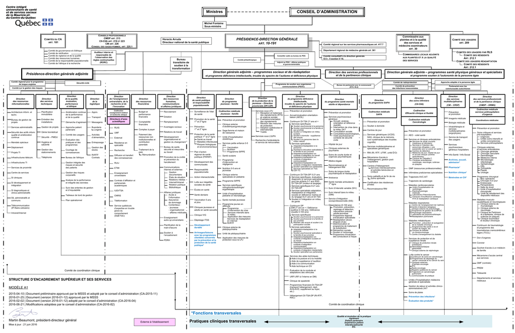 CONSEIL D’ADMINISTRATION Ministres Michel Fontaine Sous-ministre CONSEILS PROFESSIONNELS CMDP ART. 213 CII-CIIA ART. 219 ET 223 CM ART. 226 CONSEIL DES SAGES-FEMMES, ART. 225.1 COMITÉS DU CA ART. 181 Auditeur interne et responsable de l’observation des règles contractuelles (RORC) Conseiller cadre au bureau du PDG Bureau transitoire de soutien à la transformation Comité philanthropique et programme déficience intellectuelle, trouble du spectre de l’autisme et déficience physique Sécurité civile Programme de soutien aux organismes communautaires (PSOC) Comité sur la gestion des risques Architecture inform. et techn. Bureau de gestion de projets Direction des services techniques Planification immobilière Entretien des installations Services administratifs Gestion de projets Sécurité des actifs inform. qualité et amélioration continue Génie biomédical Mandats spéciaux Hygiène et salubrité Sécurité – PMDU Direction de la qualité, évaluation, performance et éthique Direction de la logistique Direction de l’enseignement universitaire, de la recherche et de l’innovation Amélioration continue de la performance et de la qualité Appro. Codirection enseignement médical et recherche clinique Démarche d’agrément Messagerie Approche patient partenaire Comité des usagers Évaluation des pratiques et des programmes Déploiement Projets TI Courtage de connaissances Infrastructures télécom. Téléphonie Bureau de l’éthique Infrastructures TI Services de proximité Centre de services Transport Directeurs d’axes scientifiques Buanderie Lingerie RUIS UMF Gestion des stationnements Activités d’alimentation Entreposage Gestion des stocks RI/RTF Contrats Gestion intégrée des risques et sécurité des patients Gestion des risques corporatifs Externat Résidence en spécialité Recherche Diffusion et transfert des connaissances Direction des ressources financières SI diagnostiques et clinico-administratifs SIL administratifs et communs Analyse de la performance et intégrité des données Suivi des ententes de gestion et d’imputabilité Budget et performance financière Comptabilité financière Remplacement Comptes à payer Paiement des ressources non institutionnelles et contribution parentale Traitement de la paie Rémunération Télécommunication (IP-filaire-cellulaire) IUDI/TSA Affaires juridiques Accès à l’information Assurance de dommage Contentieux : - jeunesse - organisationnel - affaires médicales Service québécois d’expertise en trouble grave du comportement (SQETGC) Intranet/Internet Bureau de santé, sécurité et mieux-être au travail Communications internes et externes Gestion documentaire États de situation Relations médias Internet/Intranet Relation publique Bibliothèque Contrats d’affiliation et partenariats académiques Téléformation Développement organisationnel et gestion du changement Promotion de la civilité et prévention du harcèlement Enseignement universitaire Plan opérationnel Surveillance de l’état de santé Promotion de la santé 1re et 2e ligne Prévention 1re et 2e ligne Relations de travail ETMI CNRIS Direction de santé publique et responsabilité populationnelle Direction du programme jeunesse - famille Codirection médicale Jeunesse - famille Dotation Avantages sociaux RUIJ Tableaux de bord de gestion Direction des ressources humaines, communications et affaires juridiques Recrutement SI cliniques SI développement et intégration Comité régional sur les services pharmaceutiques art. 417.7 Protection de la santé publique 1re et 2e ligne Santé au travail Maladies infectieuses Risques biologiques et environnementaux Plan d’action régional de santé publique (PARSP) Développement des communautés Responsabilité populationnelle Action intersectorielle Lutte aux inégalités sociales de santé Clinique externe d’obstétrique/gynécologie Sage-femme et maison de naissance Unité d’hospitalisation obstétrique Services petite enfance 0-5 ans Vaccination Nutrition Programme SIPPE Clinique externe spécialisée en pédiatrie Programme SIPPE Unité d’hospitalisation pédiatrie et néonatalogie Clinique IVG Dépistage ITSS Planification de la main-d'œuvre Développement durable Soutien à l’encadrement Arrimages/liaisons avec les programmes clientèles concernés par la prévention et la protection de la santé publique* Recherche d’antécédents et service de retrouvailles Nutrition 0-5 ans et jeunesse Santé dentaire Cliniques jeunesse et adulte en santé sexuelle Services sous LSJPA Programme d’intervention en négligence Écoles en santé Vaccination 5 ans et plus Services sous LPJ Réception et traitement des signalements (RTS) et urgence sociale Évaluation/orientation des signalements Révision des mesures de protection Adoption québécoise et internationale Tutelle Santé scolaire Services spécifiques orthophonie/audiologie/ ergothérapie Enseignement autre qu’universitaire PDRH Prévention et promotion Direction de la protection de la jeunesse – Direction provinciale (DPJ-DP) Santé mentale jeunesse Programme jeunes en difficulté Programme d’intervention de crise Services intensifs dans le milieu Application des mesures Services de réadaptation en internat RI/RTF Clinique externe de pédopsychiatrie Unité de pédopsychiatrie Application des mesures de protection sous la LPJ Direction du programme déficience intellectuelle, trouble du spectre de l’autisme et déficience physique Prévention et promotion Accueil-évaluation-orientationliaison (AEOL) Continuum DI-TSA 21 ans et + Services spécifiques Soutien psychosocial à la personne Soutien psychosocial à la famille et aux proches Soutien à l’intégration en milieu scolaire Soutien à domicile - suppléance des acquis Soutien à la personne dans le milieu naturel Services spécialisés Adaptation/réadaptation à la personne Assistance éducation spécialisée à la famille et aux proches Adaptation/réadapt