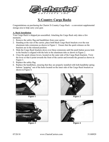 X-Country Cargo Racks Congratulations on purchasing the Chariot X-Country Cargo Rack – a convenient supplemental storage area to help carry your gear. A. Rack Installation Your Cargo Rack is shipped pre-assembled. Attaching the Cargo Rack only takes a few moments. 1. Remove the safety flag and handlebars from your carrier. 2. Standing at the rear of the carrier, place both black Cargo Rack brackets over the rear aluminum tube extensions as shown in Figure 1. Ensure that the quick releases on the brackets are in the released position. 3. Slide the Cargo Rack brackets down over these extensions until the push button access hole in the bracket is aligned with the hole in the aluminum tube as shown in Figure 2. 4. Close the quick release levers, located on the outer side of the Cargo Rack brackets. Twist the lever so that it point towards the front of the carrier and towards the ground as shown in Figure 3. 5. Replace the safety flag. 6. Replace the handlebars, ensuring that they are properly installed with both handlebar spring buttons “popping” out of the holes located on the inner side of the Cargo Rack brackets as shown in Figure 4. 07/28/10 Figure 1 Figure 2 Figure 3 Figure 4 www.ChariotCarriers.com 51100929 WARNING For the handlebars to be properly secured, both spring buttons must “pop” out of the holes located on the inside of the Cargo Rack brackets. Failure to inspect these buttons for proper installation could result in the handlebars separating from the carrier, causing serious injury or death to the occupant(s). B. Proper Use The Cargo Rack is designed for carrying lightweight, soft items only! The maximum capacity of the Cargo Rack is 2.3 kg/5 lb. 1. Place your cargo into the Cargo Rack. 2. The item(s) can be secured with either the elastic strap(s) or the cover as shown in Figures 5a & b. 3. Ensure the cargo is at least 75mm/3” from the occupants head(s). Note: Your carrier can experience many bumps and sharp movements during use. Ensure that all rack contents are securely restrained, as small items could bounce out of the Cargo Rack. Figure 5a Figure 5b WARNING Do not exceed the maximum capacity of 2.3kg/5lb in the Cargo Rack as the carrier could become unstable and potentially tip. Ensure that all items placed in the Cargo Rack are anchored securely and cannot come into contact with the occupant’s head(s). Do not place sharp and/or heavy objects in the Cargo Rack. Always maintain a 75mm/3” gap between the occupant’s head(s) and all rack contents. The Cargo Rack is for cargo only, not for children or pets! Failure to adhere to these warnings could result in serious injury of death to the occupant(s). C. Rack Removal The Cargo Rack can stay assembled on your carrier, even when folding your carrier. However, the Cargo Rack can be easily removed for storage or safe transport. 1. Remove the handlebars from your carrier. 2. Open the quick release levers, located on the outer face of the Cargo Rack brackets. 3. Remove the Cargo Rack. 4. Re-install the handlebars. Supports de chargement X-Country Nous vous félicitons d'avoir acheté le support de chargement Chariot X-Country, un espace de rangement supplémentaire pratique pour transporter votre équipement. A. Installation du support Votre support de chargement est expédié pré-assemblé. Quelques minutes seulement seront nécessaires pour l'installer. 1. Retirez le fanion de sécurité et le guidon de votre remorque. 2. Depuis l'arrière de la remorque, placez les deux pattes de fixation du support de chargement sur les rallonges arrière en aluminium, comme indiqué à la figure 1. Assurez-vous que les pinces de dégagement rapide sur les pattes de fixation sont en position libre. 3. Déplacez les pattes de fixation du support de chargement sur les rallonges jusqu'à ce que le trou d'accès du bouton-poussoir dans la patte de fixation soit aligné avec le trou dans le tube d'aluminium, comme indiqué à la figure 2. 4. Fermez les leviers de dégagement rapide situés sur le côté extérieur des pattes de fixation du support de chargement. Tournez le levier de sorte qu'il pointe vers l'avant de la remorque et vers le sol, comme indiqué à la figure 3. 5. Replacez le fanion de sécurité. 6. Replacez le guidon en vous assurant qu'il est bien installé, les deux boutons à ressort du guidon faisant saillie hors des trous situés sur le côté intérieur des pattes de fixation du support de chargement, comme indiqué à la figure 4. 07/28/10 Figure 1 Figure 2 Figure 3 Figure 4 www.ChariotCarriers.com 51100929 MISE EN GARDE Pour une installation adéquate du guidon, les deux boutons-poussoirs doivent être positionnés hors des trous à l'intérieur des pattes de fixation du support de chargement. Une inspection minutieuse de ces boutons et de l'installation est requise. En cas de défaut d'installation, le guidon risquerait de se séparer de la remorque et de causer des blessures graves, voire mortelles, aux occupants. B. Utilisation adéquate Le support de chargement est conçu seulement pour le transport d'articles souples et légers! Sa capacité de charge maximale est de 2,3 kg (5 lb). 1. Placez vos effets sur le support de chargement. 2. Les articles peuvent être fixés à l'aide de la sangle élastique ou du filet de protection, comme indiqué aux figures 5a et 5b. 3. Veillez à ce que le chargement soit au moins à 75 mm (3 po) de la tête de l'occupant. Remarque : Les nombreuses bosses sur la chaussée peuvent êtreressenties dans la remorque, tout comme les mouvements brusques effectués en roulant. Assurez-vous que tout le contenu du support de chargement est correctement arrimé pour éviter que les menus articles se déplacent à l'intérieur du support et en soient éjectés. Figure 5a Figure 5b MISE EN GARDE Ne dépassez pas la capacité de charge maximale de 2,3 kg (5 lb) du support de chargement car la remorque pourrait devenir instable et basculer. Assurez-vous que tous les articles placés da