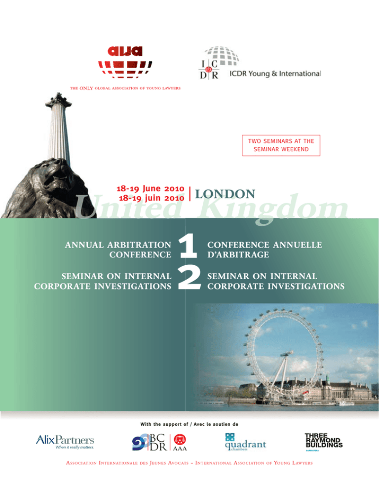 TWO SEMINARS AT THE SEMINAR WEEKEND 18-19 June 2010 18-19 juin 2010 |LONDON United Kingdom ANNUAL ARBITRATION CONFERENCE SEMINAR ON INTERNAL CORPORATE INVESTIGATIONS 1 2 CONFERENCE ANNUELLE D’ARBITRAGE SEMINAR ON INTERNAL CORPORATE INVESTIGATIONS With the support of / Avec le soutien de A SSOCI AT ION I N T ER NAT IONA L E DE S J EUNE S AVOC ATS – I N T ER NAT IONA L A SSOCI AT ION OF YOUNG L AW Y ER S Introduction Annual Arbitration Conference The AIJA International Arbitration Commission and ICDR Young & International are proud to invite you to the AIJA Annual Arbitration Conference in London. In a format designed to guarantee a lively debate, an entire day will be dedicated to interactive workshops moderated by experienced practitioners of the younger generation. In addition to these workshops, there will be substantial presentations on some of the hot topics in today’s arbitration world. All presentations and workshops will be tailored to the practical needs of arbitration users. This seminar will be an excellent opportunity to learn from top-level practitioners and academics from all over the world and exchange and discuss views on international arbitration. The venue will be London, one of the most important centres in international arbitration. The seminar is a must for all lawyers and in-house counsel interested and involved in international arbitration and those who wish to be better prepared for future disputes. It will be an especially good opportunity for young arbitration practitioners to establish and develop relationships with colleagues from other firms and countries. The two-day seminar program will cover all major aspects of international arbitration including ethical issues in international arbitration, challenging arbitral awards, emergency arbitration, insolvency and arbitration, ADR and settlement in arbitration, evaluation of damages, whether Europe can hold its position as arbitration centre, arbitration in emerging markets and cultural aspects in international arbitration. Participants will have the choice between a number of workshops. Last but not least, the social program will live up to the highest expectations and will include, among others events, a dinner cruise on the Thames. Conférence Annuelle d’Arbitrage La Commission «Arbitrage International» de l’AIJA et l’association «ICDR Young & International» ont l’honneur de vous inviter à leur séminaire annuel. La première journée sera dédiée à des présentations interactives assurées par des représentants aussi de la jeune garde montante de l’arbitrage international. Le séminaire traitera des tendances et évolutions majeures qu’il est impératif de connaître dans le monde de l’arbitrage. Un des objectifs de l’évènement est d’offrir des solutions pratiques aux acteurs de l’arbitrage au regard des problématiques juridiques abordées. Il s’agit d’une chance exceptionnelle de pouvoir bénéficier de l’expérience de spécialistes internationaux reconnus avec une véritable opportunité d’échanges. Londres a été choisie en sa qualité de haut lieu de l’arbitrage international. Le séminaire est un must pour tous les avocats et juristes d’entreprise intéressés ou déjà impliqués dans des arbitrages internationaux. Les jeunes praticiens de l’arbitrage pourront développer un tissu de relation avec des confrères et juristes venant de nombreux pays. Les deux journées de travail permettront de couvrir tous les aspects majeurs de l’arbitrage international dont les questions d’éthiques, les contestations des sentences, des procédures urgentes dans l’arbitrage, les procédures prearbitrales, la faillite et l’arbitrage, les transactions et les méthodes d’évaluation du préjudice. Enfin, nous nous interrogerons sur le rôle et le maintien de la place de l’Europe en tant que centre de l’arbitrage international à l’avenir, les pièges à éviter dans la procédure et les différences culturelles sur lesquelles il convient de rester toujours attentif. Les participants pourront choisir parmi un panel de différents ateliers de travail. Le programme social permettra de se détendre voire de continuer les débats dans une atmosphère plus informelle avec, notamment, un dîner croisière sur la Tamise. Programme London Annual Arbitration Conference Thursday, 17 June 2010 18.30 Registration, Welcome Drinks (sponsored by Quadrant chambers) at local venue Friday, 18 June 2010 8.30 9.00 9.15 Registration Welcome and Opening Saverio Lembo, President of AIJA Sandra De Vito Bieri, Co-Chair of the Organizing Committee Mark Appel, Senior Vice President, ICDR WORKSHOP A: Ethical Issues in International Arbitration Moderators: James Freeman, Allen & Overy (London) José María Alonso, Garrigues (Madrid), member of the IBA Ethics committee WORKSHOP B: Insolvency and Arbitration Moderators: Duncan Speller, WilmerHale (London) Matthias Scherer, Lalive (Geneva) WORKSHOP C: Emergency Arbitration: Pre-arbitral proceedings Moderators: Gisela Knuts, Roschier (Stockholm) Alexandra Johnson Wilcke, Schellenberg Wittmer (Geneva) Polina Permyakova, Delphi (Stockholm) 10.30 Coffee break 11.00 2nd Round of Workshops A-C 12.30 Lunch (sponsored by the Bahrain Chamber for Dispute Resolution) 14.00 WORKSHOP D: Challenging arbitral awards Moderators: Tobias Zuberbühler, Lustenberger Glaus & Partner (Zurich) Ned Beale, Olswang (London) WORKSHOP E: ADR and Settlement in Arbitration Moderators: Sandra De Vito Bieri, Rohner Attorneys at law (Zurich) Chris Newmark, CEDR (London) WORKSHOP F: Evaluation of damages Moderators: Michelangelo Cicogna, De Berti Jacchia Franchini Forlani (Milan) Andrew Grantham, Alix Partners (London) 15.15 Coffee break 15.45 2nd Round of Workshops D-F 17.00 End of Friday programme 19.00 Boat Cruise Saturday, 19 June 2010 9.00 9.15 Introduction Can Europe hold its position as arbitration centre? Urs Lustenberger, Lustenberger Glaus & Partner (Zurich) 1