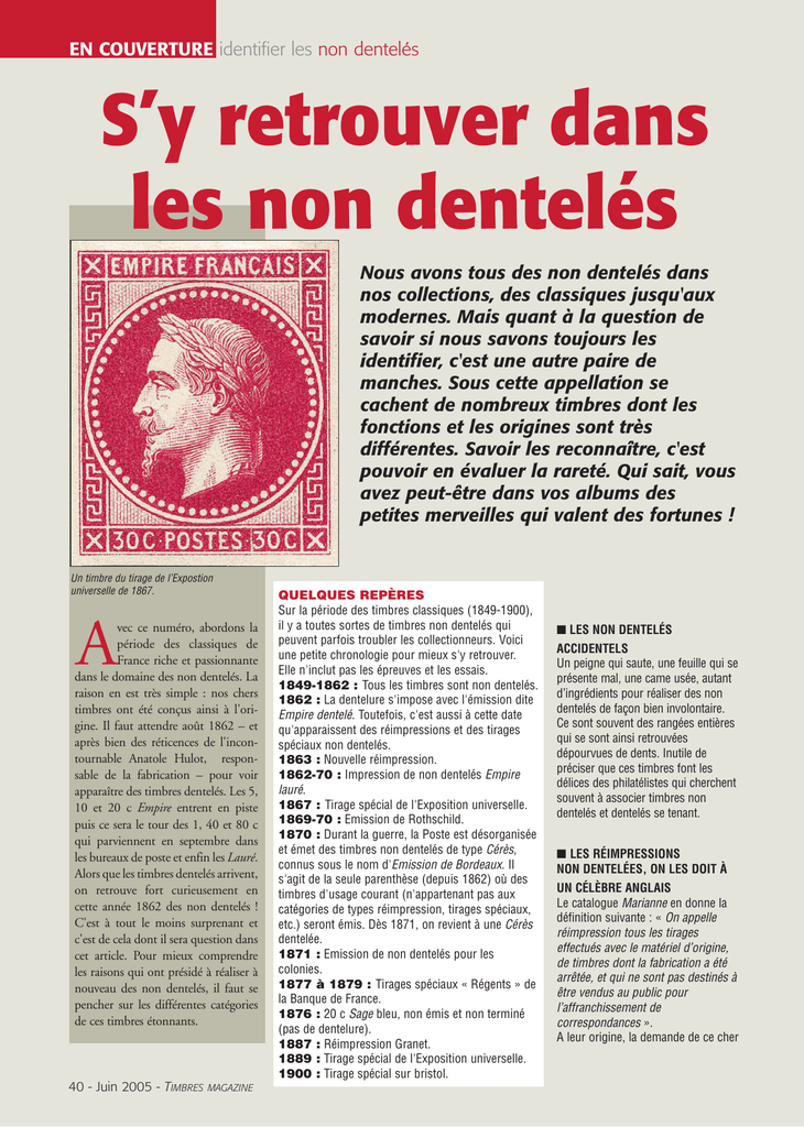 En couverture identifier les non dentelés S’y retrouver dans les non dentelés Nous avons tous des non dentelés dans nos collections, des classiques jusqu'aux modernes. Mais quant à la question de savoir si nous savons toujours les identifier, c'est une autre paire de manches. Sous cette appellation se cachent de nombreux timbres dont les fonctions et les origines sont très différentes. Savoir les reconnaître, c'est pouvoir en évaluer la rareté. Qui sait, vous avez peut-être dans vos albums des petites merveilles qui valent des fortunes ! Un timbre du tirage de l’Expostion universelle de 1867. A vec ce numéro, abordons la période des classiques de France riche et passionnante dans le domaine des non dentelés. La raison en est très simple : nos chers timbres ont été conçus ainsi à l'origine. Il faut attendre août 1862 – et après bien des réticences de l'incontournable Anatole Hulot, responsable de la fabrication – pour voir apparaître des timbres dentelés. Les 5, 10 et 20 c Empire entrent en piste puis ce sera le tour des 1, 40 et 80 c qui parviennent en septembre dans les bureaux de poste et enfin les Lauré. Alors que les timbres dentelés arrivent, on retrouve fort curieusement en cette année 1862 des non dentelés ! C'est à tout le moins surprenant et c'est de cela dont il sera question dans cet article. Pour mieux comprendre les raisons qui ont présidé à réaliser à nouveau des non dentelés, il faut se pencher sur les différentes catégories de ces timbres étonnants. 40 - Juin 2005 - Timbres magazine Quelques repères Sur la période des timbres classiques (1849-1900), il y a toutes sortes de timbres non dentelés qui peuvent parfois troubler les collectionneurs. Voici une petite chronologie pour mieux s'y retrouver. Elle n'inclut pas les épreuves et les essais. 1849-1862 : Tous les timbres sont non dentelés. 1862 : La dentelure s'impose avec l'émission dite Empire dentelé. Toutefois, c'est aussi à cette date qu'apparaissent des réimpressions et des tirages spéciaux non dentelés. 1863 : Nouvelle réimpression. 1862-70 : Impression de non dentelés Empire lauré. 1867 : Tirage spécial de l'Exposition universelle. 1869-70 : Emission de Rothschild. 1870 : Durant la guerre, la Poste est désorganisée et émet des timbres non dentelés de type Cérès, connus sous le nom d'Emission de Bordeaux. Il s'agit de la seule parenthèse (depuis 1862) où des timbres d'usage courant (n'appartenant pas aux catégories de types réimpression, tirages spéciaux, etc.) seront émis. Dès 1871, on revient à une Cérès dentelée. 1871 : Emission de non dentelés pour les colonies. 1877 à 1879 : Tirages spéciaux « Régents » de la Banque de France. 1876 : 20 c Sage bleu, non émis et non terminé (pas de dentelure). 1887 : Réimpression Granet. 1889 : Tirage spécial de l'Exposition universelle. 1900 : Tirage spécial sur bristol. ■ LES NON DENTELÉS ACCIDENTELS Un peigne qui saute, une feuille qui se présente mal, une came usée, autant d’ingrédients pour réaliser des non dentelés de façon bien involontaire. Ce sont souvent des rangées entières qui se sont ainsi retrouvées dépourvues de dents. Inutile de préciser que ces timbres font les délices des philatélistes qui cherchent souvent à associer timbres non dentelés et dentelés se tenant. ■ LES RÉIMPRESSIONS NON DENTELÉES, ON LES DOIT À UN CÉLÈBRE ANGLAIS Le catalogue Marianne en donne la définition suivante : « On appelle réimpression tous les tirages effectués avec le matériel d’origine, de timbres dont la fabrication a été arrêtée, et qui ne sont pas destinés à être vendus au public pour l’affranchissement de correspondances ». A leur origine, la demande de ce cher Réimpression de 1862 cotation Marianne* Cérès 10 c bistre 14 feuilles ½ soit 4 350 timbres idem 15 c vert clair 20 c noir idem idem 20 c bleu 25 c bleu idem 40 c orange idem dont 29 paires de 4 retouchés 4 retouchés seuls idem 1F rouge Présidence 10 c bistre 25 c bleu 274 335 152 274 274 335 25 915 9 146 335 idem idem Empire 25 c bleu surcharge 25 c en rouge 335 274 idem idem 274 9 909 Réimpression de 1863 1 F rouge dont tête-bêche 40 paires 20 feuilles soit 6 000 timbres 1 067 13 720 * Le dernier catalogue Marianne a été publié en 1999 avec des cotes en francs. Nous les avons converties en euros. Ce catalogue est un outil très précieux pour la connaissance des classiques de France. Rowland Hill, célébrissime créateur du timbre poste, qui souhaitait compléter sa collection de timbres de France. Il écrit dans ce sens à un dénommé Vandal, directeur général des Postes françaises. Il fut constaté « qu’aucun spécimen qui manque n’a été conservé ». On décide alors pour satisfaire Sir Hill et aussi pour constituer une collection officielle pour la France de réimprimer certains timbres non dentelés. Hulot se met au travail, on l’imagine dans l’enthousiasme, lui qui n’aime pas les timbres dentelés. La réimpression est effectuée le 9 septembre 1862. Ils sont superbement imprimés et donc non dentelés afin d’en faciliter la conservation. Les collections ainsi constituées allaient être conservées par de nombreux organismes officiels comme la Commission des Monnaies et Médailles, le Musée monétaire, l’Administration des Postes, etc. Comme toujours en philatélie, qui dit tirages pour des officiels dit aussi des sorties officieuses. Ces timbres apparaissent ensuite sur le marché (certains en quantités très limitées) et sont bien entendu cotés dans les catalogues. ■ LES TIRAGES SPÉCIAUX Les tirages spéciaux peuvent encore aujourd’hui semer le trouble chez les philatélistes et susciter bien des interrogations lorsqu’ils sont en présence de ces timbres. En voici la définition du Marianne : « Il s’agit de vignettes imprimées parfois avec un matériel spécialement réalisé à cet effet, pour des raisons spécifiques, non destinées 
