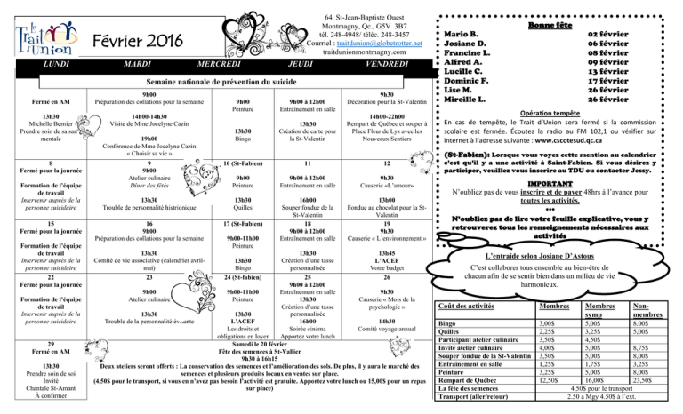 64, St-Jean-Baptiste Ouest Montmagny, Qc., G5V 3B7 tél. 248-4948/ téléc. 248-3457 Courriel : [email protected] traitdunionmontmagny.com Février 2016 2015 LUNDI 1 MARDI MERCREDI 2 JEUDI 3 4 9h30 Décoration pour la St-Valentin Opération tempête En cas de tempête, le Trait d’Union sera fermé si la commission scolaire est fermée. Écoutez la radio au FM 102,1 ou vérifier sur internet à l’adresse suivante : www.cscotesud.qc.ca VENDREDI 5 Semaine nationale de prévention du suicide Fermé en AM 13h30 Michelle Bernier Prendre soin de sa santé mentale 8 Fermé pour la journée Formation de l’équipe de travail Intervenir auprès de la personne suicidaire 15 Fermé pour la journée Formation de l’équipe de travail Intervenir auprès de la personne suicidaire 22 Fermé pour la journée 26 Formation de l’équipe de travail Intervenir auprès de la personne suicidaire 29 Fermé en AM 13h30 Prendre soin de soi Invité Chantale St-Amant À confirmer 9h00 Préparation des collations pour la semaine 9h00 Peinture 14h00-14h30 Visite de Mme Jocelyne Cazin 9h00 à 12h00 Entraînement en salle 13h30 Bingo 13h30 Création de carte pour la St-Valentin 14h00-22h00 Rempart de Québec et souper à Place Fleur de Lys avec les Nouveaux Sentiers 9 9h00 Atelier culinaire Dîner des fêtés 10 (St-Fabien) 11 12 9h00 Peinture 9h00 à 12h00 Entraînement en salle 9h30 Causerie «L’amour» 13h30 Trouble de personnalité histrionique 13h30 Quilles 16 9h00 Préparation des collations pour la semaine 17 (St-Fabien) 16h00 Souper fondue de la St-Valentin 18 9h00 à 12h00 Entraînement en salle 13h00 Fondue au chocolat pour la StValentin 19 9h30 Causerie « L’environnement » 19h00 Conférence de Mme Jocelyne Cazin « Choisir sa vie » 13h30 Comité de vie associative (calendrier avrilmai) 23 Bonne fête Mario B. Josiane D. Francine L. Alfred A. Lucille C. Dominic F. Lise M. Mireille L. 02 février 06 février 08 février 09 février 13 février 17 février 26 février 26 février (St-Fabien): Lorsque vous voyez cette mention au calendrier 9h00-11h00 Peinture 13h30 13h45 Création d’une tasse L’ACEF personnalisée Votre budget 25 26 9h00 à 12h00 Entraînement en salle 9h00 9h00-11h00 9h30 Atelier culinaire Peinture Causerie « Mois de la 13h30 Création d’une tasse psychologie » personnalisée 13h30 13h30 Trouble de la personnalité évitante L’ACEF 16h00 14h30 Les droits et Soirée cinéma Comité voyage annuel obligations en loyer Apportez votre lunch Samedi le 20 février Fête des semences à St-Vallier 9h30 à 16h15 Deux ateliers seront offerts : La conservation des semences et l’amélioration des sols. De plus, il y aura le marché des semences et plusieurs produits locaux en ventes sur place. (4,50$ pour le transport, si vous en n’avez pas besoin l’activité est gratuite. Apportez votre lunch ou 15,00$ pour un repas sur place) 13h30 Bingo 24 (St-fabien) c’est qu’il y a une activité à Saint-Fabien. Si vous désirez y participer, veuillez vous inscrire au TDU ou contacter Jessy. IMPORTANT N’oubliez pas de vous inscrire et de payer 48hrs à l’avance pour toutes les activités. N’oubliez pas de lire votre feuille explicative, vous y retrouverez tous les renseignements nécessaires aux activités L’entraide selon Josiane D’Astous C’est collaborer tous ensemble au bien-être de chacun afin de se sentir bien dans un milieu de vie harmonieux. Coût des activités Membres Bingo Quilles Participant atelier culinaire Invité atelier culinaire Souper fondue de la St-Valentin Entraînement en salle Peinture Rempart de Québec La fête des semences Transport (aller/retour) 3,00$ 2,25$ 3,50$ 4,00$ 3,50$ 1,25$ 3,25$ 12,50$ Membres symp Nonmembres 5,00$ 8.00$ 3,25$ 5,00$ 4,50$ 5,00$ 8,75$ 5,00$ 8,00$ 1,75$ 3,25$ 5,00$ 8,00$ 16,00$ 23,50$ 4,50$ pour le transport 2.50 a Mgy 4.50$ à l`ext. 64, St-Jean-Baptiste Ouest Montmagny, Qc., G5V 3B7 tél. 248-4948/ téléc. 248-3457 Courriel : [email protected] traitdunionmontmagny.com Mars 2016 LUNDI 7 Fermé en AM MERCREDI 1 2 3 4 9h00 Atelier culinaire Dîner des fêtés de mars 9h00 Peinture Fermé pour la journée Fermé pour la journée 13h30 Journée mondiale du compliment 8 JOURNÉE INTERNATIONNALE DE LA FEMME 13h30 Bingo 9 (St-Fabien) Création d’outils d’intervention 2016-2017 Plan d’action de l’équipe de travail 2016-2017 10 9h00 à 12h00 Entraînement en salle 11 13h30 Ma résolution en lien avec ma santé mentale (symptôme vs objectif) 9h00 Causerie et viennoiserie spécial femme 14 Fermé en AM 15 9h00 Atelier culinaire 13h30 Ma résolution en lien avec mon alimentation (mon alimentation vs un défi) 21 Fermé en AM 13h30 26 Ma résolution en lien avec ma santé physique (motivation et défi) 28 Fermé pour la journée Lundi de Pâques JEUDI MARDI 13h30 Trouble de personnalité dépendante 13h30 Comité de vie associative (vérification des calendriers avril-mai) 9h00 Peinture 13h30 Quilles 16 (St-Fabien) 9h00-11h00 Peinture 13h30 Bingo 22 9h00 Préparation des collations pour la semaine 23 (St-fabien) 13h30 Trouble de la personnalité paranoïaque 13h30 Groupe de la parole 29 30 9h00 Atelier culinaire spécial Pâques 9h00-11h00 Peinture 13h30 Esstrardinairement Sol Visualisation du DVD 9h00-11h00 Peinture 13h30 Création d’un panier recyclé 13h30 Comité jardin 16h00 Soirée ni OUI ni NON Avec atelier de smoothies 17 9h00 à 12h00 Entraînement en salle 13h30 Comité jardin 24 9h00 à 12h00 Entraînement en salle 13h30 Comité jardin 31 9h00 à 12h00 Entraînement en salle 13h30 Défi santé 2016 Manger mieux, bouger plus et garder l’équilibre! 16h00 Souper au Restaurant Bel’Air VENDREDI 9h30 Causerie « Les droits des femmes dans le monde» 13h30 Décoration de Pâques 18 9h00 à 16h00 Sortie de sucre Cabane à Pierre À Frampton Bonne fête Sébastien V. Nicole R. Nathan L. Marjolaine B. Martin B. Marco V. Solange R. 07 mars 09 mars 11 mars 13 mars 17 mars 28 mars 30 mars Opération tempête En cas de