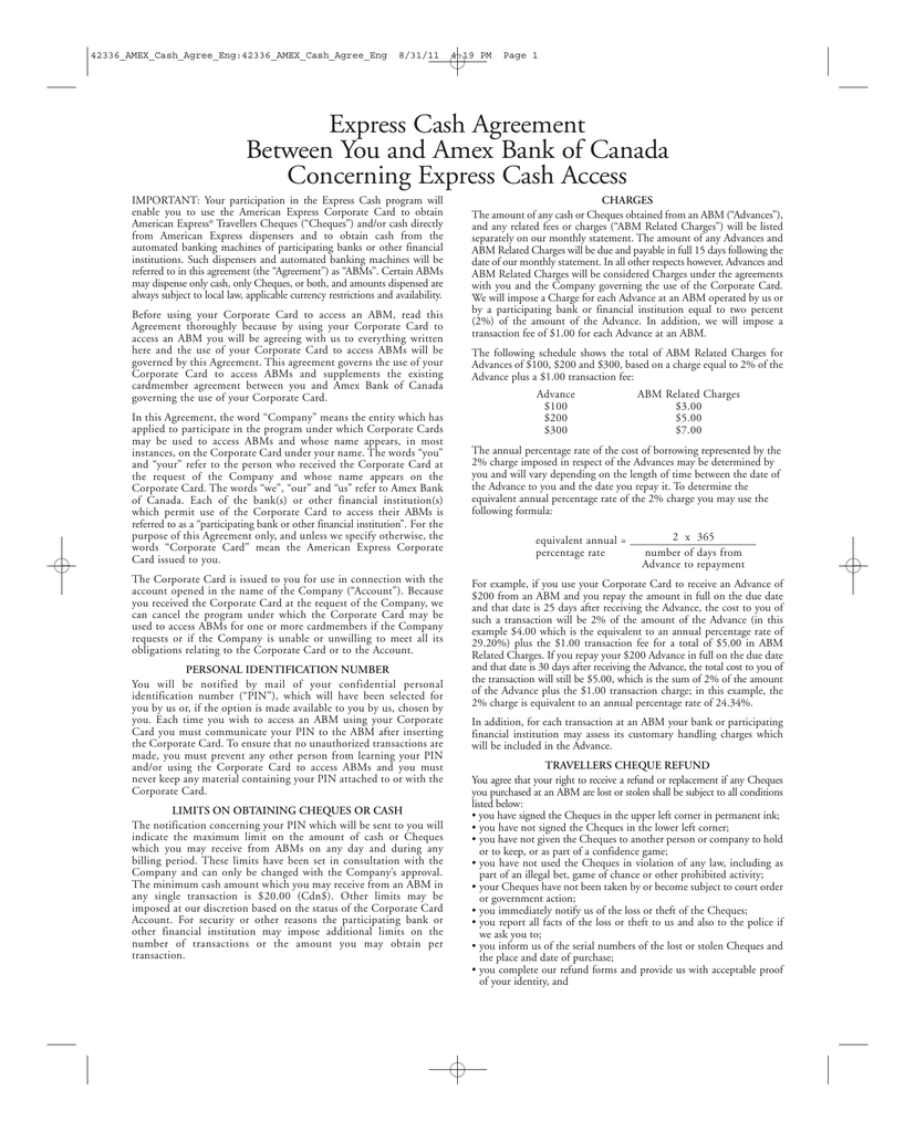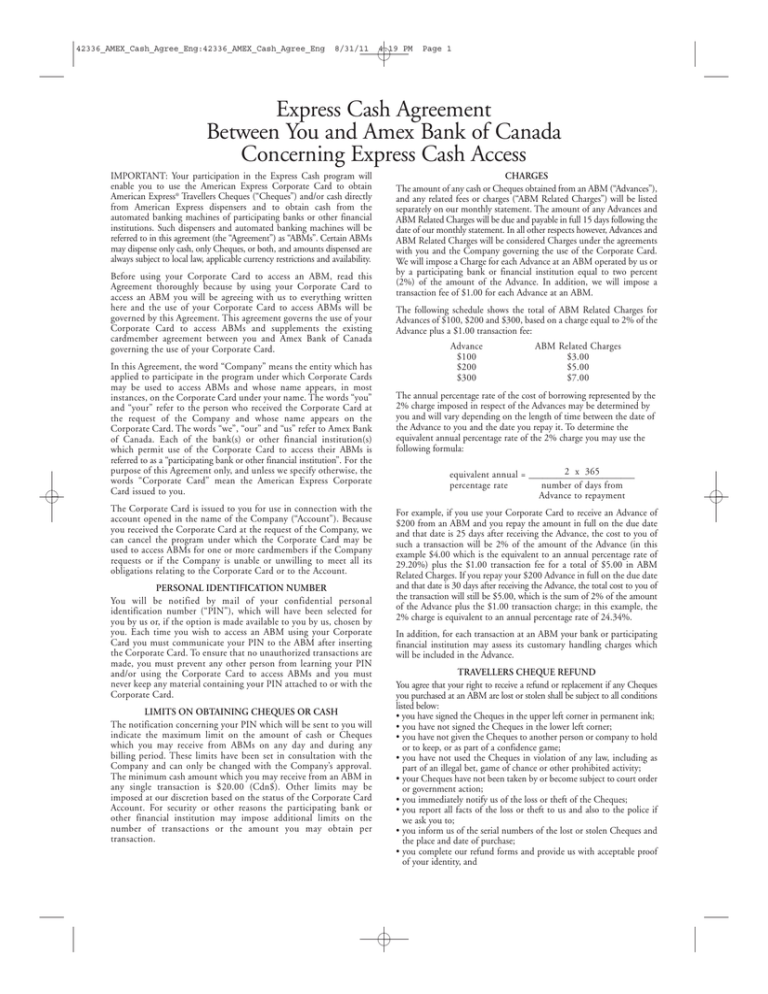 42336_AMEX_Cash_Agree_Eng:42336_AMEX_Cash_Agree_Eng 8/31/11 4:19 PM Page 1 Express Cash Agreement Between You and Amex Bank of Canada Concerning Express Cash Access IMPORTANT: Your participation in the Express Cash program will enable you to use the American Express Corporate Card to obtain American Express® Travellers Cheques (“Cheques”) and/or cash directly from American Express dispensers and to obtain cash from the automated banking machines of participating banks or other financial institutions. Such dispensers and automated banking machines will be referred to in this agreement (the “Agreement”) as “ABMs”. Certain ABMs may dispense only cash, only Cheques, or both, and amounts dispensed are always subject to local law, applicable currency restrictions and availability. Before using your Corporate Card to access an ABM, read this Agreement thoroughly because by using your Corporate Card to access an ABM you will be agreeing with us to everything written here and the use of your Corporate Card to access ABMs will be governed by this Agreement. This agreement governs the use of your Corporate Card to access ABMs and supplements the existing cardmember agreement between you and Amex Bank of Canada governing the use of your Corporate Card. In this Agreement, the word “Company” means the entity which has applied to participate in the program under which Corporate Cards may be used to access ABMs and whose name appears, in most instances, on the Corporate Card under your name. The words “you” and “your” refer to the person who received the Corporate Card at the request of the Company and whose name appears on the Corporate Card. The words “we”, “our” and “us” refer to Amex Bank of Canada. Each of the bank(s) or other financial institution(s) which permit use of the Corporate Card to access their ABMs is referred to as a “participating bank or other financial institution”. For the purpose of this Agreement only, and unless we specify otherwise, the words “Corporate Card” mean the American Express Corporate Card issued to you. The Corporate Card is issued to you for use in connection with the account opened in the name of the Company (“Account”). Because you received the Corporate Card at the request of the Company, we can cancel the program under which the Corporate Card may be used to access ABMs for one or more cardmembers if the Company requests or if the Company is unable or unwilling to meet all its obligations relating to the Corporate Card or to the Account. PERSONAL IDENTIFICATION NUMBER You will be notified by mail of your confidential personal identification number (“PIN”), which will have been selected for you by us or, if the option is made available to you by us, chosen by you. Each time you wish to access an ABM using your Corporate Card you must communicate your PIN to the ABM after inserting the Corporate Card. To ensure that no unauthorized transactions are made, you must prevent any other person from learning your PIN and/or using the Corporate Card to access ABMs and you must never keep any material containing your PIN attached to or with the Corporate Card. LIMITS ON OBTAINING CHEQUES OR CASH The notification concerning your PIN which will be sent to you will indicate the maximum limit on the amount of cash or Cheques which you may receive from ABMs on any day and during any billing period. These limits have been set in consultation with the Company and can only be changed with the Company’s approval. The minimum cash amount which you may receive from an ABM in any single transaction is $20.00 (Cdn$). Other limits may be imposed at our discretion based on the status of the Corporate Card Account. For security or other reasons the participating bank or other financial institution may impose additional limits on the number of transactions or the amount you may obtain per transaction. CHARGES The amount of any cash or Cheques obtained from an ABM (“Advances”), and any related fees or charges (“ABM Related Charges”) will be listed separately on our monthly statement. The amount of any Advances and ABM Related Charges will be due and payable in full 15 days following the date of our monthly statement. In all other respects however, Advances and ABM Related Charges will be considered Charges under the agreements with you and the Company governing the use of the Corporate Card. We will impose a Charge for each Advance at an ABM operated by us or by a participating bank or financial institution equal to two percent (2%) of the amount of the Advance. In addition, we will impose a transaction fee of $1.00 for each Advance at an ABM. The following schedule shows the total of ABM Related Charges for Advances of $100, $200 and $300, based on a charge equal to 2% of the Advance plus a $1.00 transaction fee: Advance $100 $200 $300 ABM Related Charges $3.00 $5.00 $7.00 The annual percentage rate of the cost of borrowing represented by the 2% charge imposed in respect of the Advances may be determined by you and will vary depending on the length of time between the date of the Advance to you and the date you repay it. To determine the equivalent annual percentage rate of the 2% charge you may use the following formula: 2 x 365 equivalent annual = _______________________ percentage rate number of days from Advance to repayment For example, if you use your Corporate Card to receive an Advance of $200 from an ABM and you repay the amount in full on the due date and that date is 25 days after receiving the Advance, the cost to you of such a transaction will be 2% of the amount of the Advance (in this example $4.00 which is the equivalent to an annual percentage rate of 29.20%) plus the $1.00 transaction fee for a total of $5.00 in ABM Related Charges. If you repay your $200 Advance in full on the due date and that date is 30 days after receiving the Advance, the total cost to you of the transaction will still be $5.00, which is 