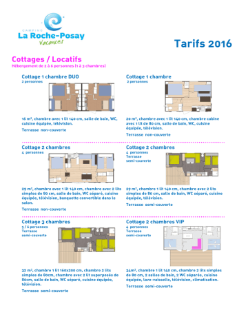 Tarifs 2016 Cottages / Locatifs Hébergement de 2 à 6 personnes (1 à 3 chambres) Cottage 1 chambre DUO Cottage 1 chambre 2 personnes 2 personnes 16 m², chambre avec 1 lit 140 cm, salle de bain, WC, cuisine équipée, télévision. 20 m², chambre avec 1 lit 140 cm, chambre cabine avec 1 lit de 80 cm, salle de bain, WC, cuisine équipée, télévision. Terrasse non-couverte Terrasse non-couverte …………………………………………………………………………………………… Cottage 2 chambres Cottage 2 chambres 4 personnes 4 personnes Terrasse semi-couverte 29 m², chambre avec 1 lit 140 cm, chambre avec 2 lits simples de 80 cm, salle de bain, WC séparé, cuisine équipée, télévision, banquette convertible dans le salon. 29 m², chambre 1 lit 140 cm, chambre avec 2 lits simples de 80 cm, salle de bain, WC séparé, cuisine équipée, télévision. Terrasse semi-couverte Terrasse non-couverte …………………………………………………………………………………………… Cottage 3 chambres Cottage 2 chambres VIP 5 / 6 personnes Terrasse semi-couverte 4 personnes Terrasse semi-couverte 32 m², chambre 1 lit 160x200 cm, chambre 2 lits simples de 80cm, chambre avec 2 lit superposés de 80cm, salle de bain, WC séparé, cuisine équipée, télévision. 34m², chambre 1 lit 140 cm, chambre 2 lits simples de 80 cm, 2 salles de bain, 2 WC séparés, cuisine équipée, lave-vaisselle, télévision, climatisation. Terrasse semi-couverte Terrasse semi-couverte Cottages / Locatifs Hébergement de 2 à 6 personnes (1 à 3 chambres) Ascension Pentecôte Période 2016 Prix en € / nuit 02/04 au 03/05 04/05 au 16/05 17/05 au 24/06 25/06 au 01/07 02/07 au 08/07 09/07 au 15/07 16/07 au 22/07 23/07 au 19/08 20/08 au 26/08 27/08 au 02/09 03/09 au 24/09 49€ 49€ 47€ 58€ 104€ 114€ 122€ 130€ 124€ 78€ 46€ 64€ 74€ 64€ 86€ 96€ 64€ 59€ 59€ 57€ 68€ 88€ 56€ 74€ 84€ 74€ 96€ 106€ 74€ 74€ 74€ 72€ 93€ 103€ 74€ 90€ 100€ 90€ 120€ 130€ 90€ Semaine Cottage 2 (7 nuits) chambres Courts / 4 pers séjours Semaine Cottage 3 (7 nuits) chambres Courts / 5 pers séjours Cottage 2 Semaine chambres (7 nuits) VIP Courts / 4 pers séjours Location 7 nuits minimum 114€ 124€ 132€ 140€ 134€ Location 7 nuits minimum 131€ 141€ 149€ 157€ 151€ Location 7 nuits minimum Informations Options Arrivée à partir de …………………………………………. 16h Départ au plus tard à ..……………………………………… 10h Taxe de séjour en sus ………..……. 0,40 € / nuit / pers + 18 ans Eco-contribution en sus …….……… 0,20 € / nuit / pers + 5 ans Caution à déposer à l’arrivée …...………………………… 200€ Animaux …………………. certificat de vaccination obligatoire Assurance annulation ..................................................... 3€/ nuit Personne supplémentaire ……………………………... 8€ / nuit Voiture supplémentaire .................................................. 4€ / nuit Kit bébé (lit parapluie + chaise haute) ………….. 28€ / semaine Animaux ………………………………………………. 3€/ nuit Forfait ménage …………………… 50 à 80€ selon hébergement Location draps ………………………………………… 12€ / lit ……………………………………………………………………………………………………………………………… Emplacements camping Tentes, Caravanes, Camping-car Forfait ** = emplacement pour tente, caravane ou camping-car + électricité 10A + 2 personnes + voiture dgf Prix 2016 en € / nuit 02/04 au 27/05 28/05 au 24/06 25/06 au 01/07 02/07 au 08/07 09/07 au 15/07 16/07 au 19/08 20/08 au 26/08 27/08 au 24/09 Forfait ** 18 20 25 28 30 36 28 18 Personne supplémentaire + 18 ans Enfant 5 à 17 ans 6 6 8 8 8 8 8 6 4 4 6 6 6 6 6 4 Enfant 1 à 4 ans gratuit gratuit 4 4 4 4 4 gratuit Enfant moins de 1 an gratuit gratuit gratuit gratuit gratuit gratuit gratuit gratuit Informations Options Arrivée à partir de ………………………………………. 14h Assurance annulation ................................................ 3€/ nuit Départ au plus tard à ..……………………………...…… 11h Voiture supplémentaire ............................................. 4€ / nuit Taxe de séjour en sus ………….. 0,40 € / nuit / pers + 18 ans Animaux ……………………………………………. 3€/ nuit Eco-contribution en sus ………… 0,20 € / nuit / pers + 5 ans Caution à déposer à l’arrivée …...……………..……… 200€ Forfaits cure thermale (justificatif de cure à présenter) Forfait cure 20 nuits en emplacement camping Prix 2016 en € par nuit 02/04 au 27/05 28/05 au 24/06 25/06 au 01/07 02/07 au 08/07 09/07 au 15/07 16/07 au 19/08 20/08 au 26/08 27/08 au 24/09 Forfait 2 pers + électricité 340€ / 20 nuits (17 € / nuit) 380€ / 20 nuits (19 € / nuit) 500€ / 20 nuits (25€ / nuit) 520€ / 20 nuits (26 € / nuit) 560€ / 20 nuits (28€ / nuit) 620€ / 20 nuits (31€ / nuit) 520€ / 20 nuits (26€ / nuit) 360€ / 20 nuits (18 € / nuit) Forfait 1 pers + électricité 280€ / 20 nuits 320€ / 20 nuits 500€ / 20 nuits 520€ / 20 nuits 560€ / 20 nuits 620€ / 20 nuits 520€ / 20 nuits 300€ / 20 nuits Pour consulter les options et suppléments, reportez-vous à la rubrique : Emplacements camping Forfait cure 20 nuits en location : cottage mobil-home Forfait valable pour une arrivée le dimanche après 16h, départ le samedi avant 10h, d’une durée de 20 nuits. Prix 2016 en € * 02/04 au 28/05 29/05 au 25/06 26/06 au 17/07 au 07/08 au 16/07 * 06/08 * 27/08 * 28/08 au 24/09 Cottage 1 chambre / 2 pers (DUO 16 m²) 640€ 740€ 1240€ 1240€ 1240€ 740€ Cottage 1 chambre / 2 pers (20 m²) 740€ 840€ 1440€ 1440