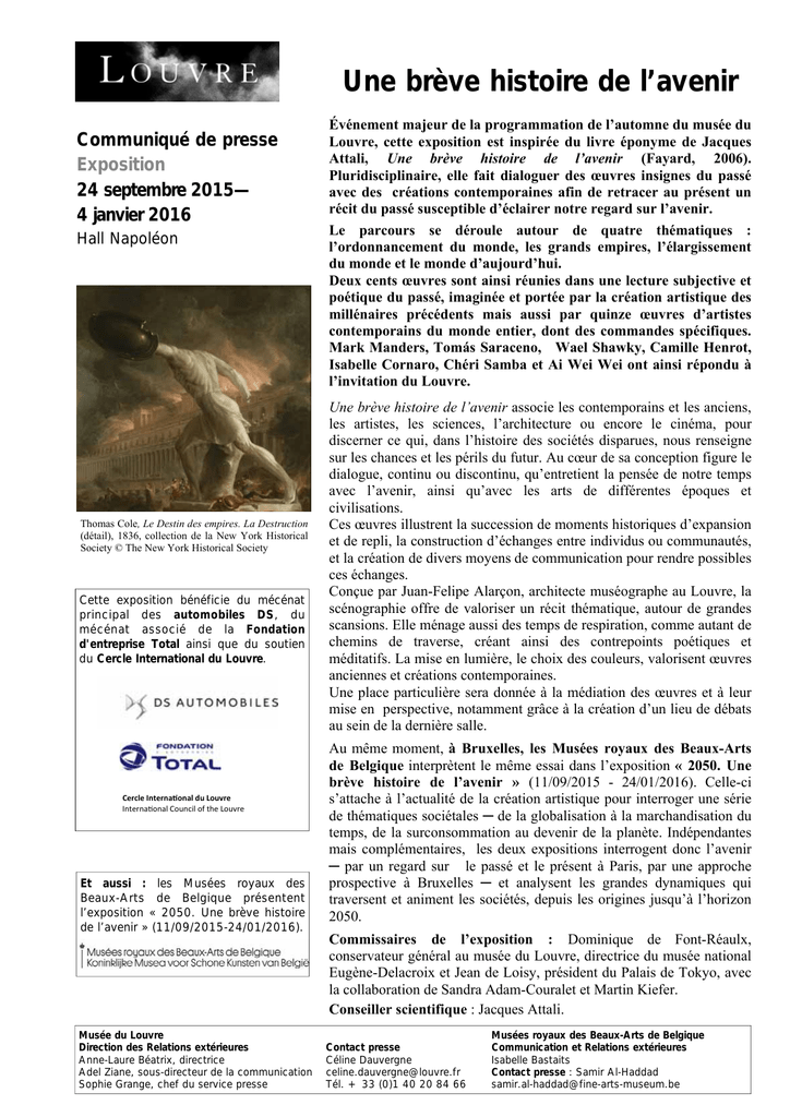 Une brève histoire de l’avenir Communiqué de presse Exposition 24 septembre 2015— 4 janvier 2016 Hall Napoléon Thomas Cole, Le Destin des empires. La Destruction (détail), 1836, collection de la New York Historical Society © The New York Historical Society Cette exposition bénéficie du mécénat principal des automobiles DS, du mécénat associé de la Fondation d'entreprise Total ainsi que du soutien du Cercle International du Louvre. Cercle InternaƟonal du Louvre InternaƟonal Council of the Louvre Et aussi : les Musées royaux des Beaux-Arts de Belgique présentent l’exposition « 2050. Une brève histoire de l’avenir » (11/09/2015-24/01/2016). Musée du Louvre Direction des Relations extérieures Anne-Laure Béatrix, directrice Adel Ziane, sous-directeur de la communication Sophie Grange, chef du service presse Événement majeur de la programmation de l’automne du musée du Louvre, cette exposition est inspirée du livre éponyme de Jacques Attali, Une brève histoire de l’avenir (Fayard, 2006). Pluridisciplinaire, elle fait dialoguer des œuvres insignes du passé avec des créations contemporaines afin de retracer au présent un récit du passé susceptible d’éclairer notre regard sur l’avenir. Le parcours se déroule autour de quatre thématiques : l’ordonnancement du monde, les grands empires, l’élargissement du monde et le monde d’aujourd’hui. Deux cents œuvres sont ainsi réunies dans une lecture subjective et poétique du passé, imaginée et portée par la création artistique des millénaires précédents mais aussi par quinze œuvres d’artistes contemporains du monde entier, dont des commandes spécifiques. Mark Manders, Tomás Saraceno, Wael Shawky, Camille Henrot, Isabelle Cornaro, Chéri Samba et Ai Wei Wei ont ainsi répondu à l’invitation du Louvre. Une brève histoire de l’avenir associe les contemporains et les anciens, les artistes, les sciences, l’architecture ou encore le cinéma, pour discerner ce qui, dans l’histoire des sociétés disparues, nous renseigne sur les chances et les périls du futur. Au cœur de sa conception figure le dialogue, continu ou discontinu, qu’entretient la pensée de notre temps avec l’avenir, ainsi qu’avec les arts de différentes époques et civilisations. Ces œuvres illustrent la succession de moments historiques d’expansion et de repli, la construction d’échanges entre individus ou communautés, et la création de divers moyens de communication pour rendre possibles ces échanges. Conçue par Juan-Felipe Alarçon, architecte muséographe au Louvre, la scénographie offre de valoriser un récit thématique, autour de grandes scansions. Elle ménage aussi des temps de respiration, comme autant de chemins de traverse, créant ainsi des contrepoints poétiques et méditatifs. La mise en lumière, le choix des couleurs, valorisent œuvres anciennes et créations contemporaines. Une place particulière sera donnée à la médiation des œuvres et à leur mise en perspective, notamment grâce à la création d’un lieu de débats au sein de la dernière salle. Au même moment, à Bruxelles, les Musées royaux des Beaux-Arts de Belgique interprètent le même essai dans l’exposition « 2050. Une brève histoire de l’avenir » (11/09/2015 - 24/01/2016). Celle-ci s’attache à l’actualité de la création artistique pour interroger une série de thématiques sociétales ─ de la globalisation à la marchandisation du temps, de la surconsommation au devenir de la planète. Indépendantes mais complémentaires, les deux expositions interrogent donc l’avenir ─ par un regard sur le passé et le présent à Paris, par une approche prospective à Bruxelles ─ et analysent les grandes dynamiques qui traversent et animent les sociétés, depuis les origines jusqu’à l’horizon 2050. Commissaires de l’exposition : Dominique de Font-Réaulx, conservateur général au musée du Louvre, directrice du musée national Eugène-Delacroix et Jean de Loisy, président du Palais de Tokyo, avec la collaboration de Sandra Adam-Couralet et Martin Kiefer. Conseiller scientifique : Jacques Attali. Contact presse Céline Dauvergne [email protected] Tél. + 33 (0)1 40 20 84 66 Musées royaux des Beaux-Arts de Belgique Communication et Relations extérieures Isabelle Bastaits Contact presse : Samir Al-Haddad [email protected] Publications Catalogue de l’exposition Une brève histoire de l’avenir Sous la direction de Dominique de FontRéaulx et Jean de Loisy, coédition Hazan / musée du Louvre éditions. 384 pages ; 310 images. isbn musée du Louvre : 978-2-35031519-5 isbn Hazan : 978-2-75410-853-9 Album de l’exposition Coédition Hazan / musée du Louvre éditions. Ces ouvrages sont réalisés avec le soutien d’Arjowiggins Graphic. Film documentaire L’art de prévoir l’avenir De Laurent Perreau, 52 min. Production ARTE France & A Prime Group. En association avec le musée du LouvreParis. En coproduction avec AT Production et RTBF - Unité Documentaire ( Belgique) Visites-conférences dans l’exposition Renseignements sur louvre.fr À noter : Regards croisés. Ces visites à deux voix avec des auteurs du catalogue offrent de poser un autre regard sur l'exposition. Les 7 et 21 octobre, les 4 et 25 novembre, les 11 et 18 décembre à 19h. Application téléchargeable Guide multimédia Sélection d'œuvres commentées par les commissaires de l'exposition. Musée du Louvre Informations pratiques Horaires Tous les jours de 9h à 17h30, sauf le mardi. Nocturne les mercredis et vendredis jusqu’à 21h30. Tarifs Tarif unique d’entrée au musée : 15 €. Gratuit pour les moins de 18 ans, les moins de 26 ans résidents de l’U.E., les enseignants titulaires du pass education, les demandeurs d’emploi, les adhérents des cartes Louvre familles, Louvre jeunes, Louvre professionnels et Amis du Louvre, ainsi que le premier dimanche des mois de septembre à mars. Renseignements : www.lou