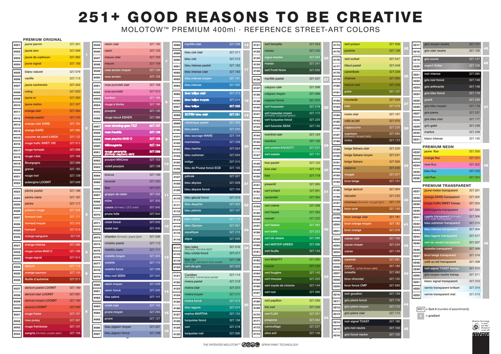 251 + GO OD REASONS TO BE CREATIVE MOL OTO W ™ PR EMIUM 400ml · R EF ER ENCE ST RE E T- A RT C O LO RS PREMIUM ORIGINAL #001 jaune jasmin 327.001 #045 raisin clair 327.192 #002 jaune zinc 327.006 #046 raisin 327.122 #003 jaune de cadmium 327.082 #047 mauve clair 327.193 #004 jaune signal 327.165 #048 mauve 327.109 #005 blanc naturel 327.079 #049 rose ancien moyen 327.194 #006 vanille 327.115 #050 rose ancien 327.129 #007 jaune cachemire 327.002 #051 rose porcelet clair #008 coing 327.003 #052 rose porcelet 327.012 #009 jaune or 327.083 #053 bonbon 327.195 #010 jaune melon #054 rouge à lèvres #011 orange clair #055 pourpre 1 327.007 327.084 #012 orange pastel 327.133 #013 orange clair DARE 327.184 #014 orange DARE #015 coucher de soleil LINDA 327.085 #056 2 327.132 #016 rouge trafic SWET 100 327.013 #017 rouge tornade 327.098 #018 rouge rubis #019 Bourgogne 327.086 #020 grenat 327.185 rouge foncé ESHER 327.168 327.196 327.089 rose chewing-gum TILT 327.197 #058 rose fuschia 327.136 #059 rose psycho MAD C 327.198 #060 télémagenta 327.164 #061 rouge amarante 327.099 #062 pourpre MACrew 327.166 #063 violet pourpre 327.138 #021 rouge noir 327.139 #064 #022 aubergine LOOMIT 327.046 #065 lavande pèche pastel 327.186 #066 lilas 327.201 #023 #067 grappe de raisin 327.202 pèche claire 327.187 #025 pèche 327.117 #026 poisson rouge 327.008 #027 homard clair 327.171 #028 homard moyen #029 #030 #031 #068 #069 mûre cassis (formerly: CES violet) 327.199 327.200 327.242 #071 violet foncé 327.043 homard 327.010 #072 violet noir 327.045 orange sanguine 327135 chardon (formerly: grape light) 327.036 327.088 #074 violette pastel 327.112 #075 violette claire 327.111 #076 violette moyen 327.205 rouge cerise MAD C 327.188 #033 rouge signal 327.014 #034 abricot 327.116 #035 orange saumon 327.134 #036 feuille d’automne 4 5 327.011 #037 abricot pastel LOOMIT 327.189 #038 abricot clair LOOMIT 327.081 #039 abricot moyen LOOMIT 327.190 #040 abricot LOOMIT 327.009 #077 violette 327.110 #078 violette foncé 327.206 #079 bleu nuit SEEN 327.041 #080 raisin moyen 327.039 #081 #082 6 raisin foncé lilas satiné 11 327.044 #073 #032 10 327.042 prune folle orange intense 9 327.203 #070 3 327.038 #131 vert tempête 327.053 #174 vert poison 327.059 bleu ciel clair 327.211 #132 roseau 327.240 #175 pomme 327.128 #090 bleu ciel 327.212 #133 aigue-marine 327.054 #176 vert sorbet #091 bleu intense pastel 327.163 #134 marais 327.241 #177 tilleul pastel #092 bleu intense clair 327.162 #135 vert Forêt Noire 327.055 #178 carambole 327.228 #093 bleu intense moyen 327.161 #136 myrtille pastel 327.037 #179 chanvre 327.050 #094 bleu intense 327.032 calypso clair 327.068 #180 haricot vert 327.229 #137 #095 bleu tulipe clair 327.213 327.069 #181 poire 327.157 #138 calypso moyen #096 bleu tulipe moyen 327.214 #139 calypso foncé 327.070 #182 moutarde 327.049 #097 bleu tulipe 327.033 #140 vert turquoise 327.219 #183 kaki 327.078 #098 SOTEN bleu clair 327.031 #141 vert turquoise moyen 327.172 #184 ivoire clair céramique pastel 327.029 #142 vert turquoise foncé 327.220 #099 #185 café au lait #143 vert futuriste SEAK 327.145 #100 327.153 krocus #024 8 myrtille clair #089 16 17 18 327.130 #057 (formerly: raspberry dark) 7 #088 327.040 12 13 14 violet clair 327.140 #084 prune moyen 327.204 327.127 #041 rouge fraise 327.191 #042 rose pussy 327.087 #085 prune #043 rouge framboise 327.137 #086 bleu pigeon moyen 327.207 #044 sangria (formerly: purple dark) 327.106 #087 bleu pigeon foncé 327.208 15 16 327.030 bleu sauvage WANE 327.154 #102 marineblau 327.209 #103 bleu marine 327.024 #104 bleu outremer 327.034 #105 indigo 327.210 #106 bleu de Prusse foncé ECB 327.105 #107 pétrole 327.027 #108 bleu abysse 327.028 #109 bleu abysse foncé 327.104 #110 bleu glacial foncé 327.019 #111 bleu dauphin 327.022 #112 bleu pétrole 327.107 #113 327.141 #083 #101 bleu jeans #114 bleu crème aquatique #116 algue 20 21 22 327.113 bleu Olympe #115 19 327.215 23 327.026 28 327.101 gris clair neutre 327.100 327.047 #219 gris souris 327.147 327.048 #220 argent Dollar 327.158 #221 noir intense 327.080 #222 gris noir foncé 327.149 #223 gris anthracite 327.148 #224 gris bleu foncé 327.179 #225 granit 327.236 #226 gris bleu moyen 327.178 327.167 #227 gris pierre 327.237 327.075 #228 gris bleu clair 327.177 #229 gris galet 327.238 327.235 327.094 #230 marbre 327.239 #231 blanc intense 327.160 menthol clair 327.124 #187 #145 menthol 327.123 #188 moka 327.173 #146 vert univers KACAO77 327.221 #189 beige Sahara clair 327.230 #147 vert salade 327.131 #190 beige Sahara moyen 327.231 #191 beige Sahara 327.005 #192 papyrus 327.232 #193 nougat 327.077 #194 brun beige 327.151 kiwi pastel 327.120 #149 kiwi clair 327.119 #150 kiwi 327.118 #151 pissenlit 327.060 #152 vert brillant 327.061 #153 sauterelle 327.064 #154 vert crème 327.058 #155 vert hippie 327.063 wasabi beige abricot 327.004 #196 labrador 327.233 #197 chameau (formerly: nougat light) 327.170 #198 brun ocre 327.150 327.222 #199 brun orange clair 327.181 #200 brun orange moyen 327.182 #201 brun orange 327.076 vert falaise 327.065 #158 vert trèfle 327.223 #160 vert de vessie vert MISTER GREEN (formerly: nougat dark) #195 #157 #159 29 30 31 32 327.066 #202 327.096 #203 cacao clair cacao moyen vert fluo 327.354 #236 327.303 327.305 #241 cassis transparent (formerly: 327.306 #242 bleu outremer transparent 327.315 #243 bleu intense transparent 327.304 327.169 #244 bleu lagune transparent 327.317 327.234 #245 vert de vessie transparent 327.307 #246 noisette transparent 327.309 #247 brun beige transparent 327.316 #248 café au lait transparent 327.308 #249 noir signal TOAST transp. 327.312 #250 gris moyen neutre transp. 327.311 #251 blanc signal transparent 327.310 #252 vernis transparent brillant 327.314 #253 vernis transparent mat 327.313 #204 cacao 327.126 #119 #162 327.062 #205 caramel 327.091 #120 vert-de-gris 327.023 #163 avocat 327.224 #206 noyer Caraïbes 327.114 #164 vert fougère 327.142 #207 noisett