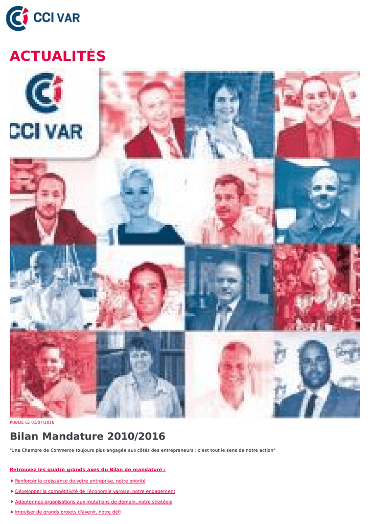 ACTUALITÉS PUBLIELE01/07/2016 BilanMandature2010/2016 "UneChambredeCommercetoujoursplusengagéeauxcôtésdesentrepreneurs:c’esttoutlesensdenotreaction" RetrouvezlesquatregrandsaxesduBilandemandature: Renforcerlacroissancedevotreentreprise,notrepriorité Développerlacompétitivitédel’économievaroise,notreengagement Adapternosorganisationsauxmutationsdedemain,notrestratégie Impulserdegrandsprojetsd'avenir,notredéfi Pourconsulterlebilandemandature2010/2016,vousavezlapossibilitédetéléchargerledocument(Pdf)maisaussidefeuilleteruneversionenligne. Àl’heureoùlaCCIduVarengagel’unedesesplusgrandesmutations,lePrésidentJacquesBianchiseprêteaujeudesquestionsréponsespourpréciserlesgrandsaxesdel’actionquiaétéconduitedurantces6dernièresannées. ÀquoisertuneChambredecommerceetd’industrie? JacquesBianchi:"LavocationpremièredelaChambredecommerceetd’industrieduVarc’estl’entrepriseetsesdirigeants.C’estpourquoinousavons misenplacesurtoutleterritoiredeséquipesd’élusetdecollaborateurscompétentsetdisponiblesafind’accompagnerl’entreprisetoutaulongdeson développementgrâceàunréseaudeproximité.Plusqu’unemission,notrepassionc’estaussidéfendrelesintérêtsdel’entrepriseetdesesdirigeants auprèsdesdécideurspublics.C’estaussinotreactionvolontaristepourdéfendrelaplaceduVarauseindelanouvelleChambredecommerceet d’industrieduVaràl’échellerégionale.C’estencoreprendrepositionsurlesdécisionsquiimpactentl’économielocale.Citonsparexemplel’actionpour lasuppressiondelataxedemouillageouencorelamobilisationenfaveurdumaintiendesétablissementsdeplagedePampelonne. Acteurmajeurdel’animationdutissuéconomique,laChambredecommerceetd’industrieduVarestaussiundécouvreurdetalents.Cestalents,nous lesmettonsenlumièrelorsd’événementstelsquelesTrophéesdel’éco,leStartupWeekend,lesspeedbusinessmeetings… Etpuis,àtraversdeséquipementsstructurantsquenotreChambredecommerceetd’industrieduVargère,nousparticiponsactivement aurayonnement,àl’attractivitéetàladynamisationduterritoire.C’estlecassurleplantouristiqueetmaritimedanslesmissionsqueportela Chambredecommerceetd’industrieduVarentantqueconcessionnairedesportsdecommerceetdeplaisance." Commentavez-vousréagiauxmutationsimposéesparlecontexteéconomique? JB:"Laperformanceestdevenueuneexigencedetouslesinstants,autantpourlesentreprisesquepourlefonctionnementdenotreInstitution publiquedel’État.Leséquipesinternessesontrapidementadaptées.Chacunaprissapartd’effortetaréagipositivement.Celas’esttraduitparune baissedelamassesalarialesansaucunlicenciement,unebaissevolontaristeetsensibledescharges,larecherchesystématiquedemutualisationde nosmoyensavecl’échelonrégional,lamiseenplaced’unenouvelleingénieriefinancière,etledéveloppementdepartenariatspublic/privé.Ettoutcela, sansquelacapacitédenotreChambredecommerceetd’industrieàsoutenirl’économieensoitpourautantaltérée.C’estenfinlesprogrèsquenous avonsréussiàaccomplirenmatièredegestionmalgrélecontexteéconomiqueetfinancierdifficileetquiontétésaluésparnosautoritésdetutelle etnotammentparlepréfetduVaràl’issuedesdifférentscontrôlesauxquelslaChambredecommerceetd’industrieduVaraétésoumise(URSSAF, fiscal,Chambrerégionaledescomptes)etquisontpournousunencouragementàcontinuerdanscettevoie. Etpuisnotreatoutmajeur,l’anticipation.NousnousapprêtionsàaffronterlaloiNOTReetlesréductionsderessourceetavonssufairelesbonschoix aubonmoment.IlfautdirequemonmandatàlaPrésidencedelaChambreRégionaledecommerceetd’industriePACACorsem’auraétébienutileen lamatière." Pouvez-vousnousrésumerenquelquesmotsvotreméthode? JB:"C’estavanttoutuneécouteattentiveduterrainetuneactiondeproximitédéployéesurtoutleterritoireafinderépondreauplusprèsdesattentes desentreprises.C’estaussiunegouvernancecollégiale,ouverte,participative,unespritd’équipeetlavolontéderéunirtouteslesentreprisesduVar sousunemêmebannièreafind’aboutirrapidementàunemarqueterritoriale.JamaislespartenariatsaveclesservicesdelaPréfecture,la MarineNationale,lesCommunes,lesCommunautésd’Agglomérations,leDépartement,laRégionetlesacteursdel’économien’ontétéaussiconfiants etfructueux." Quellessontlesactionsenfaveurdel’économielocalequifontvotrefierté? JB:"C’estd’abordlacapacitéàmobiliseravecnotreChambredecommerceetd’industrieetl’ensembledesacteurséconomiqueschaquefoisquele Varabesoindenousouquemalheureusementsapopulationousonéconomiesontensouffrance.Lestristesévénementsquenousavonsconnus aveclesinondationsetlacrisenousontamenésàdévelopperuneréactivitéetuneexpertisedansl’accompagnementd’urgence.Nousavonsaussi réussiàmobilisernosfondspropresdirectementpourlessinistrésouauprofitdefondsdesoutienouencoreceluidesTribunauxdecommerce.C’estla créationdansleVard’unestructureoriginaledepréventionetd’accompagnementdesdifficultésavecleRSI.C’estlaparticipationactivedelaChambre decommerceetd’industrieduVaraurenforcementdenotrevocationtouristique,notammentlesexcellentsrésultatsquenousenregistrons enmatièredecroisière,quipermetdecapitalisersurnotreouverturesurlamer.C’estl’actionquenousconduisonsenmatièredeformationdestinéeà permettreànosentreprisesdemonterencompétences,afindeleuroffrirtoutesleschancesderéussirleurmutationéconomiqueetleurtransition numérique. C’estlastratégievolontaristedontnotreChambredecommerces’estdotéeenmatièred’investissementsproductifsetquipermetaujourd’huide capitaliserentermesd’accueilsurnotrefoncierdisponible:zonesd’activitéséconomiquesetchartesdepartenariataveclesterritoires…C’estavoir réussiàporterhautetfortlavoixdesentreprisesautraversdelacréationduparlementvaroisdesentreprisesquiregroupeaujourd’hui500chefs d’entreprise,initiativequiconstitueunepremièreenFranceetquiaujourd’huiestentraind’êtrerepriseàl’échellenationale. NotreChambredecommerceetd’industrieestenquelquesannéesdevenueunevéritableentrepriseauservicedesentreprises,elleanimeunr