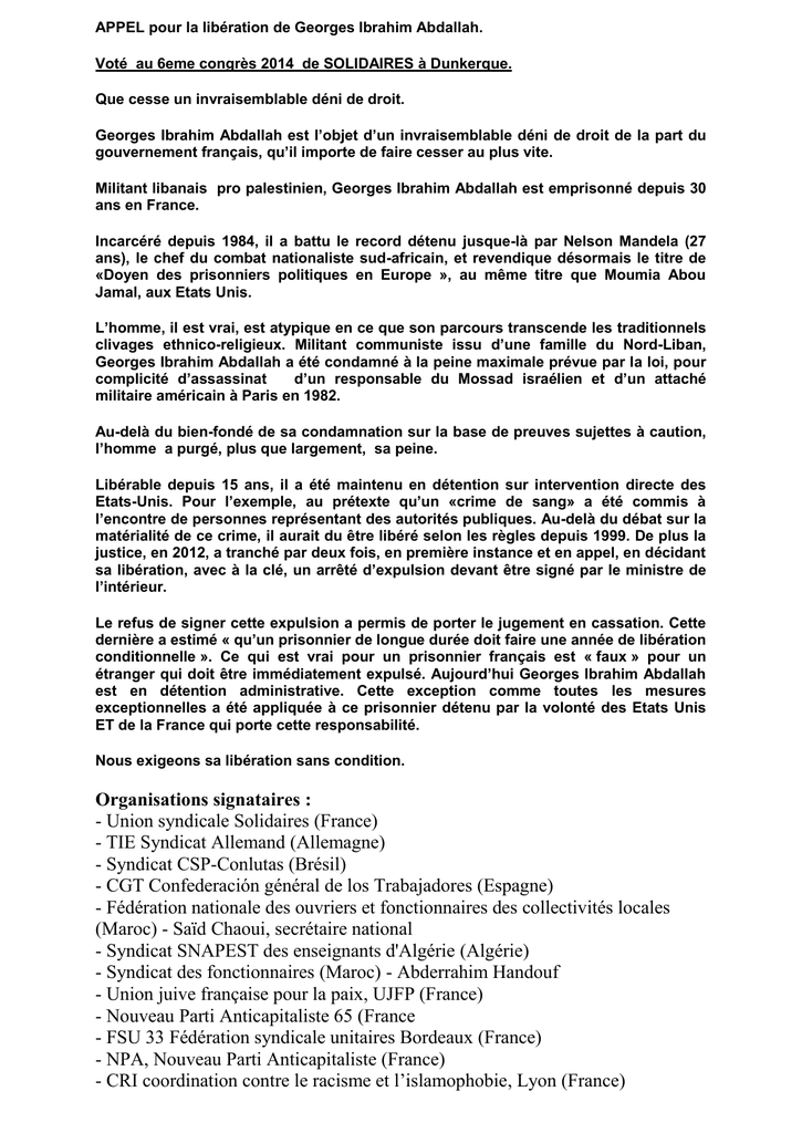 APPEL pour la libération de Georges Ibrahim Abdallah. Voté au 6eme congrès 2014 de SOLIDAIRES à Dunkerque. Que cesse un invraisemblable déni de droit. Georges Ibrahim Abdallah est l’objet d’un invraisemblable déni de droit de la part du gouvernement français, qu’il importe de faire cesser au plus vite. Militant libanais pro palestinien, Georges Ibrahim Abdallah est emprisonné depuis 30 ans en France. Incarcéré depuis 1984, il a battu le record détenu jusque-là par Nelson Mandela (27 ans), le chef du combat nationaliste sud-africain, et revendique désormais le titre de «Doyen des prisonniers politiques en Europe », au même titre que Moumia Abou Jamal, aux Etats Unis. L’homme, il est vrai, est atypique en ce que son parcours transcende les traditionnels clivages ethnico-religieux. Militant communiste issu d’une famille du Nord-Liban, Georges Ibrahim Abdallah a été condamné à la peine maximale prévue par la loi, pour complicité d’assassinat d’un responsable du Mossad israélien et d’un attaché militaire américain à Paris en 1982. Au-delà du bien-fondé de sa condamnation sur la base de preuves sujettes à caution, l’homme a purgé, plus que largement, sa peine. Libérable depuis 15 ans, il a été maintenu en détention sur intervention directe des Etats-Unis. Pour l’exemple, au prétexte qu’un «crime de sang» a été commis à l’encontre de personnes représentant des autorités publiques. Au-delà du débat sur la matérialité de ce crime, il aurait du être libéré selon les règles depuis 1999. De plus la justice, en 2012, a tranché par deux fois, en première instance et en appel, en décidant sa libération, avec à la clé, un arrêté d’expulsion devant être signé par le ministre de l’intérieur. Le refus de signer cette expulsion a permis de porter le jugement en cassation. Cette dernière a estimé « qu’un prisonnier de longue durée doit faire une année de libération conditionnelle ». Ce qui est vrai pour un prisonnier français est « faux » pour un étranger qui doit être immédiatement expulsé. Aujourd’hui Georges Ibrahim Abdallah est en détention administrative. Cette exception comme toutes les mesures exceptionnelles a été appliquée à ce prisonnier détenu par la volonté des Etats Unis ET de la France qui porte cette responsabilité. Nous exigeons sa libération sans condition. Organisations signataires : - Union syndicale Solidaires (France) - TIE Syndicat Allemand (Allemagne) - Syndicat CSP-Conlutas (Brésil) - CGT Confederación général de los Trabajadores (Espagne) - Fédération nationale des ouvriers et fonctionnaires des collectivités locales (Maroc) - Saïd Chaoui, secrétaire national - Syndicat SNAPEST des enseignants d'Algérie (Algérie) - Syndicat des fonctionnaires (Maroc) - Abderrahim Handouf - Union juive française pour la paix, UJFP (France) - Nouveau Parti Anticapitaliste 65 (France - FSU 33 Fédération syndicale unitaires Bordeaux (France) - NPA, Nouveau Parti Anticapitaliste (France) - CRI coordination contre le racisme et l’islamophobie, Lyon (France) - Emilio Gonzales Larrea, programma de Radio Estirpe Nacional « Cultural desde el pie » San Justo, La Matanza Buenos Aires (Argentine) - Cinéma Utopia Bordeaux - Cinéma Utopia Toulouse - Cinéma Utopia Tournefeuille 31 - AC-Gironde, Agir Ensemble contre le chômage, (France) - Alternative libertaire Paris (France) - Fédération des organismes palestiniens, Buenos Aires (Argentine) - UGTT, Union Générale Tunisienne Du Travail (Tunisie) - AFPS Association France Palestine Solidarité, Lyon (France) - Collectif Anticolonial, Sortir du colonialisme (France) - Mouvement « Appel à la libération nationale et sociale (Argentine) - Groupe Martin Fierro, Varela (Argentine) - Groupe Martin Fierro, Mar Del Plata (Argentine) - Groupe Martin Fierro, Neuquen (Argentine) - Groupement politique et syndical, Tolo Arce, (Argentine) - Centro cultural « Alejandro Olmos », Villa Luro (Argentine) - Mouvement « Appel populaire pour un projet national démocratique en Amérique Latine, Almirante Brown (Argentine) - Mouvement « Appel populaire pour un projet national démocratique en Amérique Latine, San Justo (Argentine) - Mouvement « Appel populaire pour un projet national démocratique en Amérique Latine, Buenos Aires (Argentine) - Mouvement « Appel de la communauté paysanne Tartagal », Salta (Argentine) - Bibliothèque Populaire Fernando Jara, Cipoletti, Rio negro (Argentine) - Collectif « ojos para la paz » Madrid (Espagne) - Plateforme globale contre les guerres, Madrid (Espagne) - Comité des parents et des amis de Georges Ibrahim Abdallah, Beyrouth (Liban) - AFPS –PAU l’assemblée Générale a voté la signature (France) - Libertat Béarn, Pau (France) - Parti De Gauche, Paris (France) - L’Orchestre Poétique d’Avant-guerre, associations d’artistes de Bordeaux (France) - Collectif Palestine 65 – Afps, Tarbes (France) - ATTAC. France - Union Départementale CGT, Gironde (France) - Confédération Paysanne 33. - AFPS national, Paris (France) - Collectif 69 Palestine, Lyon (France) - Parti de Gauche, Rhône (France) - La ligue des droits de l’homme, Gironde 33 (France) - AFPS 63 Clermont-Ferrand, (France) Citoyens et membres d’associations : A - Jose Angel Aramendi, Bilbao (Espagne) - Philippe Arnaud Informaticien syndicaliste Sud PTT et membre de Solidaires 33 Bordeaux (France) - Samuel Autexier, Graphiste, Forcalquier (France) - Clémentine Autain, Parti Ensemble, Sevran (France) - Gilbert Achcar, Enseignant Universitaire, Londres (Royaume-Uni) - Sylvette Amestoy, EELV Adjointe au Maire de Courdimanche 95 (France) - Mohmed Ali Amdouni, SG, Syndicat général des agents de Justice (Tunisie) - Thabet Abdeljalil, Gabès (Tunisie) - Sandra Aimard, Bordeaux (France) - Chaambi Abdelaziz, militant associatif (France) - Marie Carmen Audren Pau 64 (France) - Valéry Arramun Pau (France) - Thérèse Auccecia , Resp