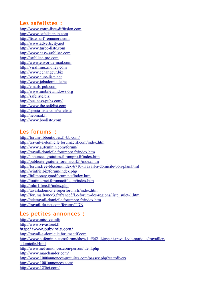 Les safelistes : http://www.votre-liste-diffusion.com http://www.safelistepub.com http://liste.surf-remunere.com http://www.advertscity.net http://www.turbo-liste.com http://www.easy-safeliste.com http://safeliste-pro.com http://www.envoi-de-mail.com http://viralf.muxmoney.com http://www.echangeur.biz http://www.euro-liste.net http://www.jobadomicile.be http://emails-pub.com http://www.mobilewindows.org http://safeliste.biz http://business-pubs.com/ http://www.the-safelist.com http://specia-liste.com/safeliste http://neomail.fr http://www.booliste.com Les forums : http://forum-fbboutiques.fr-bb.com/ http://travail-a-domicile.forumactif.com/index.htm http://www.aufeminin.com/forum/ http://travail-domicile.forumpro.fr/index.htm http://annonces-gratuites.forumpro.fr/index.htm http://publicite-gratuite.forumactif.fr/index.htm http://forum.free-bb.com/index-6710-Travail-a-domicile-bon-plan.html http://winfric.biz/forum/index.php http://fullmoney.goodforum.net/index.htm http://toutinternet.forumactif.com/index.htm http://mlm1.free.fr/index.php http://tavailadomicile.superforum.fr/index.htm http://forums.france3.fr/france3/Le-forum-des-regions/liste_sujet-1.htm http://teletravail-domicile.forumpro.fr/index.htm http://travail-du-net.com/forums/TDN Les petites annonces : http://www.missive.info http://www.vivastreet.fr http://www.pubvirale.com/ http://travail-a-domicile.forumactif.com http://www.aufeminin.com/forum/show1_f542_1/argent-travail-vie-pratique/travailleradomicile.Html http://www.net-annonces.com/person/ident.php http://www.marchander.com/ http://www.1000annonces-gratuites.com/passez.php?cat=divers http://www.1001annonces.com/ http://www.123ici.com/ http://www.clubsoleil.net/annonces/saisie.php http://www.clubsoleil.net/forum/ http://www.web-argent.net/forum/repondre.php http://www.ptitesannonces.com/ http://www.quickannonces.com/ajout.php http://www.village-business.com/annonces.php http://www.ajf.net/inscrire.php http://www.associanet.com/annonces/ajout_annonce.php3 http://www.citytoo.com/ http://osnd.free.fr/annonces/annonce_form.php http://www.100pour100annonces.fr/annonce_addjob_etp1.asp http://www.annoncesgratuites.info/ http://annonces.gulliver.com/ http://www.les-petites-annonces-gratuites.com/register.php http://www.tempslibre.ch/ http://www.ici-gratuit.com/ http://www.lerdv.com/index.php http://www.marche.fr/ http://www.netannonces.net/ http://www.i-services.net/ http://www.dejavu.ca/ http://www.coffre-aux-annonces.com/ http://pagesperso-orange.fr/piero.hmc/VIVA.htm http://www.123ici.com/ http://www.g-trouve.com/ http://www.annonz.ch/ http://www.savoir.ch/ http://www.troconet.net/ http://annonces.fr-ch.net/ http://www.annonces-services.annonces.com/ http://www.tuvends.com/ http://www.annoncevite.com/ http://www.reunion-annonces.fr/ http://www.bulgarie-bg.com/annonces.php http://www.annoncesclassifieds.com/ http://www.annonces100x100.com/-9_Canada/ http://www.annoncesavec.com/ http://www.toutypasse.com/ http://www.passetonannonce.com/ http://www.banguiweb.com/petites_annonces_gratuites.html http://www.beauceannonces.com/beauce-annonces/index.php http://www.canadapac.com/canada-pac/index.php http://www.canada-annonces.com/ http://www.belgique-annonces.com/ http://www.annonces-rapides.com/ http://www.1000-annonces.com/ http://www.annonces-gratuites.be/ http://www.trentesecondes.com/index.php http://www.annonces-gratuites-francophones.com/ http://www.annonce-gratuite-europe.com/ http://www.mon-annonce-gratuite.com/ http://www.mes-annonces-gratuites.com/ http://www.hyperannonces.com/ http://www.annonces-paris.com/ http://www.7annonces.com/ http://www.j-annonce-gratuit.org/index.php http://www.amaneo.ch/ http://www.lespuces.com/ http://www.lili.be/ http://www.adfinder.be/ http://www.trefle.com/ http://www.belles-annonces.net/classifieds/index.php http://www.libre-annonce.com/ http://www.toutquebec.com/classees/index.php http://fr.advisto.com/ http://www.annonces.com/ http://www.lespac.com/ http://www.dejavuca.com/ http://www.vendupar.com/ http://www.annoncespaca.com/ http://paris.kijiji.fr/ http://www.toutannonces.com/index.php http://www.annonces-lyoba.ch/ http://www.normandnet.fr/ http://www.cyberbougnat.net/ http://www.mutuannonces.com http://webannonce.free.fr/ http://www.ptitesannonces.ch/ http://www.okazoo.com/ http://www.emploi-stage-job.com/ http://www.est-annonces.com/ http://www.eucalyptech.com/ http://www.misterannonces.com/ http://www.g-trouve.com/ http://www.123cgratos.com/ http://www.cybergratuit.com/ http://www.lannonce.com/ http://www.logassist.com/ http://www.toulouseweb.com/ http://www.akiway.com/ http://www.netmalin.fr http://www.artgora.org/ http://www.petites-annonces-vosgiennes.com/ http://www.planetebesancon.com/ http://www.trouveztout.com/ http://www.whoolala.net/ http://www.swissone.com/ http://www.regart.ch/ http://www.promosono.com/ http://www.aveyron-annonces.com/ http://www.direct-go.com/ http://www.annoncenet.fr/ http://www.jdpro.net/ http://www.vendeen.net/ http://www.annonces.net/ Les annuaires : http://www.ppcannu.com/ http://www.1annuaire.com/ http://fbboutiques.1annuaire.com/ http://www.lecoqfute.com/ http://www.ilyaka.com/ http://www.onestla.com/ http://www.annuduweb.fr/ http://www.kalooo.com/ http://sebyin.free.fr/ http://www.bulgarie-bg.com/index.php http://www.chasta.com/annuaire/ http://www.chasta.com/annuaire/ http://www.annuaire1deplus.com/ http://accespoint.online.fr/ http://www.la-bourse.org/ http://www.sorecson.com/annuaire/ http://www.01ref.com/ http://www.pagure.com/ http://webdir.parisexcursions.fr/ http://www.annuaire-marques-blanches.eu/ http://www.argents-facile.com/annuaire/ http://annuaire.eannu.fr/ http://www.referlinks.info/ http://annuaire.campomoro-corse.com/ http://www.emarevacrea.com/annuaire/index.php http://www.amour-du-web.com/ http://www.annuairemagique.tonsite.biz/ http://01-annuaire-liens-durs.com/ http://www.lbb.org/ http://www.chasta.com/annuaire/ http://www.hebdotop.com/ http://www.poossin.com/ http://www.ravecrow.