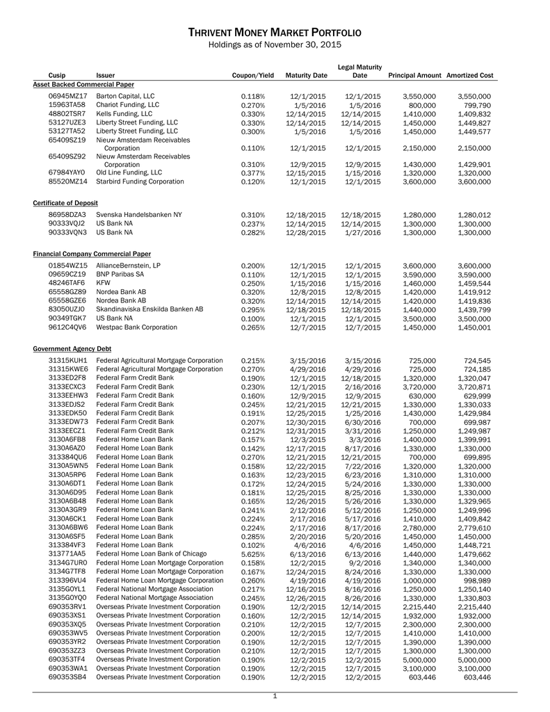 THRIVENT MONEY MARKET PORTFOLIO Holdings as of November 30, 2015 Cusip Issuer Asset Backed Commercial Paper 06945MZ17 15963TA58 48802TSR7 53127UZE3 53127TA52 65409SZ19 65409SZ92 67984YAY0 85520MZ14 Barton Capital, LLC Chariot Funding, LLC Kells Funding, LLC Liberty Street Funding, LLC Liberty Street Funding, LLC Nieuw Amsterdam Receivables Corporation Nieuw Amsterdam Receivables Corporation Old Line Funding, LLC Starbird Funding Corporation Legal Maturity Date Principal Amount Amortized Cost Coupon/Yield Maturity Date 0.118% 0.270% 0.330% 0.330% 0.300% 12/1/2015 1/5/2016 12/14/2015 12/14/2015 1/5/2016 12/1/2015 1/5/2016 12/14/2015 12/14/2015 1/5/2016 3,550,000 800,000 1,410,000 1,450,000 1,450,000 3,550,000 799,790 1,409,832 1,449,827 1,449,577 0.110% 12/1/2015 12/1/2015 2,150,000 2,150,000 0.310% 0.377% 0.120% 12/9/2015 12/15/2015 12/1/2015 12/9/2015 1/15/2016 12/1/2015 1,430,000 1,320,000 3,600,000 1,429,901 1,320,000 3,600,000 0.310% 0.237% 0.282% 12/18/2015 12/14/2015 12/28/2015 12/18/2015 12/14/2015 1/27/2016 1,280,000 1,300,000 1,300,000 1,280,012 1,300,000 1,300,000 0.200% 0.110% 0.250% 0.320% 0.320% 0.295% 0.100% 0.265% 12/1/2015 12/1/2015 1/15/2016 12/8/2015 12/14/2015 12/18/2015 12/1/2015 12/7/2015 12/1/2015 12/1/2015 1/15/2016 12/8/2015 12/14/2015 12/18/2015 12/1/2015 12/7/2015 3,600,000 3,590,000 1,460,000 1,420,000 1,420,000 1,440,000 3,500,000 1,450,000 3,600,000 3,590,000 1,459,544 1,419,912 1,419,836 1,439,799 3,500,000 1,450,001 0.215% 0.270% 0.190% 0.230% 0.160% 0.245% 0.191% 0.207% 0.212% 0.157% 0.142% 0.270% 0.158% 0.163% 0.172% 0.181% 0.165% 0.241% 0.224% 0.224% 0.285% 0.102% 5.625% 0.158% 0.167% 0.260% 0.217% 0.245% 0.190% 0.160% 0.210% 0.200% 0.190% 0.210% 0.190% 0.190% 0.190% 3/15/2016 4/29/2016 12/1/2015 12/1/2015 12/9/2015 12/21/2015 12/25/2015 12/30/2015 12/31/2015 12/3/2015 12/17/2015 12/21/2015 12/22/2015 12/23/2015 12/24/2015 12/25/2015 12/26/2015 2/12/2016 2/17/2016 2/17/2016 2/20/2016 4/6/2016 6/13/2016 12/2/2015 12/24/2015 4/19/2016 12/16/2015 12/26/2015 12/2/2015 12/2/2015 12/2/2015 12/2/2015 12/2/2015 12/2/2015 12/2/2015 12/2/2015 12/2/2015 3/15/2016 4/29/2016 12/18/2015 2/16/2016 12/9/2015 12/21/2015 1/25/2016 6/30/2016 3/31/2016 3/3/2016 8/17/2016 12/21/2015 7/22/2016 6/23/2016 5/24/2016 8/25/2016 5/26/2016 5/12/2016 5/17/2016 8/17/2016 5/20/2016 4/6/2016 6/13/2016 9/2/2016 8/24/2016 4/19/2016 8/16/2016 8/26/2016 12/14/2015 12/14/2015 12/7/2015 12/7/2015 12/7/2015 12/7/2015 12/2/2015 12/7/2015 12/2/2015 725,000 725,000 1,320,000 3,720,000 630,000 1,330,000 1,430,000 700,000 1,250,000 1,400,000 1,330,000 700,000 1,320,000 1,310,000 1,330,000 1,330,000 1,330,000 1,250,000 1,410,000 2,780,000 1,450,000 1,450,000 1,440,000 1,340,000 1,330,000 1,000,000 1,250,000 1,330,000 2,215,440 1,932,000 2,300,000 1,410,000 1,390,000 1,300,000 5,000,000 3,100,000 603,446 724,545 724,185 1,320,047 3,720,871 629,999 1,330,033 1,429,984 699,987 1,249,987 1,399,991 1,330,000 699,895 1,320,000 1,310,000 1,330,000 1,330,000 1,329,965 1,249,996 1,409,842 2,779,610 1,450,000 1,448,721 1,479,662 1,340,000 1,330,000 998,989 1,250,140 1,330,803 2,215,440 1,932,000 2,300,000 1,410,000 1,390,000 1,300,000 5,000,000 3,100,000 603,446 Certificate of Deposit 86958DZA3 90333VQJ2 90333VQN3 Svenska Handelsbanken NY US Bank NA US Bank NA Financial Company Commercial Paper 01854WZ15 09659CZ19 48246TAF6 65558GZ89 65558GZE6 83050UZJ0 90349TGK7 9612C4QV6 AllianceBernstein, LP BNP Paribas SA KFW Nordea Bank AB Nordea Bank AB Skandinaviska Enskilda Banken AB US Bank NA Westpac Bank Corporation Government Agency Debt 31315KUH1 31315KWE6 3133ED2F8 3133ECXC3 3133EEHW3 3133EDJS2 3133EDK50 3133EDW73 3133EECZ1 3130A6FB8 3130A6AZ0 313384QU6 3130A5WN5 3130A5RP6 3130A6DT1 3130A6D95 3130A6B48 3130A3GR9 3130A6CK1 3130A6BW6 3130A6SF5 313384VF3 313771AA5 3134G7UR0 3134G7TF8 313396VU4 3135G0YL1 3135G0YQ0 690353RV1 690353XS1 690353XQ5 690353WV5 690353YR2 690353ZZ3 690353TF4 690353WA1 690353SB4 Federal Agricultural Mortgage Corporation Federal Agricultural Mortgage Corporation Federal Farm Credit Bank Federal Farm Credit Bank Federal Farm Credit Bank Federal Farm Credit Bank Federal Farm Credit Bank Federal Farm Credit Bank Federal Farm Credit Bank Federal Home Loan Bank Federal Home Loan Bank Federal Home Loan Bank Federal Home Loan Bank Federal Home Loan Bank Federal Home Loan Bank Federal Home Loan Bank Federal Home Loan Bank Federal Home Loan Bank Federal Home Loan Bank Federal Home Loan Bank Federal Home Loan Bank Federal Home Loan Bank Federal Home Loan Bank of Chicago Federal Home Loan Mortgage Corporation Federal Home Loan Mortgage Corporation Federal Home Loan Mortgage Corporation Federal National Mortgage Association Federal National Mortgage Association Overseas Private Investment Corporation Overseas Private Investment Corporation Overseas Private Investment Corporation Overseas Private Investment Corporation Overseas Private Investment Corporation Overseas Private Investment Corporation Overseas Private Investment Corporation Overseas Private Investment Corporation Overseas Private Investment Corporation 1 THRIVENT MONEY MARKET PORTFOLIO Holdings as of November 30, 2015 Cusip Issuer Government Agency Debt - continued 690353VV6 690353A72 690353RL3 690353QZ3 690353D46 690353TD9 690353E45 690353E86 690353VM6 690353F51 690353G92 690353J99 Legal Maturity Date Principal Amount Amortized Cost Coupon/Yield Maturity Date 0.190% 0.190% 0.190% 0.190% 0.450% 0.410% 0.610% 0.510% 0.500% 0.520% 0.550% 0.870% 12/2/2015 12/2/2015 12/2/2015 12/2/2015 12/10/2015 12/22/2015 3/17/2016 4/30/2016 4/30/2016 5/2/2016 7/7/2016 11/18/2016 12/7/2015 12/7/2015 12/7/2015 12/2/2015 12/10/2015 12/22/2015 3/17/2016 4/30/2016 4/30/2016 5/2/2016 7/7/2016 11/18/2016 4,280,000 2,100,000 2,684,210 2,326,316 800,000 569,081 1,250,000 1,260,000 1,000,000 1,260,000 1,310,000 2,550,000 4,280,000 2,100,000 2,684,211 2,326,316 803,515 574,870 1,255,399 1,263,771 1,046,697 1,263,788 1,312,893 2,550,786 0.110% 12/1/2015 12/7/2015 8,000 8,00