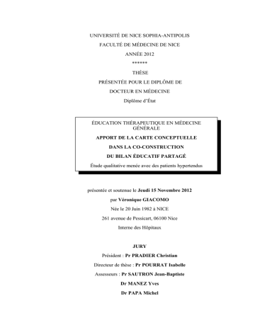 UNIVERSITÉ DE NICE SOPHIA-ANTIPOLIS FACULTÉ DE MÉDECINE DE NICE ANNÉE 2012 ****** THÈSE PRÉSENTÉE POUR LE DIPLÔME DE DOCTEUR EN MÉDECINE Diplôme d’État ÉDUCATION THÉRAPEUTIQUE EN MÉDECINE GÉNÉRALE APPORT DE LA CARTE CONCEPTUELLE DANS LA CO-CONSTRUCTION DU BILAN ÉDUCATIF PARTAGÉ Étude qualitative menée avec des patients hypertendus présentée et soutenue le Jeudi 15 Novembre 2012 par Véronique GIACOMO Née le 20 Juin 1982 à NICE 261 avenue de Pessicart, 06100 Nice Interne des Hôpitaux JURY Président : Pr PRADIER Christian Directeur de thèse : Pr POURRAT Isabelle Assesseurs : Pr SAUTRON Jean-Baptiste Dr MANEZ Yves Dr PAPA Michel TABLE DES MATIÈRES INTRODUCTION.................................................................................................1 I. Le contexte......................................................................................................3 1. Explication du choix de l'hypertension artérielle (HTA)............................3 2. A propos de l'observance............................................................................5 3. L'apport de l'éducation thérapeutique du patient........................................5 II. La problématique ........................................................................................6 1. L'Education Thérapeutique en Médecine Générale....................................6 2. La carte conceptuelle (CC).........................................................................8 3. La question de recherche............................................................................9 DÉFINITION DU CADRE DE LA RECHERCHE.........................................10 I. De l’observance à l’ETP..............................................................................11 1. L'observance.............................................................................................11 a) Définition......................................................................................................11 b) Difficultés d'évaluation ................................................................................12 c) Déterminants de l'observance .......................................................................13 d) Les modèles comportementaux de l'observance............................................14 2. ETP...........................................................................................................15 a) Définition de l’ETP.......................................................................................15 b) Le diagnostic éducatif ou bilan éducatif partagé...........................................19 c) Qu'en est-il en médecine générale ? .............................................................20 II. Choix de l'outil de recueil des besoins......................................................22 1. Définition de la carte conceptuelle...........................................................22 2. La CC en ETP...........................................................................................22 a) Modalités d’utilisation..................................................................................22 b) Etudes menées sur la CC...............................................................................23 3. Justification du choix de l'outil.................................................................25 PHASE EXPLORATOIRE................................................................................28 I. Objectif initial...............................................................................................29 II. Mise en place des conditions de l’expérimentation.................................29 III. Expérimentation et collecte des données................................................30 IV. Analyse des données..................................................................................32 V. Propositions d’amélioration ......................................................................34 MÉTHODOLOGIE............................................................................................36 I. Nouveaux objectifs.......................................................................................37 II. Choix méthodologique...............................................................................37 III. Population..................................................................................................38 IV. Nouveau mode d’emploi...........................................................................38 RÉSULTATS ET ANALYSE.............................................................................40 I. Résultats et analyse de chaque entretien...................................................41 1. Monsieur BE ............................................................................................41 2. Madame TO .............................................................................................42 3. Madame SG..............................................................................................43 4. Monsieur FA.............................................................................................44 5. Monsieur ME............................................................................................46 6. Monsieur MU............................................................................................47 7. Madame FE...............................................................................................49 II. Synthèse des résultats.................................................................................51 1. La CC permet l'expression du vécu de la maladie....................................51 a) Les éléments de vie mis en cause dans l'apparition de la maladie et la réaction à l'annonce du diagnostic................................................................................51 b) Les symptômes de l'HTA...................