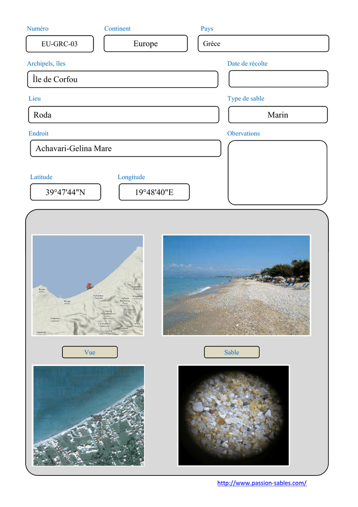 Numéro Continent Pays Europe EU-GRC-03 Archipels, îles Grèce Date de récolte Île de Corfou Lieu Type de sable Roda Marin Endroit Obervations Achavari-Gelina Mare Latitude Longitude 39°47'44"N 19°48'40"E Carte Photo Vue Sable http://www.passion-sables.com/