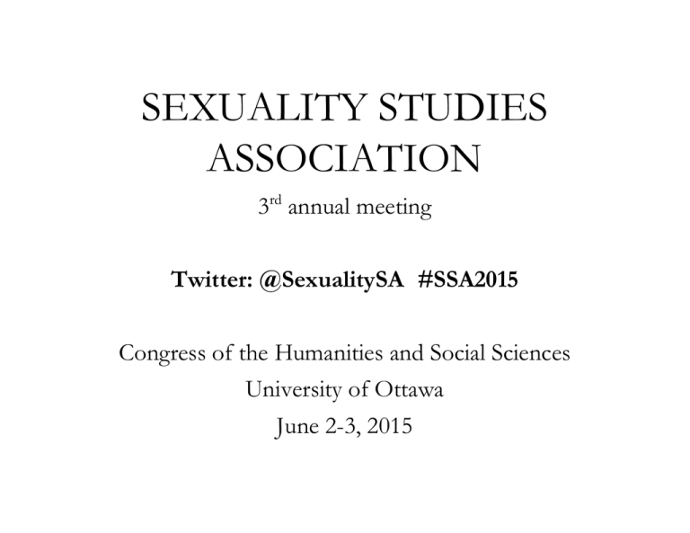SEXUALITY STUDIES ASSOCIATION 3rd annual meeting Twitter: @SexualitySA #SSA2015 Congress of the Humanities and Social Sciences University of Ottawa June 2-3, 2015 Announcements JUNE 2nd / TBD [Building/Room #] Inaugural meeting, Sexuality Studies programming chairs JUNE 2nd / 3:30 – 5:30 Lamoureux (LMX) 122 « A Dialogue About Cure » Eli Clare Canadian Disability Studies Association, Women’s and Gender Studies et Recherches Féministes (WGSRF), Sexuality Studies Association JUNE 3rd / 5:00pm-7:30pm Reception Tent (next to 90U) Presidents Reception Info: One drink ticket and refreshments provided Social Events TBA ANNOUNCEMENTS|1 Announcements JUNE 3rd / 11:00 – 12:15 MORISSET MRT/218 Keynote Address Trans* Performance Ethnography: Queer Bathroom Stories as Case Study Dr. Sheila L. Cavanagh Associate Professor, York University This keynote uses trans* performance ethnography to stage emotion and affect in Queer Bathroom Stories the play. The performance ethnography involves the dramatic staging of trans life-stories for audiences in an arts-based dramatic forum. The play prompts us to consider questions about transrepresentation, art-based cultural politics and audience reception. Sheila L. Cavanagh is an Associate Professor in Sociology & former Sexuality Studies Coordinator at York University. Her research is in the area of gender and sexuality with a concentration on queer, cultural, and psychoanalytic theories. Cavanagh recently co-edited a collection with Angela Failler and Rachel A. J. Hurst titled Skin, Culture and Psychoanalysis (2013) published by Palgrave Macmillan. Her first sole-authored book titled Sexing the Teacher: School Sex Scandals and Queer Pedagogies (UBC, 2007) was given honorable mention by the Canadian Women's Studies Association. Her second sole-authored book titled Queering Bathrooms (UTP, 2010) is a GLBT Indie Book Award finalist and recipient of the CWSA/ACEF Outstanding Scholarship Prize Honourable Mention (2012). Her performed ethnography titled Queer Bathroom Stories premiered at Buddies in Bad Times Theatre in Toronto, Canada (2014). She has published in a wide range of international refereed journals and writing a book on hysteria and transsexuality in Lacanian psychoanalysis. ANNOUNCEMENTS|2 DAY ONE / JUNE 2nd / 9:15 – 10:45 KING EDWARD KED/B005 KING EDWARD KED/B004 KING EDWARD KED/B015 Queer Theory and Affective Desires Chair: Ricky Varghese Sexual Liberation in Ontario in the 1970s Chair: Amar Wahab Bodies and Sexual Relationships Chair: Half Full or Full of Shit? Still Searching For A Queer Optimism Gary Lee Pelletier (York University) “Learning Together:” The University and Lesbian and Gay Activism in Ontario, 1970-1974 Carly Simpson (York University) Does Breastfeeding Impact on Couples’ Sexuality? Pascale de Montigny Gauthier (Université du Québec en Outaouais) Asexual Attractions: on Speaking Sex Slantwire and Turning Away Ela Przybylo (York University) “Not Homosexuality but Human Dignity”: The John Damien Case and the Politics of Gay Liberation in the 1970s Mathieu Brûlé (York University) Examining Relationship Quality across Three Types of Relationship Agreements Léa Séguin (Université du Québec à Montréal) Orgasm in the Biopolitical Imaginary: Capitalizing on Sex Mary Bunch (University of Toronto) “You Asshole!”: The Truth of Jerkoff Porn/Art Thomas Waugh (Concordia University) “A principled alliance”: Lesbians, Gay Bathhouses, and the Right to Privacy Committee in Toronto, 1979-1982 Tom Hooper (York University) Champ matrimonial/sexuel et handicap : une approche sociologique Pierre Brasseur (University Lille 1 (Clersé) and University Lille 3 (CeRIES)) DAY ONE|3 DAY ONE / JUNE 2nd / 11:00 – 12:15 KING EDWARD KED/B005 KING EDWARD KED/B004 KING EDWARD KED/B015 Queer Theories and Affective Methods Governing Reproduction Chair: Natalie Kouri-Towe Reading Montréal’s Forgotten, Emergent and relational LGBTQ Spaces Chair: Queer feelings? Queer method. Towards a theory of practice-based affective research Naomi de Szegheo-Lang (York University) Montréal Lesbian and Gay Bars of the 1970s as Gendered and Sexual Chronotopes Julianne Pidduck (Université de Montréal) The Heart and the Other Parts: On Gender Non Conforming Children and the Act of Seeing, Being Seen and Being Taught to See Jake Pyne (McMaster University) The Dyke Right to the City? Montréal’s 2012 Radical Dyke March in Time and Space Julie Podmore (John Abbott College; Concordia University) “Our body is made for reproduction”: science and technology high school teachers’ conceptions about sexuality education Guillaume Cyr (Université du Québec à Montréal) Queer ‘Youth’, Spatial Margins and the Engine of the Gay Village Economy Bruno Laprade (Université du Québec à Montréal) Chair: Chris Barcelos Exceptions, Deceptions: The Circulation of Leilani Muir and the Perpetuation of Eugenic Logic Samantha Balzer (University of Alberta) Reproductive Technologies, Liberating and Eugenic: The Selection Against Intersex Traits Celeste Elizabeth Orr (University of Ottawa) DAY ONE / JUNE 2nd / 12:15 – 1:30 / LUNCH KING EDWARD KED/B005 Film screening Pride Denied: Homonationalism and the Future of Queer Politics Kami Chisholm (York University) DAY ONE|4 DAY ONE / JUNE 2nd / 1:30 – 2:45 KING EDWARD KED/B005 KING EDWARD KED/B004 KING EDWARD KED/B015 Queer Art as In(ter)vention and Experimental Form Chair: Mary Bunch Sexuality and the Politics of Fertility Governing “Hyper” Sexualities Chair: Chair: Élisabeth Mercier The Art Presentation as Queer Performance Jessica Joy Cameron Lawmakers, Doctors and Psychiatrists: the Capitalization of Women’s Bodies through the Policing of their Fertility Élisa Besner-Ali (Université du Québec à Montréal) From the Obscene to the Mainstream: Interrogating ‘Hyper’ Sexualization and the Pornography Blame-Game Olga Marques (University of Ontario Institute of Technology) Projet lesboparental et 