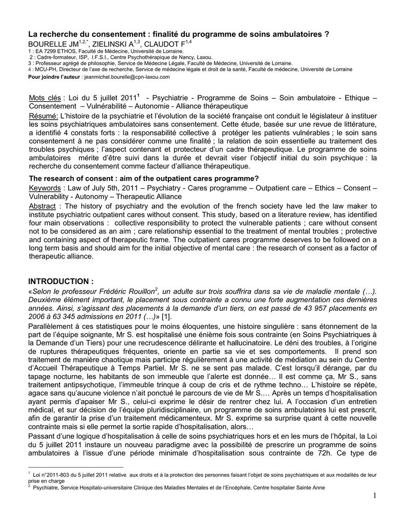 La recherche du consentement : finalité du programme de soins ambulatoires ? BOURELLE JM1,2,*, ZIELINSKI A1,3, CLAUDOT F1,4 1 : EA 7299 ETHOS, Faculté de Médecine, Université de Lorraine. 2 : Cadre-formateur, ISP, I.F.S.I., Centre Psychothérapique de Nancy, Laxou. 3 : Professeur agrégé de philosophie, Service de Médecine Légale, Faculté de Médecine, Université de Lorraine. 4 : MCU-PH, Directeur de l’axe de recherche, Service de médecine légale et droit de la santé, Faculté de médecine, Université de Lorraine Pour joindre l’auteur : [email protected] Mots clés : Loi du 5 juillet 20111 - Psychiatrie - Programme de Soins – Soin ambulatoire - Ethique – Consentement – Vulnérabilité – Autonomie - Alliance thérapeutique Résumé: L’histoire de la psychiatrie et l’évolution de la société française ont conduit le législateur à instituer les soins psychiatriques ambulatoires sans consentement. Cette étude, basée sur une revue de littérature, a identifié 4 constats forts : la responsabilité collective à protéger les patients vulnérables ; le soin sans consentement à ne pas considérer comme une finalité ; la relation de soin essentielle au traitement des troubles psychiques ; l’aspect contenant et protecteur d’un cadre thérapeutique. Le programme de soins ambulatoires mérite d’être suivi dans la durée et devrait viser l’objectif initial du soin psychique : la recherche du consentement comme facteur d’alliance thérapeutique. The research of consent : aim of the outpatient cares programme? Keywords : Law of July 5th, 2011 – Psychiatry - Cares programme – Outpatient care – Ethics – Consent – Vulnerability - Autonomy – Therapeutic Alliance Abstract : The history of psychiatry and the evolution of the french society have led the law maker to institute psychiatric outpatient cares without consent. This study, based on a literature review, has identified four main observations : collective responsibility to protect the vulnerable patients ; care without consent not to be considered as an aim ; care relationship essential to the treatment of mental troubles ; protective and containing aspect of therapeutic frame. The outpatient cares programme deserves to be followed on a long term basis and should aim for the initial objective of mental care : the research of consent as a factor of therapeutic alliance. INTRODUCTION : «Selon le professeur Frédéric Rouillon2, un adulte sur trois souffrira dans sa vie de maladie mentale (…). Deuxième élément important, le placement sous contrainte a connu une forte augmentation ces dernières années. Ainsi, s’agissant des placements à la demande d’un tiers, on est passé de 43 957 placements en 2006 à 63 345 admissions en 2011 (…)» [1]. Parallèlement à ces statistiques pour le moins éloquentes, une histoire singulière : sans étonnement de la part de l’équipe soignante, Mr S. est hospitalisé une énième fois sous contrainte (en Soins Psychiatriques à la Demande d’un Tiers) pour une recrudescence délirante et hallucinatoire. Le déni des troubles, à l’origine de ruptures thérapeutiques fréquentes, oriente en partie sa vie et ses comportements. Il prend son traitement de manière chaotique mais participe régulièrement à une activité de médiation au sein du Centre d’Accueil Thérapeutique à Temps Partiel. Mr S. ne se sent pas malade. C’est lorsqu’il dérange, par du tapage nocturne, les habitants de son immeuble que l’alerte est donnée… Il est comme ça, Mr S., sans traitement antipsychotique, l’immeuble trinque à coup de cris et de rythme techno… L’histoire se répète, agace sans qu’aucune violence n’ait ponctué le parcours de vie de Mr S.… Après un temps d’hospitalisation ayant permis d’apaiser Mr S., celui-ci exprime le désir de rentrer chez lui. A l’occasion d’un entretien médical, et sur décision de l’équipe pluridisciplinaire, un programme de soins ambulatoires lui est prescrit, afin de garantir la prise d’un traitement médicamenteux. Mr S. exprime sa surprise quant à cette nouvelle contrainte mais si elle permet la sortie rapide d’hospitalisation, alors… Passant d’une logique d’hospitalisation à celle de soins psychiatriques hors et en les murs de l’hôpital, la Loi du 5 juillet 2011 instaure un nouveau paradigme avec la possibilité de prescrire un programme de soins ambulatoires à l’issue d’une période minimale d’hospitalisation sous contrainte de 72h. Ce type de 1 Loi n°2011-803 du 5 juillet 2011 relative aux droits et à la protection des personnes faisant l’objet de soins psychiatriques et aux modalités de leur prise en charge 2 Psychiatre, Service Hospitalo-universitaire Clinique des Maladies Mentales et de l’Encéphale, Centre hospitalier Sainte Anne 1 démarche thérapeutique impose une continuité des soins, cela sans le consentement du patient mais après avis de celui-ci : un moyen de solliciter au moins sa participation à défaut de son autonomie au sens plein du terme ? «Désormais, les patients peuvent être contraints de suivre des soins, non plus seulement dans les murs de l’établissement, mais aussi chez eux ou dans leur environnement familial, au sein même de la cité» [2]. Peut-on contraindre, peut-on contenir la folie jusque dans les interstices de la vie privée des personnes souffrant de troubles psychiques ? Jusqu’où considérer la protection d’une personne vulnérable ? La contrainte en soins ambulatoires porte-t-elle atteinte aux libertés individuelles ? Un programme de soins ambulatoires met-il en place une dépendance à un protocole de soins ou vise-t-il à terme l’autonomie du patient ? Ainsi posées, ces questions mettent à jour la complexité des soins psychiatriques, et leurs implications éthiques, politiques, juridiques et sociales. Obérer le débat reviendrait à condenser un enjeu majeur en terme de Santé Mentale : le consentem