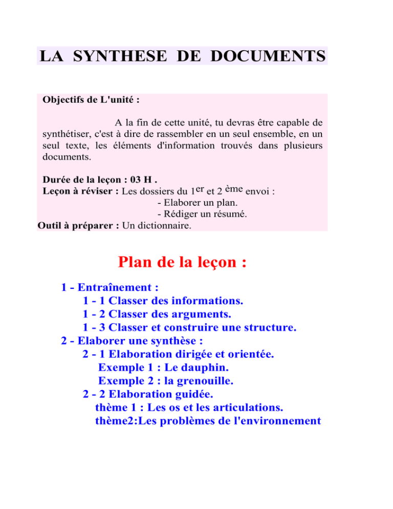 LA SYNTHESE DE DOCUMENTS Objectifs de L'unité : A la fin de cette unité, tu devras être capable de synthétiser, c'est à dire de rassembler en un seul ensemble, en un seul texte, les éléments d'information trouvés dans plusieurs documents. Durée de la leçon : 03 H . Leçon à réviser : Les dossiers du 1er et 2 ème envoi : - Elaborer un plan. - Rédiger un résumé. Outil à préparer : Un dictionnaire. Plan de la leçon : 1 - Entraînement : 1 - 1 Classer des informations. 1 - 2 Classer des arguments. 1 - 3 Classer et construire une structure. 2 - Elaborer une synthèse : 2 - 1 Elaboration dirigée et orientée. Exemple 1 : Le dauphin. Exemple 2 : la grenouille. 2 - 2 Elaboration guidée. thème 1 : Les os et les articulations. thème2:Les problèmes de l'environnement 1 - Entraînement à la synthèse Exercice 1 : Tu es journaliste. des informations toutes numérotées de 1 à 13 arrivent dans la salle de rédaction : 1 Le Venezuela rachète 9 M'Sila UN PRODUIT TRES TOXIQUE EN CIRCULATION A BOU-SAADA une partie de ses créances 2 Du pétrole du golfe pour la réserve stratégique U.S. ? Le président Bongo inaugure 10 Reprise du travail à L'EGT Club des Pins 3 commerciale algérienne Temps particulièrement nuageux sur le Sud - Ouest et le Hoggar . Sur le centre , Temps peu nuageux . SAISIE D'UNE SOMME DE 35 MILLIONS DE CENTIMES EN BILLETS ALGERIENS BOXE AMERICAINE 11 du monde à Atlantic City TEMPERATURES RELEVEES CE MATIN à 6 H ( GMT ) . 6 Bette Davis déshérite ses filles et ses petits - fils 13 8 SAMEDI Alger 11 , Oran 11 , Annaba 10 , 12 KARATE - DO " L'Algérie à Budapest " Ailleurs temps dégagé ,. Les vents seront de Sud - Ouest faibles , les températures maximales subiront de légères hausses , principalement à l'Ouest . Mer belle . 5 Des Algériens au championnat 7 la foire Samedi à 21h50 LA BELLE BETE ET LA avec Linda Hamilton Hassi Messaoud 11 , In Salah 18 , Paris 3 , Rome 4 , Madrid 7 , Londres 10. Le Peintre Mebarki expose à Tlemcen * Dans quelle rubrique du journal les classes- tu ? Réponds dans le tableau suivant : R Rubriques Numéro des titres 4- A -Société B - Télévision C - Vie culturelle D - vie politique E - vie économique F- Météorologie G - Nouvelles sportives 1- Exercice 2 : Voici certains titres d'articles de presse numérotés de 1 à 16. 1 Mort du nouvelliste Ahmed Triqui 2 Maghnia : les taxieurs se rebiffent 8 Situation dans la vieille ville ( Casbah ) 9 Manifestation de jeunes filles à Annaba 3 Hongrie Référendum sur l'élection Présidentielle 10 NEGOCIATION CEE - TIER MONDE TEMPERATURES EXTREMES PREVUES EN ALGERIE 4 VENDS Mercedes 190 E 83 52 000 Km toit ouv , climat Tél : 60.12.99 HB 12 SALVADOR Repli partiel de la guérilla 5 COUPE DU MONDE Eliminatoires SEMAINE DU FILM ITALIEN EN ALGERIE Zone Afrique : Le Cameroun 23 ème qualifié 14 " Pour une banque maghrébine commune " 15 Temps prévu aujourd'hui 19 nov.1989 INDE Beaucoup d'incidents continuent de perturber les élections 7 USM.BLIDA 4 - MBBATNA 0 BIENNALE INTERNATIONALE DES ARTS PLASTIQUES D'ALGER 16 Blida se reprend ... * Dans quelle rubrique les classes - tu ? A - économie D - Société classées B - météorologie E - Politique C - Sport F - culture G - Annonces * Réponds à cette question en complétant le tableau ci - dessous. R Numéros des titres d'articles de presse. 1 2 3 4 5 6 7 8 Numéros des titres d'articles de presse 9 10 11 12 13 14 15 16 Rubriques Rubriques Exercice 3 : Voici une série d'articles de presse qu'un journal devra développer. 1 Equipe Nationale Biskra - Hydra Via ... Abidjan 2 Aide américaine à la Pologne et la Hongrie 3 4 Colloque sur le théâtre maghrébin 8 9 COUPE ARABE DES CLUBS CHAMPIONS : Al - Ittifak - Etoile du Sahel : 1 - 1 TEMPERATURES RELEVEES A L'ETRANGER HIER A MIDI EN COURS OPAEP Conseil ministériel à Abou Dhabi 11 10 URSS : Réouverture de certaines mines CLOTURE DE LA 7ème SESSION DU CONSEIL DES MINISTRES ARABES DE LA JUSTICE RAPPEL 12 Journée d'études sur les séismes 5 NAMIBIE Départ des derniers soldats Sud - Africains Pour moins d'accidents 13 6 Communiqué du Parquet de Annaba 7 SENEGAL - MAURITANIE Les médiateurs de l' OUA attendus à Dakar 14 15 16 Sous le mot d'ordre "le SIDA et les jeunes" L'accord militaire Malte - Libye résilié Mathématiciens Algériens * En classant ces titres par rubriques le journaliste s'est trompé. Voici son classement. Culture 7 8 12 Sport 1 9 Politique 2 5 11 Economique 4 6 10 météorologie 3 ? * Reclasse les convenablement dans le tableau ci-dessous que tu compléteras en indiquant le numéro des titres dans les rubriques correspondantes et le nom de la rubrique qui manque. R Culture Sport Politique Economie Météorologie ? Exercice 4 : Voici une série d'arguments sur le nucléaire extraits d'articles de presse. A1- L'énergie nucléaire est venue à point pour remplacer les énergies qui font défaut : pétrole, charbon, gaz. A2 - L'énergie nucléaire met entre les mains d'un seul homme ( chef d'état ) le pouvoir de décider de la vie de milliers d'hommes. A3 - L'énergie nucléaire, technique insuffisamment maîtrisée, représente un danger permanent pour l'humanité. A4 - L'énergie nucléaire est une arme de dissuasion qui A5 - Refuser l'énergie nucléaire c'est refuser le progrès. A6 - Tant que les scientifiques n'auront pas trouvé les moyens d'éliminer les déchets atomiques, renonçons à l'énergie nucléaire. A7 - L’énergie nucléaire donne la possibilité de réutiliser la chaleur de refroidissement, chauffage urbain, pisciculture. A8 - L'énergie nucléaire est une ouverture sur des techniques nouvelles. A9 - Une guerre nucléaire conduirait à l'extermination de toute vie ( Hiroshima ). A10 - L'énergie nucléaire est une énergie concentrée sous un faible volume et un poids réduit : elle permet de ce fait des prouesses techniques ( moteur des sous-marins ). A11 - Les centrales nucléaires ne peuvent être arrêtées ce qui conduit à des 