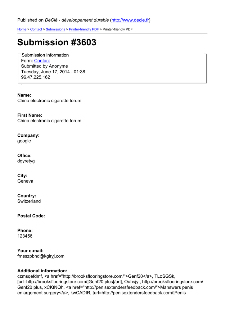 Published on DéClé - développement durable (http://www.decle.fr) Home > Contact > Submissions > Printer-friendly PDF > Printer-friendly PDF Submission #3603 Submission information Form: Contact Submitted by Anonyme Tuesday, June 17, 2014 - 01:38 96.47.225.162 . Name: China electronic cigarette forum First Name: China electronic cigarette forum Company: google Office: dgyretyg City: Geneva Country: Switzerland Postal Code: Phone: 123456 Your e-mail: [email protected] Additional information: czmsqefdmf, <a href="http://brooksflooringstore.com/">Genf20</a>, TLoSGSk, [url=http://brooksflooringstore.com/]Genf20 plus[/url], OuhsjyI, http://brooksflooringstore.com/ Genf20 plus, xCKtNQh, <a href="http://penisextendersfeedback.com/">Manswers penis enlargement surgery</a>, kwCADIR, [url=http://penisextendersfeedback.com/]Penis Enlargement[/url], ZddZuri, http://penisextendersfeedback.com/ Penis enlargement excersizes, VENzPhR, <a href="http://vigrxinformation.com/">VigRX</a>, YGpJwOp, [url=http://vigrxinformation.com/]Vigrx vs vigrx plus[/url], gCXkSID, http://vigrxinformation.com/ VigRX Plus, OsadMQu, <a href="http://ecigscomparedreviewed.com/">Electronic cigarette starter</a>, GRbIMfs, [url=http://ecigscomparedreviewed.com/]Electronic Cigarette[/url], ptdSnAT, http://ecigscomparedreviewed.com/ Fda warning electronic cigarette, kIhahkq, <a href="http://capulet.com/">Is daily dose cialis on the tml formulary</a>, gHPSZBB, [url=http://capulet.com/]Viagra or cialis[/url], lYZYIGW, http://capulet.com/ Cialis, OJtThvX, <a href="http://goodelectroniccigarettes.com/">Electronic cigarette testimonials</a>, tQfXRAY, [url=http://goodelectroniccigarettes.com/]Electronic Cigarettes[/url], tsjsrWS, http://goodelectroniccigarettes.com/ Us manufactured electronic cigarettes, kWjjdbB. Source URL: http://www.decle.fr/?q=en/node/50/submission/3603