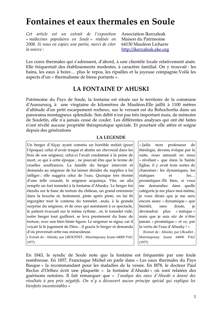 Fontaines et eaux thermales en Soule Cet article est un extrait de l'exposition « médecines populaires en Soule » réalisée en 2008. Si vous en copiez une partie, merci de citer la source : Association Ikerzaleak Maison du Patrimoine 64130 Mauléon Licharre http://ikerzaleak.eke.org Les cures thermales qui s’adressent, d’abord, à une clientèle locale relativement aisée. Elle fréquentait des établissements modestes, à caractère familial. On y trouvait : les bains, les eaux à boire… plus le repos, les ripailles et la joyeuse compagnie.Voilà les aspects d’un « thermalisme de biens portants ». LA FONTAINE D’ AHUSKI Patrimoine du Pays de Soule, la fontaine est située sur le territoire de la commune d'Aussurucq, à une vingtaine de kilomètres de Mauléon.Elle jaillit à 1100 mètres d'altitude d'un petit escarpement rocheux, sur le versant est du Bohochortia dans un panorama montagneux splendide. Son débit n'est pas très important mais, de mémoire de Souletin, elle n'a jamais cessé de couler. Les différentes analyses qui ont été faites n'ont révélé aucune propriété thérapeutique spéciale. Et pourtant elle attire et soigne depuis des générations LA LEGENDE Un berger d’Alçay ayant commis un horrible méfait (pour l’époque) :celui d’avoir traqué et abattu un chevreuil dans les bois de son seigneur, celui-ci l’avait condamné à la peine de mort, ce qui à cette époque , ne pouvait être que le terme de cruelles souffrances. La famille du berger intervint et demanda au seigneur de lui laisser décider du supplice à lui infliger ; elle suggéra celui de l’eau. Quoique très étonné d’une telle cruauté, le seigneur acquiesça. Vite, on alla remplir un fort tonnelet à la fontaine d’Ahusky. Le berger fut étendu sur le banc de torture du château, un grand entonnoir dans la bouche et, lentement, pinte après pinte, on lui fit ingurgiter tout le contenu du tonnelet…mais, à la grande surprise du seigneur, et de ceux qui assistaient à ce spectacle, le patient évacuait sur le même rythme…et, le tonnelet vidé, notre berger tout guilleret, se leva prestement du banc de torture, avec une bien béate figure. Le seigneur se signa, car il voyait là le jugement de Dieu…il gracia le berger et demanda d’où provenait cette eau miraculeuse. « Jadis mon professeur de théologie, devenu évêque par la suite, nous amusait en nous « révélant » que dans la Sainte Eglise, il y avait trois sortes de chanoines : les dynamiques, les statiques et les… prostatiques :Eh bien, si vous me demandiez dans quelle catégorie je me place moi-même, je vous dirais que je me sens encore assez « dynamique » que bientôt, sans doute, je deviendrai plus « statique » mais que je suis sûr de n’être jamais « prostatique » et ce, par la vertu de l’eau d’Ahusky ! » ( Extrait de : Ahüsky par J.ROUFFET , Marrimpouey Jeune 64000 PAU Marrimpouey 1977) (1977) (Extrait de : Ahüzky par J.Rouffet , Jeune 64000 PAU En 1843, le syndic de Soule note que la fontaine est fréquentée par une foule nombreuse. En 1857, Francisque Michel en parle dans « Les eaux thermales du Pays Basque » la recommandant pour les maladies de la vessie. En I878, le docteur Paul Reclus d'Orthez écrit une plaquette « la fontaine d'Ahuski » où sont relatées des guérisons notoires. Il fait remarquer que « l'analyse des eaux d'Ahuski a donné des résultats à peu près négatifs. On n'y a découvert aucun principe spécial qui explique les bienfaits incontestables » 1 LA CURE Le docteur Reclus souligne la quantité impressionnante d'eau que l'on ingurgite lors d'une cure.« On boit 3 fois par jour à 7 heures le matin, puis de 10 à 11 heures et de 4 à 6 heures... .les timides se contentent de 5 à 6 litres d'eau mais d'autres vont beaucoup plus loin... nous avons observé nombre de malades que 10 à I2 litres n'effrayaient pas... » D'après lui, l'eau soigne les gastrites, les dyspepsies, ainsi que la gravelle urique et les vieux catarrhes vésicaux. D'illustres malades vinrent à Ahuski, dont le maréchal Harispe, survivant de l'épopée napoléonienne dans les années 1850, plus tard le photographe Nadar etc.... En 1910 l'eau de la fontaine fut à nouveau analysée par le docteur Feuillet, chef de laboratoire à la faculté de médecine de Paris sans apporter d'indications nouvelles. Le docteur Mendy, dans les années 1970 dit qu'il s'agit d'une eau équivalente à l'eau d'Evian. C'est une eau limpide, légère et froide (8°). LES HÔTELS Le Mémorial des Pyrénées d'octobre 1851 ne «signalait autour de la précieuse source que des cabanes où les gens du pays se logeaient à grand peine». En juillet 1853, il annonce l'ouverture de maisons que Messieurs Justin d'Arroquain de Garindein et Jean Pierre Irigoyen de Mendy venaient de faire construire. Il s'agit de trois hôtels exploités par des gérants. A partir de cette date, les curistes montèrent régulièrement pour se soigner. Il s'est même pratiqué une vente de bouteilles d'eau d'Ahuski à cette époque.Le docteur Reclus écrit que «le registre des auberges indique que pendant l'été 1877,431 personnes sont venues faire la cure, mais cela doit représenter qu'à peine la moitié des buveurs » L'HOTEL BELLEVUE 1852-1959 Bâti en 1852, il fut vendu en 1905 à Pierre Baratçabal de Camou, qui lui donna ce nom et l'agrandit. Un petit appentis servait même d'oratoire aux prêtres de passage. Lorsque Pierre Baratçabal mourut, sa veuve, Chechili, continua à tenir l'hôtel. En 1958, très malade, elle fut transportée sur une civière de branchages par des gens d'Alcay jusqu'au village et ensuite on la mena à l'hôpital de Tardets où elle mourut le 8 février 1958. Ses dernières volontés furent «Des hommes ont pris beaucoup de peine pour moi! Qu'ils vendent mon âne et lorsque j'aurai disparu, qu'ils fassent avec Monsieur le Curé un bon repas en souvenir de moi» Durant l'hiver 1959 l'hôtel, déjà