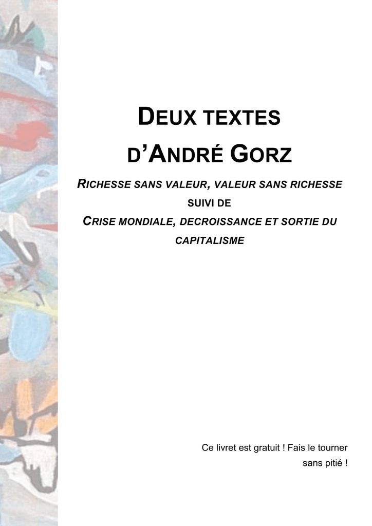DEUX TEXTES D’ANDRÉ GORZ RICHESSE SANS VALEUR , VALEUR SANS RICHESSE SUIVI DE CRISE MONDIALE, DECROISSANCE ET SORTIE DU CAPITALISME Ce livret est gratuit ! Fais le tourner sans pitié ! Un dossier Esprit68 http://www.esprit68.org/ Ce livret est gratuit ! Fais le tourner sans pitié ! Tu peux l’imprimer et le multiplier toi-même en téléchargeant ce fichier : http://www.fichierpdf.fr/2015/06/01/deuxtextesdandregorz/deuxtextesdandregorz.pdf Les conseils pour imprimer et relier les livres et les livrets sont donnés ici : http://www.fichierpdf.fr/2015/06/01/imprimeretrelier5/imprimeretrelier5.pdf Les autres livres et livrets de l’infokiosque sont présentés dans le catalogue téléchargeable à cette adresse : http://www.fichier-pdf.fr/2015/06/02/catalogue30/catalogue30.pdf La prochaine version du catalogue mis à jour sera disponible à cette adresse à compter du 4 juillet 2015 : http://www.fichier-pdf.fr/2015/07/04/catalogue31/catalogue31.pdf Les livres et les livrets de l’infokiosque peuvent également être lus sur le site Esprit68 à cette adresse : http://www.esprit68.org/biblio.html Tu y trouveras d’autres liens vers les diffuseurs du savoir non marchand ! 2 Sommaire Sur André Gorz et les textes proposés ............................................ 4 Richesse sans valeur, valeur sans richesse .................................... 7 Crise mondiale, décroissance et sortie du capitalisme .................. 37 3 Sur André Gorz et les textes proposés Marqué dans sa jeunesse par le marxisme et l’existentialisme, André Gorz, 1923-2007, est un philosophe et un journaliste français, co-fondateur, en 1964 du Nouvel Observateur, sous le pseudonyme de Michel Bosquet. Membre jusqu’en 1974 du comité directeur de la revue Les temps modernes, fondée par Jean Paul Sartre et Simone De Beauvoir, il s’éloigne peu à peu de Sartre. En 1971, sa rencontre avec Ivan Illich, confirme son intérêt pour l’écologie politique. A compter de 1973, André Gorz collabore au mensuel écologique Le Sauvage et développe dans des livres comme Écologie et liberté en 1977, Métamorphoses du travail en 1988 ou Misères du présent, richesse du possible en 1997, une critique de la rationalité économique, de l’idéologie du travail et du productivisme. Il plaide pour un partage du travail et pour l’attribution d’un revenu minimum universel indépendant de l’activité. Penseur de la décroissance, André Gorz s’est rapproché dans les dernières années de sa vie de la « critique de la valeur », ou « wertkritik », élaborée, au sein du groupe Krisis, par des auteurs comme Moishe Postone, Anselm Jappe ou Robert Kurz1. 1 Lire à ce sujet la compilation « critique de la valeur » disponible sur cet infokiosque 4 Richesse sans valeur, valeur sans richesse, est un entretien réalisé par Sonia Montaño et publié dans Cadernos IHV Ideias, n" 31, en 2005, avant d’être repris dans le recueil posthume de textes d’André Gorz intitulé Écologica et paru aux Éditions Galilée en 2008. Ce premier texte témoigne de la réappropriation par Gorz de thèmes et catégories portés par la critique de la valeur, comme la forme marchandise, la survaleur ou la dimension historique du travail. Face à l’idéologie de la croissance et à la folie consumériste, Gorz y pose deux questions essentielles : « de quel croissance avons-nous besoin ? » et « quand la société produit de plus en plus de richesse avec de moins en moins de travail, comment peut-elle faire dépendre le revenu de chacun de la quantité de travail qu'il fournit ? » Les quelques réponses apportées par Gorz, dénoncent la confusion entre augmentation du PIB et augmentation du bien-être, révèlent les métamorphoses du travail salarié et du conditionnement consumériste, relancent l’idée d’un revenu d’existence indépendant du travail, et, tout en anticipant l’actuelle faillite financière, évoquent l’incompatibilité de la nouvelle « économie de la connaissance » avec le capitalisme. Initialement paru dans Entropia n°2 en 2007, Crise mondiale, décroissance et sortie du capitalisme est également repris dans le recueil posthume Écologica. Dans ce second texte, André Gorz s’appuie sur les théoriciens de la critique de la valeur pour décrire les incontournables limites du capitalisme qui rendent inéluctables ses crises actuelles. 5 Mais pour Gorz, l’effondrement qui vient doit nous inciter à fonder une nouvelle civilisation « au-delà du salariat et des rapports marchands ». Cette civilisation, dans laquelle nous ne serions plus « incapables de décider, voire de nous demander de quoi nous avons besoin en quantité et en qualité » où nos désirs et nos besoins ne seraient plus « amputés, formatés, appauvris par l'omniprésence des propagandes commerciales et la surabondance de marchandises », Gorz pense observer ses prémices dans l’abandon du mode industriel de production et dans la relocalisation des activités, permise par les nouvelles technologies basées sur la fabrication numérique (Digital fabricator), les imprimantes 3D et les logiciels libres. Illusion technophile ou réelle perspective d’émancipation ? Que l’on partage ou non l’avis de Gorz sur ce point, il faut reconnaître que son texte propose l’aperçu concret d’un au-delà de la société marchande. Esprit68, avril 2012 6 Richesse sans valeur, valeur sans richesse Entretien réalisé par Sonia Montaño et publié dans Cadernos IHV Ideias, n" 31, Sâo Paulo, Unisinos, 2005. Le Brésil à l'exemple de beaucoup d'autres pays, est extrêmement touché par le problème du chômage. Une des solutions les plus répandues et les plus défendues par des gouvernements, des politiciens et des économistes est la reprise de la croissance. Or, vous dites que cela est insuffisant. Pourquoi ? Il faut d'abord nous demander : de quelle croissance avons-nous besoin ? Qu'est-ce qu'il nous manque que la croissanc
