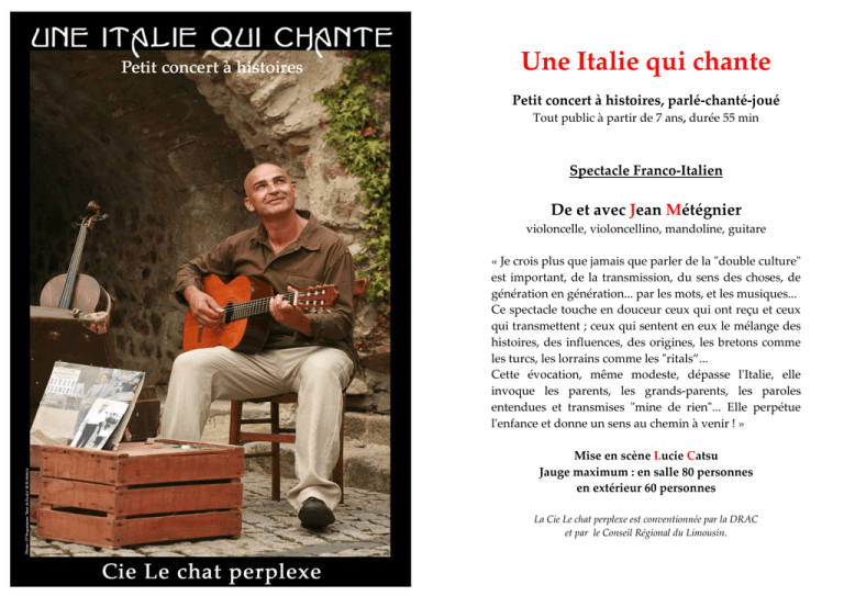 Une Italie qui chante Petit concert à histoires, parlé-chanté-joué Tout public à partir de 7 ans, durée 55 min Spectacle Franco-Italien De et avec Jean Métégnier violoncelle, violoncellino, mandoline, guitare « Je crois plus que jamais que parler de la "double culture" est important, de la transmission, du sens des choses, de génération en génération... par les mots, et les musiques... Ce spectacle touche en douceur ceux qui ont reçu et ceux qui transmettent ; ceux qui sentent en eux le mélange des histoires, des influences, des origines, les bretons comme les turcs, les lorrains comme les "ritals”... Cette évocation, même modeste, dépasse l'Italie, elle invoque les parents, les grands-parents, les paroles entendues et transmises "mine de rien"... Elle perpétue l'enfance et donne un sens au chemin à venir ! » Mise en scène Lucie Catsu Jauge maximum : en salle 80 personnes en extérieur 60 personnes La Cie Le chat perplexe est conventionnée par la DRAC et par le Conseil Régional du Limousin. Une Italie qui chante Le répertoire : L’idée de ce spectacle est de donner à entendre la langue de l’Italie : un monde où les adultes parlent d’une façon tellement «énorrrrme» qu’on dirait qu’ils chantent, avec des mots incroyables, des expressions colorées comme le sont les poivrons dans la braise et des accents qui sentent bon comme la pêche coupée dans un verre de vin… Pour jean métégnier, le prétexte à ce tour de chant franco-italien est une histoire très personnelle : après la guerre, la venue en France de sa mère Angelina, qui a 16 ans, et de ses grands-parents Giuseppe et Maria. Une Italie qui chante c’est une brassée de «je me souviens», où défilent des personnages : Il Nonno l’arrière grand-père, toujours habillé de noir, des cousins qui crient dans la poussière, une amoureuse aux cheveux roux, le géant zio Americo sur son minuscule tracteur qui va tailler le tabac en riant… Des comptines traditionnelles aux textes poétiques de Fabricio Di Andre (le Brassens Italien), en passant par Sergio Franchi (dont toutes les italiennes étaient amoureuses), Jean Métégnier mélange avec espièglerie l’italien et le français, traduisant certaines chansons, certaines paroles, ou au contraire laissant l’imagination et l’émotion faire leur travail ! Chaque chanson est la facette d’un monde où ça chante à tout bout de champ… De derrière la haie du jardin « Torna a Sorriento » remonte à la mémoire, et puis « Bella Ciao » éclate, comme un coup de poing sur la table, et percute les souvenirs : c’est la belote du dimanche… Les Italiens d’ici jettent les cartes à plein poumons, et ça gueule, et ça chante aussi… Le violoncelle et le minuscule violoncellino passent du grave à la farce, du classique au mélo ! La guitare comme la mandoline savent se faire délicieusement tendres (des fois ça dégouline juste comme on aime!) mais toniques aussi : ça swingue tout à fait « al dente », c’est piquant comme un piment ou mordant comme « le chant des partisans ». Et si « i nonni » (les grands-parents) ne sont jamais retournés au pays, leur petit fils a, depuis l’enfance, multiplié les allers et retours : il est devenu le trait d’union entre ici et là-bas, entre ceux qui sont restés et ceux qui sont partis, entre hier et aujourd’hui… Sa valise à chaque voyage s’est chargée de souvenirs et d’émotions, de chansons et d’envies. Une histoire simple qui se parle et qui se chante, comme un tourne-disque pendant une réunion de famille, une ronde d’enfants dans la cour ensoleillée d’une petite école de Naples… Les bribes d’un passé qui remonte à la mémoire, une évocation tout à la fois drôle et nostalgique, tendre et tonique. Ma grand-mère lui disait malicieusement, lorsqu’il rentrait du café : « se vuoi sapere dove si deve andare, non si deve dimenticare da dove vieni : si tu veux savoir où tu dois aller, tu ne dois pas oublier d’où tu viens » Mon grand-père Giuseppe Morsa et l’oncle Salvatore à la fête forraine… Extrait : « En arrivant au jardin, à la bonne saison, des fois on allumait un petit feu avec des sarments de vigne. Puis vite dans la cendre, la Nonna mettait un « peperone, granturco, e pomodorro » : un beau poivron, une poupée de maïs, et une belle tomate : Vert, blanc, et rouge ! Alors elle disait, « vedi, Gianni, cosi, facciamo i colori dell’Italia ! » tu vois, Gianni, comme ça, on fait les couleurs de l’Italie… ! Et elle, elle chantait en jardinant… En fait, elle chantait tout le temps ! Questa di Marinella la storia vera che scivolo' nel fiume a primavera ma il vento che la vide cosi' bella dal fiume la porto' sopra a una stella. Sola senza il ricordo di un dolore vivevi senza il sogno di un amore ma un re senza corona e senza scorta busso' tre volte un giorno alla tua porta. Quand on partait le soir, on écartait les cendres et elle glissait les morceaux d’Italie dans son tablier, quand elle marchait devant moi sur le chemin, ça sentait tellement bon… » La presse a dit : « Avec espièglerie, mais aussi beaucoup de sensibilité, il nous emmène au-delà des Alpes, mélangeant avec talent l’italien et le français. Avec des récits de son enfance, qu’il accompagne de chants où on retrouve tout le soleil de l’Italie dans des évocations pleines de poésie et de couleurs, il a su conquérir le public. Infiniment tendre. Un des grands moments du festival. » LC « Des portraits musicaux drôles et souvent très tendres, de toute une famille restée en Italie…Le français et l’italien se mêlent sans cesse pour finalement ne faire plus qu’une seule langue, peuplée de personnages attachants et chantants, qui empruntent aux deux cultures. » LM Spectacle autonome et tout-terrain : Depuis toujours, Le chat perplexe est en recherche sur de nouvelles manières de donner à voir et à entendre son travail. Si certains 
