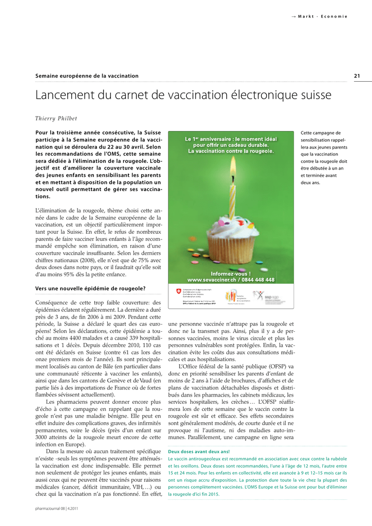 Markt · Economie Semaine européenne de la vaccination 21 Lancement du carnet de vaccination électronique suisse Thi er r y Ph i lb e t Pour la troisième année consécutive, la Suisse participe à la Semaine européenne de la vaccination qui se déroulera du 22 au 30 avril. Selon les recommandations de l’OMS, cette semaine sera dédiée à l’élimination de la rougeole. L’objectif est d’améliorer la couverture vaccinale des jeunes enfants en sensibilisant les parents et en mettant à disposition de la population un nouvel outil permettant de gérer ses vaccinations. Cette campagne de sensibilisation rappellera aux jeunes parents que la vaccination contre la rougeole doit être débutée à un an et terminée avant deux ans. L’élimination de la rougeole, thème choisi cette année dans le cadre de la Semaine européenne de la vaccination, est un objectif particulièrement important pour la Suisse. En effet, le refus de nombreux parents de faire vacciner leurs enfants à l’âge recommandé empêche son élimination, en raison d’une couverture vaccinale insuffisante. Selon les derniers chiffres nationaux (2008), elle n’est que de 75% avec deux doses dans notre pays, or il faudrait qu’elle soit d’au moins 95% dès la petite enfance. Vers une nouvelle épidémie de rougeole? Conséquence de cette trop faible couverture: des épidémies éclatent régulièrement. La dernière a duré près de 3 ans, de fin 2006 à mi 2009. Pendant cette période, la Suisse a déclaré le quart des cas européens! Selon les déclarations, cette épidémie a touché au moins 4400 malades et a causé 339 hospitalisations et 1 décès. Depuis décembre 2010, 110 cas ont été déclarés en Suisse (contre 61 cas lors des onze premiers mois de l’année). Ils sont principalement localisés au canton de Bâle (en particulier dans une communauté réticente à vacciner les enfants), ainsi que dans les cantons de Genève et de Vaud (en partie liés à des importations de France où de fortes flambées sévissent actuellement). Les pharmaciens peuvent donner encore plus d’écho à cette campagne en rappelant que la rougeole n’est pas une maladie bénigne. Elle peut en effet induire des complications graves, des infirmités permanentes, voire le décès (près d’un enfant sur 3000 atteints de la rougeole meurt encore de cette infection en Europe). Dans la mesure où aucun traitement spécifique n’existe -seuls les symptômes peuvent être atténuésla vaccination est donc indispensable. Elle permet non seulement de protéger les jeunes enfants, mais aussi ceux qui ne peuvent être vaccinés pour raisons médicales (cancer, déficit immunitaire, VIH, …) ou chez qui la vaccination n’a pas fonctionné. En effet, pharmaJournal 08 | 4.2011 une personne vaccinée n‘attrape pas la rougeole et donc ne la transmet pas. Ainsi, plus il y a de personnes vaccinées, moins le virus circule et plus les personnes vulnérables sont protégées. Enfin, la vaccination évite les coûts dus aux consultations médicales et aux hospitalisations. L’Office fédéral de la santé publique (OFSP) va donc en priorité sensibiliser les parents d’enfant de moins de 2 ans à l’aide de brochures, d’affiches et de plans de vaccination détachables disposés et distribués dans les pharmacies, les cabinets médicaux, les services hospitaliers, les crèches … L’OFSP réaffirmera lors de cette semaine que le vaccin contre la rougeole est sûr et efficace. Ses effets secondaires sont généralement modérés, de courte durée et il ne provoque ni l’autisme, ni des maladies auto-immunes. Parallèlement, une campagne en ligne sera Deux doses avant deux ans! Le vaccin antirougeoleux est recommandé en association avec ceux contre la rubéole et les oreillons. Deux doses sont recommandées, l’une à l’âge de 12 mois, l’autre entre 15 et 24 mois. Pour les enfants en collectivité, elle est avancée à 9 et 12–15 mois car ils ont un risque accru d’exposition. La protection dure toute la vie chez la plupart des personnes complètement vaccinées. L’OMS Europe et la Suisse ont pour but d’éliminer la rougeole d’ici fin 2015. Markt · Economie 22 Le financement de www.mesvaccins.ch www.mesvaccins.ch a été développé par viavac sarl, startup de l’Université de Genève spécialisée dans les logiciels de vaccinologie, la Caisse des Médecins, leader suisse des logiciels pour cabinet médicaux, et la société Arpage, experte en gestion sécurisée des données médicales (health-info-net). En 2010, viavac sarl a bénéficié d’une subvention de l’Office fédéral de la santé publique pour le développement de ce site. D’autres demandes de subvention ou de soutien sont en cours mais aucune entreprise pharmaceutique productrice ou distributrice de vaccins n’a participé ni ne participera au financement de www.mesvaccins.ch. lancée sur des sites alémaniques destinés aux jeunes mamans afin de renforcer l’action dans la région linguistique où la couverture vaccinale est la plus faible. En effet, la disparité est grande entre cantons, avec aux extrêmes Genève (89.7%) et Appenzell Rhodes-Intérieures (50.4%). Une solution contre la perte du carnet de vaccination Toujours pour améliorer la couverture vaccinale, et notamment celle de la rougeole, le carnet de vaccination électronique suisse «www.mesvaccins.ch, www.meineimpfungen.ch, www.lemievaccinazioni.ch, www.myvaccines.ch» sera aussi lancé durant cette Semaine européenne (le 23 avril). Ce site gratuit permettra à chacun d’enregistrer et de mettre à jour ses vaccins depuis son ordinateur (ou son téléphone portable), dans un compte personnel protégé par un mot de passe (pouvant être communiqué au médecin, au pharmacien ou au professionnel de santé de son choix). Premier intérêt: plus besoin de devoir rechercher partout son carnet de vaccination, qui sera toujours accessible y compris depuis l’étranger, et 