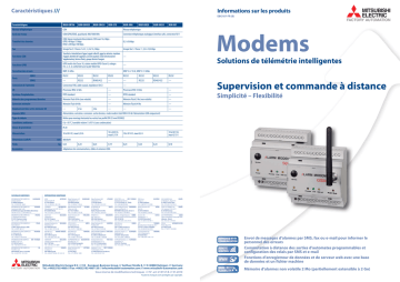 Caractéristiques /// Informations sur les produits EBG187-FR (B) MITSUBISHI ELECTRIC FACTORY AUTOMATION Caractéristiques MAM-GM106 Réseau téléphonique GSM Réseau téléphonique Accès au réseau GSM/GPRS/EDGE, quad band, 900/1800 MHz Connexion téléphonique analogique (interface a/b), connecteur RJ11 Transfert des données GSM: liaison montante/descendante CSD maxi 14,4 kbps : GPRS: 40 kbps/13 kbps EDGE: 220 kbps/100 kbps 0,3 à 56 kbps Fax Groupe fax 3 / Classes 1 et 2 ; 2,4 à 14,4 kbps Groupe fax 3 / Classe 1 ; 2,4 à 14,4 kbps Fonctions GSM Transfert et interdiction d’appel, appel collectif, appel en attente, maintien d’appel, identité de l’appelant, avis de taxation, USSD (Unstructured Supplementary Service Data), groupe fermé d’usagers — Fonctions GPRS GPRS multi-slot Classe 10, station mobile GPRS Classe B, codages CS1, 2, 3, 4, conformité avec la pile SMG31bis — Correction des erreurs MNP, V.42bis MNP 2-4 / V.42, MNP 5 / V.42bis Ports MAM-GM420 MAM-GM424 MIM-G10 MAM-AM6 MAM-AM20 MAM-AM24 MIM-A01 Solutions de télémétrie intelligentes COM1 RS232 RS232 RS232 RS232 RS232 RS232 RS232 RS232 COM2 — RS232 RS485/422 — — RS232 RS485/422 — — Processeur RISC 32 bits Connexion de l’antenne Connecteur FME, câble coaxial, impédance 50 W UC Processeur RISC 32 bits Système d’exploitation RTOS standard — RTOS standard — Mémoire des programmes/données Mémoire Flash 8 Mo (non volatile) — Mémoire Flash 2 Mo (non volatile) — Extension mémoire Mémoire Flash 64 Mo Emplacement des cartes mémoire SD — Voyants (DEL) Alimentation, exécution, connexion, sortie données, mode modem (état MIM-G10 de l’alimentation GSM uniquement) Type de châssis Boîtier pour montage horizontal ou vertical sur profilé DIN 35 mm EN50022 Conditions ambiantes 0 à +50 °C, humidité relative 5 à 95 % (sans condensation) Classe de protection IP 20 Alimentation 10 à 30 V CC, maxi 0,25 A Dimensions (LxHxP) Poids REPRESENTATIONS EUROPEENNES MITSUBISHI ELECTRIC EUROPE B.V. ALLEMAGNE Gothaer Straße 8 D-40880 Ratingen Tél: +49 (0)2102 / 486-0 MITSUBISHI ELECTRIC EUROPE B.V. ESPAGNE Carretera de Rubí 76-80 E-08190 Sant Cugat del Vallés (Barcelona) Tél: 902 131121 // +34 935653131 MITSUBISHI ELECTRIC EUROPE B.V. FRANCE 25, Boulevard des Bouvets F-92741 Nanterre Cedex Tél: +33 (0)1 / 55 68 55 68 MITSUBISHI ELECTRIC EUROPE B.V. ITALIE Viale Colleoni 7 I-20041 Agrate Brianza (MB) Tél: +39 039 / 60 53 1 MITSUBISHI ELECTRIC EUROPE B.V. POLOGNE Ul. Krakowska 50 PL-32-083 Balice Tél: +48 (0)12 / 630 47 00 MITSUBISHIELECTRICEUROPEB.V. RÉP. TCHÈQUE Radlická 714/113a CZ-158 00 Praha 5 Tél: +420 (0)251 551 470 MITSUBISHI ELECTRIC EUROPE B.V. UK Travellers Lane UK-Hatfield, Herts. AL10 8XB Tél: +44 (0)1707 / 27 61 00 GEVA AUTRICHE Wiener Straße 89 AT-2500 Baden Tél: +43 (0)2252 / 85 55 20 TEHNIKON BELARUSSIE Oktyabrskaya 16/5, Off. 703-711 BY-220030 Minsk Tél: +375 (0)17 / 210 46 26 ESCO D & A BELGIQUE Culliganlaan 3 BE-1831 Diegem Tél: +32 (0)2 / 717 64 30 Koning & Hartman b.v. BELGIQUE Woluwelaan 31 BE-1800 Vilvoorde Tél: +32 (0)2 / 257 02 40 INEA BH d.o.o. BOSNIE-HERZÉG. Aleja Lipa 56 BA-71000 Sarajevo Tél: +387 (0)33 / 921 164 AKHNATON BULGARIE 4 Andrej Ljapchev Blvd. Pb 21 BG-1756 Sofia Tél: +359 (0)2 / 817 6004 INEA CR d.o.o. CROATIE Losinjska 4 a HR-10000 Zagreb Tél: +385 (0)1 / 36 940 - 01/ -02/ -03 FACTORY AUTOMATION — — Mémoire Flash 64 Mo — — — — 10 à 30 V CC, maxi 0,15 A 10 à 30 V CC, maxi 0,2 A 0,19 0,24 Supervision et commande à distance Simplicité – Flexibilité 10 à 30 V CC, maxi 0,15 A 0,24 0,24 0,24 0,24 0,18 Adaptateurs de communications, câbles et antennes GSM. SUCCURSALES EUROPEENNES MITSUBISHI ELECTRIC 2 Go — mm 88x58x91 kg 0,24 Accessoires 2 Go Modems Beijer Electronics A/S DANEMARK Lykkegårdsvej 17, 1. DK-4000 Roskilde Tél: +45 (0)46/ 75 76 66 BeijerElectronicsEestiOÜ ESTONIE Pärnu mnt.160i EE-11317 Tallinn Tél: +372 (0)6 / 51 81 40 Beijer Electronics OY FINLANDE Jaakonkatu 2 FIN-01620 Vantaa Tél: +358 (0)207 / 463 500 UTECO A.B.E.E. GRÉCE 5, Mavrogenous Str. GR-18542 Piraeus Tél: +30 211 / 1206 900 MELTRADE Ltd. HONGRIE Fertõ utca 14. HU-1107 Budapest Tél: +36 (0)1 / 431-9726 KAZPROMAUTOM.Ltd. KAZAKHSTAN Mustafina Str. 7/2 KAZ-470046 Karaganda Tél: +7 7212 / 50 11 50 Beijer Electronics SIA LETTONIE Vestienas iela 2 LV-1035 Riga Tél: +371 (0)784 / 2280 Beijer Electronics UAB LITUANIE Savanoriu Pr. 187 LT-02300 Vilnius Tél: +370 (0)5 / 232 3101 ALFATRADE Ltd. MALTE 99, Paola Hill Malta-Paola PLA 1702 Tél: +356 (0)21 / 697 816 INTEHSIS srl MOLDAWIE bld. Traian 23/1 MD-2060 Kishinev Tél: +373 (0)22 / 66 4242 Beijer Electronics AS NORVÉGE Postboks 487 NO-3002 Drammen Tél: +47 (0)32 / 24 30 00 HIFLEXAUTOM.TECHNIEKB.V. PAYS-BAS Wolweverstraat 22 NL-2984 CD Ridderkerk Tél: +31 (0)180 – 46 60 04 Koning&Hartmanb.v. PAYS-BAS Haarlerbergweg 21-23 NL-1101 CH Amsterdam Tél: +31 (0)20 / 587 76 00 AutoCont C.S. s.r.o. RÉP. TCHÈQUE Technologická 374/6 CZ-708 00 Ostrava-Pustkovec Tél: +420 595 691 150 RÉP. TCHÈQUE B:ELECTRIC, s.r.o. Mladoboleslavská 812 CZ-197 00 Praha 19 - Kbely Tél: +420 286 850 848 Sirius Trading & Services ROUMANIE Aleea Lacul Morii Nr. 3 RO-060841 Bucuresti, Sector 6 Tél: +40 (0)21 / 430 40 06 CraftCon.&Engineeringd.o.o. SERBIE BulevarSvetogCaraKonstantina80-86 SER-18106 Nis Tél: +381 (0)18 / 292-24-4/5 INEA SR d.o.o. SERBIE Izletnicka 10 SER-113000 Smederevo Tél: +381 (0)26 / 617 163 AutoCont Control s.r.o. SLOVAQUIE Radlinského 47 SK-02601 Dolny Kubin Tél: +421 (0)43 / 5868210 CSMTradeSlovensko,s.r.o. SLOVAQUIE Vajanskeho 58 SK-92101 Piestany Tél: +421 (0)33 / 7742 760 INEA d.o.o. SLOVÈNIE Stegne 11 SI-1000 Ljubljana Tél: +386 (0)1 / 513 8100 Beijer Electronics AB SUÈDE Box 426 SE-20124 Malmö Tél: +46 (0)40 / 35 86 00 Econotec AG SUISSE Hinterdorfstr. 12 CH-8309 Nürensdorf Tél: +41 (0)44 / 838 48 11 GTS TURQUIE Bayraktar Bulvari Nutuk Sok. No:5 TR-34775 Yukari ISTANBUL