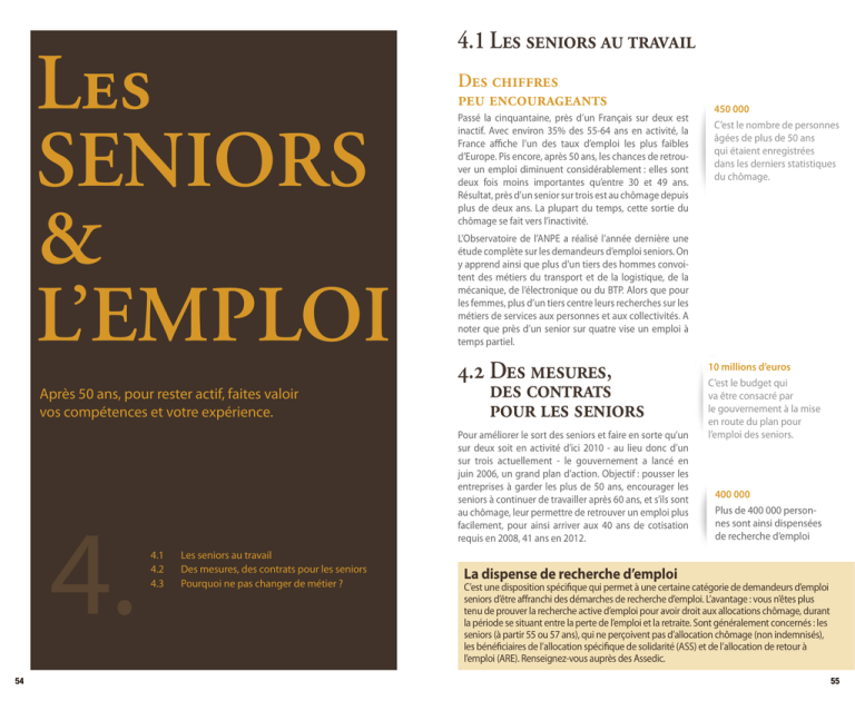 LES SENIORS & L’EMPLOI Après 50 ans, pour rester actif, faites valoir vos compétences et votre expérience. 4. 54 4.1 LES SENIORS AU TRAVAIL DES CHIFFRES PEU ENCOURAGEANTS Passé la cinquantaine, près d’un Français sur deux est inactif. Avec environ 35% des 55-64 ans en activité, la France affiche l’un des taux d’emploi les plus faibles d’Europe. Pis encore, après 50 ans, les chances de retrouver un emploi diminuent considérablement : elles sont deux fois moins importantes qu’entre 30 et 49 ans. Résultat, près d’un senior sur trois est au chômage depuis plus de deux ans. La plupart du temps, cette sortie du chômage se fait vers l’inactivité. L’Observatoire de l’ANPE a réalisé l’année dernière une étude complète sur les demandeurs d’emploi seniors. On y apprend ainsi que plus d’un tiers des hommes convoitent des métiers du transport et de la logistique, de la mécanique, de l’électronique ou du BTP. Alors que pour les femmes, plus d’un tiers centre leurs recherches sur les métiers de services aux personnes et aux collectivités. A noter que près d’un senior sur quatre vise un emploi à temps partiel. 4.2 DES MESURES, DES CONTRATS POUR LES SENIORS Pour améliorer le sort des seniors et faire en sorte qu’un sur deux soit en activité d’ici 2010 - au lieu donc d’un sur trois actuellement - le gouvernement a lancé en juin 2006, un grand plan d’action. Objectif : pousser les entreprises à garder les plus de 50 ans, encourager les seniors à continuer de travailler après 60 ans, et s’ils sont au chômage, leur permettre de retrouver un emploi plus facilement, pour ainsi arriver aux 40 ans de cotisation requis en 2008, 41 ans en 2012. 4.1 4.2 4.3 Les seniors au travail Des mesures, des contrats pour les seniors Pourquoi ne pas changer de métier ? 450 000 C’est le nombre de personnes âgées de plus de 50 ans qui étaient enregistrées dans les derniers statistiques du chômage. 10 millions d’euros C’est le budget qui va être consacré par le gouvernement à la mise en route du plan pour l’emploi des seniors. 400 000 Plus de 400 000 personnes sont ainsi dispensées de recherche d’emploi La dispense de recherche d’emploi C’est une disposition spécifique qui permet à une certaine catégorie de demandeurs d’emploi seniors d’être affranchi des démarches de recherche d’emploi. L’avantage : vous n’êtes plus tenu de prouver la recherche active d’emploi pour avoir droit aux allocations chômage, durant la période se situant entre la perte de l’emploi et la retraite. Sont généralement concernés : les seniors (à partir 55 ou 57 ans), qui ne perçoivent pas d’allocation chômage (non indemnisés), les bénéficiaires de l’allocation spécifique de solidarité (ASS) et de l’allocation de retour à l’emploi (ARE). Renseignez-vous auprès des Assedic. 55 Comment cumuler salaire et retraite ? Travailler après la retraite, c’est possible. Vous pouvez en effet cumuler salaire et retraite, sous certaines conditions : en se mettant à son compte (comme artisans, commerçants, professions libérales, exploitants agricoles…) ou en choisissant une activité bien déterminée (auteur-compositeur, mannequin, membre de jurys de concours, médecins et infirmiers, gardiennes d’enfants, assistantes maternelles, aide à domicile, etc). La réglementation est subtile, il existe encore plusieurs autres cas, mieux vaut donc vous renseigner auprès de votre caisse de retraite. LES PRINCIPALES MESURES : • Mise en place d’un CDD de 18 mois pour les plus de 57 ans (renouvelable une fois). Pour favoriser leur retour sur le marché du travail. • Incitation aux retraites progressives. Pour faciliter la poursuite d’activité au-delà de 60 ans, les aménagements d’horaires (temps partiel, ...) ou les missions de tutorat confiées aux salariés âgés seront encouragés. • Un cumul emploi-retraite plus souple. Aujourd’hui, il est possible de cumuler un emploi et une retraite, tant que le total ne dépasse pas un plafond équivalent au dernier salaire. Afin de ne plus pénaliser les personnes aux petits revenus, cette limite sera désormais établi à 1,6 Smic. • Le taux de surcote est rehaussé. La réforme des retraites de 2003 a instauré une «surcote», pour inciter à travailler au-delà de 60 ans, pour une pleine retraite. Cette majoration est portée à 3 % la première année, 4 % les années suivantes et 5 % au-delà de 65 ans. • 20 000 Contrat initiative emploi (CIE) ont dû être destinés aux demandeurs d’emploi de plus de 50 ans en 2006. Grâce à ce contrat, l’employeur reçoit une aide publique et participe à la formation du salarié. • Suppression de la contribution Delalande. Instaurée en 1987, la contribution Delalande oblige les employeurs licenciant un salarié âgé de plus de 55 ans (âge ramené à 50 ans en 1992, 45 ans en 2003) à verser une somme pour financer l’assurance chômage. Créée pour servir de rempart aux licenciements abusifs des quinquagénaires, cette contribution est depuis jugée comme un frein à l’embauche des seniors. Assouplie en 2003, elle devrait finalement être supprimée en 2010. Des conseils pour retrouver emploi Le plus souvent, on reproche aux seniors : de ne plus être motivé, performant, de manquer de souplesse, de réactivité, etc. Prouvez que ce ne sont que des préjugés ! Mettez en avant votre expérience et votre maturité :capacité à prendre du recul ou des initiatives, connaissance des pièges du métier, existence d’un important réseau relationnel, … Faites également valoir qu’un senior est plus mobile qu’un trentenaire (car libéré des contraintes familiales). Pour décrocher un emploi, privilégiez l’approche directe (candidature spontanée, contact téléphonique, forums, ...). Le but : devancer l’offre d’emploi, contacter l’employeur avant qu’il n’ait exprimé clairement son intention de recrut