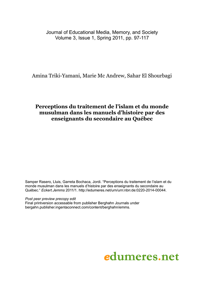 Journal of Educational Media, Memory, and Society Volume 3, Issue 1, Spring 2011, pp. 97-117 Amina Triki-Yamani, Marie Mc Andrew, Sahar El Shourbagi Perceptions du traitement de l’islam et du monde musulman dans les manuels d’histoire par des enseignants du secondaire au Québec Samper Rasero, Lluis, Garreta Bochaca, Jordi. “Perceptions du traitement de l’islam et du monde musulman dans les manuels d’histoire par des enseignants du secondaire au Québec.“ Eckert.Jemms 2011/1. http://edumeres.net/urn/urn:nbn:de:0220-2014-00044. Post peer preview precopy edit Final printversion accessable from publisher Berghahn Journals under bergahn.publisher.ingentaconnect.com/content/berghahn/emms. Amina Triki-Yamani, Marie Mc Andrew, Sahar El Shourbagi 97 Perceptions du traitement de l’islam et du monde musulman dans les manuels d’histoire par des enseignants du secondaire au Québec Perceptions du traitement de l’islam et du monde musulman dans les manuels d’histoire par des enseignants du secondaire au Québec Amina Triki-Yamani et Marie Mc Andrew, avec la collaboration de Sahar El Shourbagi ____________ Amina Triki-Yamani, Chercheure associée, Chaire de recherche du Canada sur l’Éducation et les rapports ethniques, Université de Montréal Marie Mc Andrew, Professeure, Faculté des sciences de l’éducation, Chaire de recherche du Canada sur l’Éducation et les rapports ethniques, Université de Montréal Sahar El Shourbagi, Chercheure associée, Groupe de Recherche Médias et Santé, Département de communication sociale et publique, Université du Québec à Montréal Résumé • Notre article porte sur la manière dont les enseignants du premier cycle du secondaire québécois francophone s’approprient et transmettent le traitement de l’islam et du monde musulman dans le matériel didactique de la discipline d’histoire et d’éducation à la citoyenneté et plus particulièrement, sur leur capacité à identifier les erreurs factuelles, les stéréotypes ou les biais ethnocentriques concernant ces questions. Pour ce faire, nous avons relevé, dans l’analyse des quatorze entretiens semi-directifs menés auprès d’enseignants de l’Ile-de-Montréal, les dimensions et indicateurs portant d’une part, sur leur rapport au curriculum prescrit, et plus précisément sur leur rapport aux savoirs scolaires, sociaux et parfois de référence sur ces enjeux, et d’autre part, sur leur rapport au curriculum réel ou aux savoirs scolaires tels que transmis en situation réelle d’apprentissage. Mots clé • islam, curriculum réel, enseignants d’histoire, rapport aux savoirs, rapport à la religion Abstract • This article focuses on the ways in which Francophone Quebecois secondary 1 and 2 junior high school teachers adapt and transmit the treatment of Islam and the Muslim world in textbooks used for history and citizenship education. The authors focus on the teachers’ capacity to identify factual errors, stereotypes or ethnocentric biases concerning these questions. In order to do this, they analyze fourteen semi-structured interviews carried out with teachers on the island of Montreal, considering dimensions and indicators that relate to their relationship to the formal curriculum, as well as to scholarly and social knowledge of these issues. urn:nbn:de:0220-2014-00044 Journal of Educational Media, Memory, and Society Volume 3, Issue 1, 2011/1 Amina Triki-Yamani, Marie Mc Andrew, Sahar El Shourbagi 98 Perceptions du traitement de l’islam et du monde musulman dans les manuels d’histoire par des enseignants du secondaire au Québec At the same time, we consider their relationship to the real curriculum or to scholarly knowledge as these are transmitted in real-life learning situations. Keywords • Islam, real curriculum, teachers in history, relationship to knowledge, relationship to religion ____________ Problématique de la recherche L’école québécoise faisant l’objet d’une réforme scolaire amorcée en 1997, applique un nouveau programme de formation qui propose des changements importants, notamment au niveau des contenus de formation. Le matériel didactique révisé a été implanté progressivement au secondaire depuis 2005-2006. Les questions liées à l’islam et au monde musulman occupent un espace plus important dans les manuels du premier cycle du secondaire et bénéficient d’une nette amélioration au niveau qualitatif. La présente étude porte sur les perceptions des enseignants du premier cycle du secondaire québécois francophone sur le contenu des programmes ainsi que sur la manière dont ils s’approprient et transmettent le traitement de l’islam et du monde musulman dans le matériel didactique d’histoire et d’éducation à la citoyenneté. Nous nous intéressons plus particulièrement à leur capacité à identifier les erreurs factuelles, les stéréotypes ou les biais ethnocentriques concernant ces questions. Cette enquête fait partie d’une recherche portant sur le traitement curriculaire de l’islam, du monde musulman, et des musulmans, au plan national et international, dans l’ensemble du matériel didactique de langue française des disciplines pertinentes aux ordres primaire et secondaire au Québec.1 Les travaux relatifs à l’utilisation des manuels par les maîtres2 montrent que l’influence du matériel didactique, variable, sur les pratiques pédagogiques en classe, est plus forte lorsque les enseignants traitent d’éléments qu’ils maîtrisent moins ou avec lesquels ils se sentent moins à l’aise, ce qui est souvent le cas des enjeux à caractère ethnique ou international. On ignore comment ce matériel est utilisé par les enseignants, interprété par les élèves et, sauf évidence anecdotique,3 aucune étude sur notre problématique n’a été effectuée depuis celle de NECEF4 limitée à l’Ontario, portant sur la manière dont des enseignants du secondaire s’approprient des sav