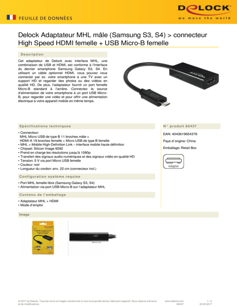 Delock Adaptateur MHL mâle (Samsung S3, S4) > connecteur High Speed HDMI femelle + USB Micro-B femelle Description Cet adaptateur de Delock avec interface MHL, une combinaison de USB et HDMI, est conforme à l'interface du dernier smartphone Samsung Galaxy S3, S4. En utilisant un câble optionnel HDMI, vous pouvez vous connecter par ex. votre smartphone à une TV avec un support HD et regarder des photos ou des vidéos en qualité HD. De plus, l'adaptateur fournit un port femelle Micro-B standard à l'arrière. Connectez la source d'alimentation de votre smartphone à un port USB MicroB, pour regarder une vidéo et pour offrir une alimentation électrique à votre appareil mobile en même temps. Spécifications techniques • Connecteur: MHL Micro USB de type B 11 broches mâle > HDMI-A 19 broches femelle + Micro USB de type B femelle • MHL = Mobile High-Definition Link – interface mobile haute définition • Chipset: Silicon Image 9292 • Prend en charge les résolutions jusqu'à 1080p • Transfert des signaux audio numériques et des signaux vidéo en qualité HD • Tension: 5 V via port Micro USB femelle • Couleur: noir • Longueur du cordon: env. 22 cm (connecteur incl.) N° produit 65437 EAN: 4043619654376 Pays d´origine: China Emballage: Retail Box Configuration système requise • Port MHL femelle libre (Samsung Galaxy S3, S4) • Alimentation via port USB Micro-B sur l’adaptateur MHL Contenu de l’emballage • Adaptateur MHL > HDMI • Mode d’emploi Image © 2017 by Delock. Tous les noms et images mentionnés ici sont la propriété de leur fabricant respectif. Sous réserve d’erreurs et de modifications. www.delock.com 65437 1/2 22.02.2017 General Spécifications techniques: MHL 2.0 Supported device: Samsung Galaxy Note 3 Samsung Galaxy S3 Samsung Galaxy S4 Samsung Galaxy S5 Samsung Galaxy Note 2 Samsung Galaxy Note 8 Samsung Galaxy Tab 3 8" Samsung Galaxy Tab 3 10.1" Samsung Galaxy Tab S 10.5" Samsung Galaxy Tab S 8.4" Samsung Galaxy Note Pro Samsung Galaxy TabPRO 10.1" Samsung Galaxy TabPRO 8.4" Interface Sortie : 1 x HDMI-A femelle 19 broches Entrée : 1 x MHL USB 2.0 Typ Micro-B 11 pin male 1 x USB 2.0 type Micro-B femelle Technical characteristics Chipset: Silicon Image 9292 Maximum screen resolution: 1080p Tension: 5 V via port Micro USB femelle Physical characteristics Longueur du cordon: 20 cm (sans connecteur) Cable length incl. connector: 10 cm © 2017 by Delock. Tous les noms et images mentionnés ici sont la propriété de leur fabricant respectif. Sous réserve d’erreurs et de modifications. Powered by TCPDF (www.tcpdf.org) www.delock.com 65437 2/2 22.02.2017