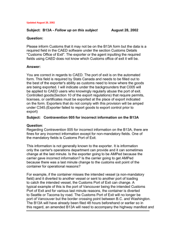 Updated August 28, 2002 Subject: B13A - Follow up on this subject August 28, 2002 Question: Please inform Customs that it may not be on the B13A form but the data is a required field in the CAED software under the section Customs Details "Customs Office of Exit". The exporter or the agent inputting the required fields using CAED does not know which Customs office of exit it will be. Answer: You are correct in regards to CAED. The port of exit is on the automated form. This field is required by Stats Canada and needs to be filled out to the best of the exporter's ability as customs need to know where the goods are being exported. I will indicate under the backgrounders that C005 will be applied to CAED users who knowingly regularly abuse the port of exit. Controlled goods(Section 10 of the export regulations) that require permits, licenses, or certificates must be exported at the place of export indicated on the form. Exporters that do not comply with this provision will be amped under C345.(Exporter failed to report goods to export control prior to export) Subject: Contravention 005 for incorrect information on the B13A Question: Regarding Contravention 005 for incorrect information on the B13A, there are fines for any incorrect information except for non-mandatory fields. One of the mandatory fields is Customs Port of Exit. This information is not generally known to the exporter. It is information only the carrier's operations department can provide and it can sometimes change at the last minute. Is the exporter going to be AMPed because the carrier gave incorrect information? Is the carrier going to get AMPed because there was a last minute change to the customs exit point of the container for operational reasons? For example, if the container misses the intended vessel (a non-mandatory field) and it diverted to another vessel or sent to another port of loading to catch the intended vessel, the Customs Port of Exit can change. A typical example of this is the port of Vancouver being the intended Customs Port of Exit and for various last minute reasons, the container is diverted to Seattle or Tacoma by road. The Customs Port of Exit will no longer be port of Vancouver but the border crossing point between B.C. and Washington. The B13A will have already been filed 48 hours beforehand or earlier so in this regard, an amended B13A will need to accompany the highway manifest and it will trigger an AMPS fine according to this rule. The exporter may or may not know about such routing change. Answer: Regarding Contravention 005 for incorrect information on the B13A, there are fines for any incorrect information except for non-mandatory fields. One of the mandatory fields is Customs Port of Exit. The port of exit is not on the existing B13A for the very reasons you have raised. All fields on the B13A are mandatory with the exception of field #3 Exporter reference number that is used for the exporter's records; Field #7 Export permit if no permit is required; Field # 10(b) if no vessel applies; Field #23 If goods are not sold.....if this situation does not apply. The most current B13A can be viewed here. AMPS - Tips to help you verify your compliance August 27, 2002 (French to follow) What is AMPS? The Canada Customs and Revenue Agency (CCRA) has a new penalty system, called the Administrative Monetary Penalty System (AMPS). AMPS addresses non-compliance with customs legislative, regulatory, and program requirements. On December 3, 2001, we implemented part of the AMPS program. We began with the commercial stream, with penalties for five contraventions of the Customs Self-Assessment (CSA) program. We also introduced a transition period for the remaining commercial AMPS penalties, to give clients time to assess the potential impact on their customs activities and bring their systems into full compliance. During this time, we issued warnings only. We have extended the transition period to October 7, 2002. If you are a member of the trading community, we encourage you to use this additional time to get ready for AMPS. Feel free to contact us if you need help in improving your level of compliance. Getting ready for AMPS If you are involved in importing or exporting goods and you continue to comply with customs requirements, AMPS will not affect you. If you are unsure whether or not you will be affected, make sure you understand your obligations and then assess your state of compliance. We want to help you achieve and sustain compliance over timenot just improve compliance on a “hit-and-miss” basis. This means you need to look carefully at all your customsrelated business systems, processes, and procedures. If you export goods, make sure you are aware of your customs reporting requirements. Since expedited release privileges will be linked to your compliance record, your record is very important to your bottom line. Sample checklist for importers, exporters, and service providers* Look at your customs-related systems, processes, and documents Have you consulted with your service providers (e.g., your broker or customs consultant), or with the CCRA to verify that the tariff classification, tariff treatment, and valuation of the goods you import and export are in accordance with the requirements of the Customs Act, and the Customs Tariff? Can you produce the customs documents and supporting information, including certificates of origin, that we need to verify your import and export transactions? Have you ensured that your imported and exported goods comply with the requirements of other departments and agencies (e.g., the Department of Foreign Affairs and International Trade, or the Canadian Food Inspection Agency)? Do you have all the necessary licences and permits? * This is only an example. It may not include all areas of your business systems and processes that you should verify for compliance with customs requirements. Contact Client Services at your regional customs office for more informatio