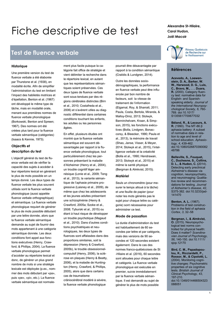 Fiche descriptive de test Alexandre St-Hilaire, Carol Hudon, Joël Macoir Test de fluence verbale Historique Une première version du test de fluence verbale a été élaborée par Thurstone et al. (1938), en modalité écrite. Afin de simplifier l’administration du test en limitant l’impact des habiletés motrices et d’épellation, Benton et al. (1967) ont développé le même type de tâche, mais en modalité orale, menant aux premières normes de fluence verbale phonologique (Borkowski, Benton and Spreen; 1967). Des normes ont été créées plus tard pour la fluence verbale sémantique (catégories) (Isaacs & Kennie, 1973). Objectifs et description du test L’objectif général du test de fluence verbale est de vérifier la capacité des sujets à accéder à leur répertoire lexical en générant le plus de mots possible en un temps donné. Les deux types de fluence verbale les plus souvent utilisés sont la fluence verbale phonologique (aussi appelée fluence verbale orthographique) et sémantique. La fluence verbale phonologique requiert de générer le plus de mots possible débutant par une lettre donnée, alors que la fluence verbale sémantique demande au sujet de fournir des mots appartenant à une catégorie sémantique donnée. Les deux conditions font appel aux fonctions exécutives (Henry, Crawford, & Phillips, 2004). La fluence verbale phonologique permet d’accéder au répertoire lexical et donc, de générer un plus grand nombre de mots si une stratégie lexicale est déployée (p.ex., nommer des mots débutant par «pa», puis «pe», «pi», etc.). La fluence verbale sémantique est normale- ment plus facile puisque la catégorie fait office de stratégie et vient délimiter la recherche dans le répertoire lexical, en autant que les représentations sémantiques soient préservées. Ces deux types de fluence verbale sont sous-tendues par des régions cérébrales distinctes (Birn et al., 2010; Costafreda et al., 2006) et s’avèrent utiles au diagnostic différentiel dans certaines conditions touchant les enfants, les adultes ou les personnes âgées. En effet, plusieurs études ont montré que la fluence verbale sémantique est souvent désavantagée par rapport à la fluence verbale phonologique, tout particulièrement chez les personnes présentant la maladie d’Alzheimer (Henry et al., 2004), un trouble cognitif léger amnésique (Lonie et al., 2009; Teng et al., 2013), la variante sémantique de l’aphasie primaire progressive (Laisney et al., 2009), de même que chez les adolescents et les jeunes adultes présentant une schizophrénie (Henry & Crawford, 2005a; Szoke et al., 2008; Tyburski et al., 2015) ou étant à haut risque de développer un trouble psychotique (Magaud et al., 2010). Dans d’autres conditions psychiatriques et neurologiques, les deux types de fluences sont affaissées dans des proportions similaires, soit la dépression (Henry & Crawford, 2005b), le trouble obsessionnelcompulsif (Henry, 2006), la sclérose en plaques (Henry & Beatty, 2006), et la maladie de Huntington (Henry, Crawford, & Phillips, 2005), alors que dans certains cas de traumatisme crâniocérébral modéré à sévère, la fluence verbale phonologique pourrait être désavantagée par rapport à la condition sémantique (Cralidis & Lundgren, 2014). Outre les données sociodémographiques, la performance en fluence verbale peut être influencée par bon nombre de facteurs, soit la vitesse de traitement de l’information (Elgamal, Roy, & Sharratt, 2011; Paula, Costa, Bertola, Miranda, & Malloy-Diniz, 2013; Stolwyk, Bannirchelvam, Kraan, & Simpson, 2015), les fonctions exécutives (Bolla, Lindgren, Bonaccorsy, & Bleecker, 1990; Paula et al., 2013), la mémoire de travail (Shao, Janse, Visser, & Meyer, 2014; Stolwyk et al., 2015), l’intelligence verbale et la créativité (Bolla et al., 1990; Hendrawan, 2013; Stolwyk et al., 2015) et même la santé physique (Bergman & Almkvist, 2015). Matériel Seuls un chronomètre (pour mesurer le temps alloué à la tâche) et une feuille de papier (pour noter les mots générés pas le sujet pour chaque lettre ou catégorie) sont nécessaires pour administrer ce test. Mode de passation La durée d'administration du test est habituellement de 60 secondes par lettre et par catégorie, mais des versions de 90 secondes et 120 secondes existent également. Dans le cas des normes franco-québécoises de St -Hilaire et al. (2016), 60 secondes sont allouées pour chaque lettre et catégorie. La fluence verbale phonologique est exécutée en premier, suivie immédiatement par la fluence verbale sémantique. Il est demandé au sujet de générer le plus de mots possible Références Acevedo, A., Loewenstein, D. A., Barker, W. W., Harwood, D. G., Luis, C., Bravo, M., . . . Duara, R. (2000). Category fluency test: normative data for English- and Spanishspeaking elderly. Journal of the International Neuropsychological Society, 6, 760769. doi:10.1017/ S1355617700677032 Béland, R., & Lecours, A. R. (1990). The MT-86 β aphasia battery: A subset of normative data in relation to age and level of school education. Aphasiology, 4, 439-462. doi:10.1080/026870390082 48786 Belleville, S., Fouquet, C., Duchesne, S., Collins, D. L., & Hudon, C. (2014). Detecting early preclinical Alzheimer’s disease via cognition, neuropsychiatry, and neuroimaging: Qualitative review and recommendations for testing. Journal of Alzheimer’s disease, 42, S375-382. doi:10.3233/jad141470 Benton, A. L. (1967). Problems of test construction in the field of aphasia Cortex, 3, 32–58 Bergman, I., & Almkvist, O. (2015). Neuropsychological test norms controlled for physical health: Does it matter? Scandinavian Journal of Psychology, 56, 140-150. doi:10.1111/ sjop.12170 Bird, C. M., Papadopoulou, K., Ricciardelli, P., Rossor, M., & Cipolotti, L. (2004). Monitoring cognitive changes: Psychometric properties of six cognitive tests. Bristish Journal of Clinical Psychology, 