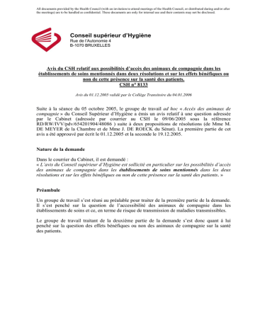 All documents provided by the Health Council (with an invitation to attend meetings of the Health Council, or distributed during and/or after the meetings) are to be handled as confidential. These documents are only for internal use and their contents may not be disclosed. Conseil supérieur d’Hygiène Rue de l’Autonomie 4 B-1070 BRUXELLES Avis du CSH relatif aux possibilités d’accès des animaux de compagnie dans les établissements de soins mentionnés dans deux résolutions et sur les effets bénéfiques ou non de cette présence sur la santé des patients. CSH n° 8133 Avis du 01.12.2005 validé par le Collège Transitoire du 04.01.2006 Suite à la séance du 05 octobre 2005, le groupe de travail ad hoc « Accès des animaux de compagnie » du Conseil Supérieur d’Hygiène a émis un avis relatif à une question adressée par le Cabinet (adressée par courrier au CSH le 09/06/2005 sous la référence RD/RW/IVV/pdv/654201904/48086 ) suite à deux propositions de résolutions (de Mme M. DE MEYER de la Chambre et de Mme J. DE ROECK du Sénat). La première partie de cet avis a été approuvé par écrit le 01.12.2005 et la seconde le 19.12.2005. Nature de la demande Dans le courrier du Cabinet, il est demandé : « L’avis du Conseil supérieur d’Hygiène est sollicité en particulier sur les possibilités d’accès des animaux de compagnie dans les établissements de soins mentionnés dans les deux résolutions et sur les effets bénéfiques ou non de cette présence sur la santé des patients. » Préambule Un groupe de travail s’est réuni au préalable pour traiter de la première partie de la demande. Il s’est penché sur la question de l’accessibilité des animaux de compagnie dans les établissements de soins et ce, en terme de risque de transmission de maladies transmissibles. Le groupe de travail traitant de la deuxième partie de la demande s’est donc quant à lui penché sur la question des effets bénéfiques ou non des animaux de compagnie sur la santé des patients. All documents provided by the Health Council (with an invitation to attend meetings of the Health Council, or distributed during and/or after the meetings) are to be handled as confidential. These documents are only for internal use and their contents may not be disclosed. 1. En ce qui concerne les « possibilités d’accès des animaux de compagnie dans les établissements de soins mentionnés dans deux résolutions » Avis : a) Pour les « institutions de soins aigus » : Les arguments scientifiques pour interdire l’accès aux animaux de compagnie dans les institutions de soins aigus sont basés sur la notion de risques réels bien établis et bien décrits pour les maladies infectieuses transmises lors de contacts répétés entre animaux de compagnie et personnes en mauvaise condition de santé, en traitement voire immunodéprimées. Au vu de ces risques avérés, le groupe de travail ad hoc du CSH considère donc que l’accès des animaux de compagnie dans les institutions de soins aigus doit être interdit sauf avis contraire motivé par le comité d’hygiène hospitalière de l’institution concernée. En cas de dérogation à l’interdiction, il sera de la responsabilité de la direction de l’institution sur avis du comité d’hygiène hospitalière de prendre les mesures appropriées pour gérer correctement l’introduction de l’animal dans le milieu hospitalier, en particulier rédiger une procédure écrite réglementaire afin de minimiser le risque de transmission de maladies infectieuses de l’animal au patient. Ce règlement doit notamment préciser les zones accessibles pour les animaux et les modalités d’accès et de contacts autorisés. b) Les MRS-RVT, les institutions psychiatriques et les établissements de soins chroniques (revalidation, traitements palliatifs) : Le groupe de travail ne voit pas d’objection scientifique à ce que l’accès des animaux de compagnie soit autorisé pour autant qu’il soit fait référence à une procédure, une réglementation écrite permettant de clairement codifier cela. Commentaires Le présent avis (partiel) du CSH se pose uniquement en terme de maladies transmissibles. Il ne prend pas en compte d’autres problèmes comme l’allergie, les morsures, la prise en charge de l’animal de compagnie, etc… L’ouvrage « Infections of leisure » de David Schlossberg (références complètes en annexe) s’avère être une source importante d’informations sur les anthropozoonoses. Dans cet ouvrage, sont effectivement répertoriées les nombreuses maladies transmissibles de l’animal à l’homme. Dans le présent avis, sont repris sous la terminologie « institutions de soins aigus » les hôpitaux et cliniques mais également les services de consultations, les services de soins ambulatoires, les centres de revalidation lourde (par exemple les structures avec lits de type Sp, les établissements du type zeepreventorium, etc…). L’aspect de la question au sujet des maisons de repos et de soins (MRS-RVT), des institutions psychiatriques, des centres de jour (structures d’accueil de jour sans hébergement nocturne) et des établissements de soins chroniques (de type soins palliatifs) sera envisagé à part. Pour ces deux cas de figure, des recommandations spécifiques sont reprises distinctement. 2 All documents provided by the Health Council (with an invitation to attend meetings of the Health Council, or distributed during and/or after the meetings) are to be handled as confidential. These documents are only for internal use and their contents may not be disclosed. Le groupe de travail du CSH ne s’est pas penché sur la problématique des asiles, des prisons et des logements gérés par les pouvoirs publics. Dans le cadre de l’accès des animaux de compagnie dans le milieu hospitalier, il est essentiel de rappeler qu’aucune épidémie nosocomiale imputable à la présence d’animaux de compagnie dans l’