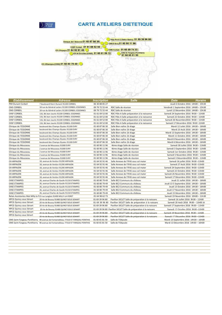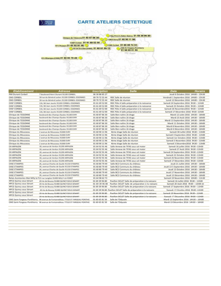 Etablissement PMI Dunant Corbeil Adresse 7 boulevard Henri Dunant 91100 CORBEIL 18 rue du Général Leclerc 91100 CORBEIL-ESSONNES CMS CORBEIL 18 rue du Général Leclerc 91100 CORBEIL-ESSONNES CMS CORBEIL 116, Bd Jean Jaurès 91100 CORBEIL-ESSONNES CHSF CORBEIL 116, Bd Jean Jaurès 91100 CORBEIL-ESSONNES CHSF CORBEIL 116, Bd Jean Jaurès 91100 CORBEIL-ESSONNES CHSF CORBEIL 116, Bd Jean Jaurès 91100 CORBEIL-ESSONNES CHSF CORBEIL boulevard des Champs-Elysées 91100 EVRY Clinique de l'ESSONNE boulevard des Champs-Elysées 91100 EVRY Clinique de l'ESSONNE boulevard des Champs-Elysées 91100 EVRY Clinique de l'ESSONNE boulevard des Champs-Elysées 91100 EVRY Clinique de l'ESSONNE boulevard des Champs-Elysées 91100 EVRY Clinique de l'ESSONNE boulevard des Champs-Elysées 91100 EVRY Clinique de l'ESSONNE 2 avenue de Mousseau 91000 EVRY Clinique du Mousseau 2 avenue de Mousseau 91000 EVRY Clinique du Mousseau 2 avenue de Mousseau 91000 EVRY Clinique du Mousseau 2 avenue de Mousseau 91000 EVRY Clinique du Mousseau 2 avenue de Mousseau 91000 EVRY Clinique du Mousseau 18, avenue de Verdun 91290 ARPAJON CH ARPAJON 18, avenue de Verdun 91290 ARPAJON CH ARPAJON 18, avenue de Verdun 91290 ARPAJON CH ARPAJON 18, avenue de Verdun 91290 ARPAJON CH ARPAJON 18, avenue de Verdun 91290 ARPAJON CH ARPAJON 18, avenue de Verdun 91290 ARPAJON CH ARPAJON 26, avenue Charles de Gaulle 91150 ETAMPES CHSE ETAMPES 26, avenue Charles de Gaulle 91150 ETAMPES CHSE ETAMPES 26, avenue Charles de Gaulle 91150 ETAMPES CHSE ETAMPES 26, avenue Charles de Gaulle 91150 ETAMPES CHSE ETAMPES 26, avenue Charles de Gaulle 91150 ETAMPES CHSE ETAMPES Relais Assistantes Mat Milly la F23 rue Langlois 91490 MILLY-LA-FORET HPCG Quincy sous Sénart 20 rte de Boussy 91480 QUINCY SOUS SENART HPCG Quincy sous Sénart 20 rte de Boussy 91480 QUINCY SOUS SENART HPCG Quincy sous Sénart 20 rte de Boussy 91480 QUINCY SOUS SENART HPCG Quincy sous Sénart 20 rte de Boussy 91480 QUINCY SOUS SENART HPCG Quincy sous Sénart 20 rte de Boussy 91480 QUINCY SOUS SENART HPCG Quincy sous Sénart 20 rte de Boussy 91480 QUINCY SOUS SENART CMS Saint-Fargeau-Ponthierry 98 avenue de Fontainebleau 77310 ST FARGEAU PONTHIE CMS Saint-Fargeau-Ponthierry 98 avenue de Fontainebleau 77310 ST FARGEAU PONTHIE Inscription Salle 06 30 88 85 27 Date Horaire Jeudi 6 Octobre 2016 14h00 – 15h30 09 79 72 55 44 RDC Salle de réunion 09 79 72 55 44 RDC Salle de réunion 01 61 69 52 00 RDC Pôle A Salle préparation à la naissance 01 61 69 52 00 RDC Pôle A Salle préparation à la naissance 01 61 69 52 00 RDC Pôle A Salle préparation à la naissance 01 61 69 52 00 RDC Pôle A Salle préparation à la naissance 01 60 87 86 30 Salle Bien naître 2è étage 01 60 87 86 30 Salle Bien naître 2è étage 01 60 87 86 30 Salle Bien naître 2è étage 01 60 87 86 30 Salle Bien naître 2è étage 01 60 87 86 30 Salle Bien naître 2è étage 01 60 87 86 30 Salle Bien naître 2è étage 01 60 90 11 96 4ème étage Salle de réunion 01 60 90 11 96 4ème étage Salle de réunion 01 60 90 11 96 4ème étage Salle de réunion 01 60 90 11 96 4ème étage Salle de réunion 01 60 90 11 96 4ème étage Salle de réunion 01 64 92 91 46 Salle Annexe de l'IFAS sous sol mater 01 64 92 91 46 Salle Annexe de l'IFAS sous sol mater 01 64 92 91 46 Salle Annexe de l'IFAS sous sol mater 01 64 92 91 46 Salle Annexe de l'IFAS sous sol mater 01 64 92 91 46 Salle Annexe de l'IFAS sous sol mater 01 64 92 91 46 Salle Annexe de l'IFAS sous sol mater 01 60 80 79 49 Salle BC2 Communs du château 01 60 80 79 49 Salle BC2 Communs du château 01 60 80 79 49 Salle BC2 Communs du château 01 60 80 79 49 Salle BC2 Communs du château 01 60 80 79 49 Salle BC2 Communs du château 01 64 98 62 73 01 69 39 96 80 Pavillon SICLET Salle de préparation à la naissanc 01 69 39 96 80 Pavillon SICLET Salle de préparation à la naissanc 01 69 39 96 80 Pavillon SICLET Salle de préparation à la naissanc 01 69 39 96 80 Pavillon SICLET Salle de préparation à la naissanc Vendredi 1 Septembre 2016 14h00 – 15h30 Lundi 12 Décembre 2016 14h00 – 15h30 Samedi 24 Septembre 2016 9h30 – 11h00 Samedi 22 Octobre 2016 9h30 – 11h00 Samedi 26 Novembre2016 9h30 – 11h00 Samedi 17 Décembre 2016 9h30 -11h00 Mardi 12 Juilet 2016 14h30 – 16h00 Mardi 23 Août 2016 14h30 – 16h00 Mardi 13 Septembre 2016 14h30 – 16h00 Mardi 11 Octobre 2016 14h30 – 16h00 Mardi 8 Novembre 2016 14h30 – 16h00 Mardi 6 Décembre 2016 14h30 – 16h00 Samedi 30 Juillet 2016 9h30 – 11h00 Samedi 3 Septembre 2016 9h30 – 11h00 Samedi 1er Octobre 2016 9h30 – 11h00 Samedi 5 Novembre 2016 9h30 – 11h00 Samedi 3 Décembre2016 9h30 – 11h00 Samedi 16 juillet 2016 9h30 –11h00 Samedi 27 Août 2016 9h30 –11h00 Samedi 24 Septembre 2016 9h30 –11h00 Samedi 22 Octobre 2016 9h30 –11h00 Samedi 26 Novembre 2016 9h30 –11h00 Samedi 17 Décembre 2016 9h30 –11h00 Jeudi 21 Juillet 2016 14h30 – 16h00 Jeudi 13 5 Septembre 2016 14h30 – 16h00 Jeudi 13 Octobre 2016 14h30 – 16h00 Jeudi 17 Novembre 2016 14h30 – 16h00 Jeudi 15 Décembre 2016 14h30 – 16h00 Samedi 19 Novembre 2016 10h00 – 11h30 Samedi 16 Juillet 2016 9h30 – 11h00 Samedi 20 Août 2016 9h30 – 11h00 20 Samedi 17 Septembre 2016 9h30 – 11h00 Samedi 15 Octobre 2016 9h30 –11h00 01 69 39 96 80 Pavillon SICLET Salle de préparation à la naissanc Samedi 19 Novembre 2016 9h30 – 11h00 01 69 39 96 80 01 60 65 81 50 01 60 65 81 50 Pavillon SICLET Salle de préparation à la naissanc Salle de l'Odyssée Salle de l'Odyssée Samedi 17 Décembre 2016 9h30 – 11h00 Mardi 13 Septembre 2016 14h30 – 16h00 Mardi 13 Décembre 2016 14h30 – 16h00