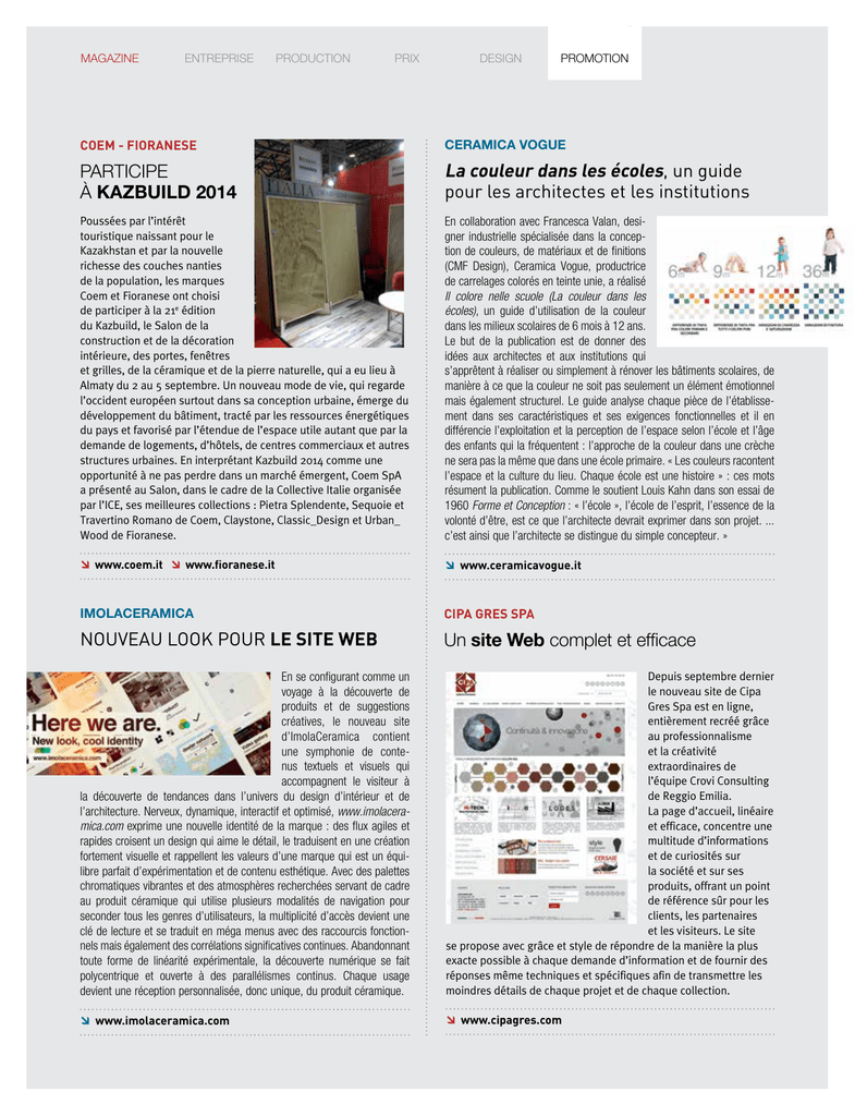cer.news MAGAZINE ENTREPRISE COMPANY PRODUCTION EVENT PRIX GREEN DESIGN PROMOTION DESIGN COEM - FIORANESE CERAMICA VOGUE PARTICIPE À KAZBUILD 2014 La couleur dans les écoles, un guide pour les architectes et les institutions Poussées par l’intérêt touristique naissant pour le Kazakhstan et par la nouvelle richesse des couches nanties de la population, les marques OCCHIELLO OCCHIELLO Coem et Fioranese ont choisi de participer à la 21e édition du Kazbuild, le Salon de la construction et de la décoration intérieure, des portes, fenêtres et grilles, de la céramique et de la pierre naturelle, qui a eu lieu à Almaty du 2 au 5 septembre. Un nouveau mode de vie, qui regarde l’occident européen surtout dans sa conception urbaine, émerge du développement du bâtiment, tracté par les ressources énergétiques du pays et favorisé par l’étendue de l’espace utile autant que par la demande de logements, d’hôtels, de centres commerciaux et autres structures urbaines. En interprétant Kazbuild 2014 comme une opportunité à ne pas perdre dans un marché émergent, Coem SpA a présenté au Salon, dans le cadre de la Collective Italie organisée par l’ICE, ses meilleures collections : Pietra Splendente, Sequoie et Travertino Romano de Coem, Claystone, Classic_Design et Urban_ Wood de Fioranese. En collaboration avec Francesca Valan, designer industrielle spécialisée dans la conception de couleurs, de matériaux et de finitions (CMF Design), Ceramica Vogue, productrice de carrelages colorés en teinte unie, a réalisé OCCHIELLO Il colore nelle scuole (La couleur dans les écoles), un guide d’utilisation de la couleur dans les milieux scolaires de 6 mois à 12 ans. Le but de la publication est de donner des idées aux architectes et aux institutions qui s’apprêtent à réaliser ou simplement à rénover les bâtiments scolaires, de manière à ce que la couleur ne soit pas seulement un élément émotionnel mais également structurel. Le guide analyse chaque pièce de l’établissement dans ses caractéristiques et ses exigences fonctionnelles et il en différencie l’exploitation et la perception de l’espace selon l’école et l’âge des enfants qui la fréquentent : l’approche de la couleur dans une crèche ne sera pas la même que dans une école primaire. « Les couleurs racontent l’espace et la culture du lieu. Chaque école est une histoire » : ces mots résument la publication. Comme le soutient Louis Kahn dans son essai de 1960 Forme et Conception : « l’école », l’école de l’esprit, l’essence de la volonté d’être, est ce que l’architecte devrait exprimer dans son projet. ... c’est ainsi que l’architecte se distingue du simple concepteur. » tiolo titolo tiolo titolo tiolo titolo tiolo titolo testo testo testo à testo testo testo à www.coem.it www.fioranese.it testo testo testo testo à testo testo testo testo testo testo testo testo www.ceramicavogue.it testo testo testo testo testo testo tetesto testo testo testo testo testo testo testo testo testo testo testo testo sto testo testo testo testo testo testo testo testo testo testo CIPA testo GRES testo SPA testo testo testo testo testo testo testo testo testo testo testo testo testo testo testo testo testo testo testo testo testo testo testo testo testo IMOLACERAMICA à www.????????? à www.????????? NOUVEAU LOOK POUR LE SITE WEB tiolo titolo tiolo titolo à www.????????? Un site Web complet et efficace Depuis septembre dernier En se configurant comme un le nouveau site de Cipa voyage à la découverte de Gres Spa est en ligne, produits et de suggestions entièrement recréé grâce créatives, le occhiello nouveau site au professionnalisme d’ImolaCeramica contient et la créativité une symphonie de conteextraordinaires de nus textuels et visuels qui l’équipe Crovi Consulting accompagnent le visiteur à de Reggio Emilia. la découverte de tendances dans l’univers du design d’intérieur et de testo testo testo testo testo testo testo La page d’accueil, linéaire l’architecture. Nerveux, dynamique, interactif et optimisé, www.imolaceratesto testo testo testo testo testo testo et efficace, concentre une mica.com exprime une nouvelle identité de la marque : destesto fluxtesto agilestesto et testo testo testo testo multitude d’informations rapides croisent un design qui aime le détail, le traduisent en une création testo testo testo testo et de curiosités sur fortement visuelle et rappellent les valeurs d’une marque qui est un équila société et sur ses libre parfait d’expérimentation et de contenu esthétique. Avec des palettes à www.????????? produits, offrant un point chromatiques vibrantes et des atmosphères recherchées servant de cadre de référence sûr pour les au produit céramique qui utilise plusieurs modalités de navigation pour clients, les partenaires seconder tous les genres d’utilisateurs, la multiplicité d’accès devient une et les visiteurs. Le site clé de lecture et se traduit en méga menus avec des raccourcis fonctionse propose avec grâce et style de répondre de la manière la plus nels mais également des corrélations significatives continues. Abandonnant exacte possible à chaque demande d’information et de fournir des toute forme de linéarité expérimentale, la découverte numérique se fait réponses même techniques et spécifiques afin de transmettre les polycentrique et ouverte à des parallélismes continus. Chaque usage moindres détails de chaque projet et de chaque collection. devient une réception personnalisée, donc unique, du produit céramique. TIOLO TITOLO TIOLO TITOLO à www.imolaceramica.com à www.cipagres.com
