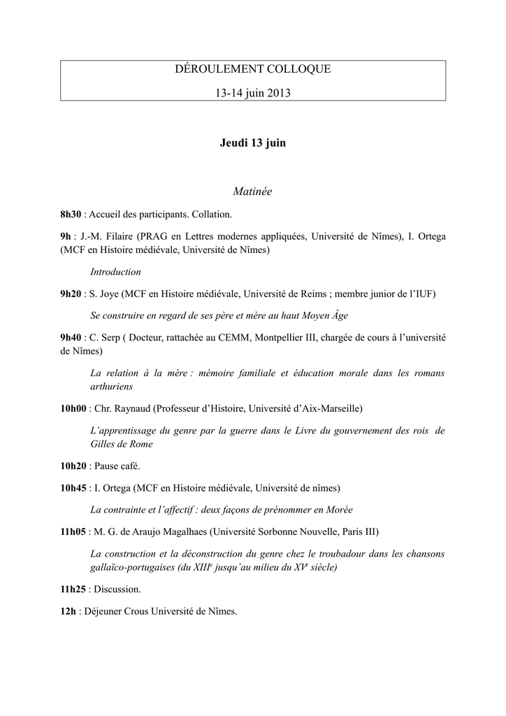 DÉROULEMENT COLLOQUE 13-14 juin 2013 Jeudi 13 juin Matinée 8h30 : Accueil des participants. Collation. 9h : J.-M. Filaire (PRAG en Lettres modernes appliquées, Université de Nîmes), I. Ortega (MCF en Histoire médiévale, Université de Nîmes) Introduction 9h20 : S. Joye (MCF en Histoire médiévale, Université de Reims ; membre junior de l’IUF) Se construire en regard de ses père et mère au haut Moyen Âge 9h40 : C. Serp ( Docteur, rattachée au CEMM, Montpellier III, chargée de cours à l’université de Nîmes) La relation à la mère : mémoire familiale et éducation morale dans les romans arthuriens 10h00 : Chr. Raynaud (Professeur d’Histoire, Université d’Aix-Marseille) L’apprentissage du genre par la guerre dans le Livre du gouvernement des rois de Gilles de Rome 10h20 : Pause café. 10h45 : I. Ortega (MCF en Histoire médiévale, Université de nîmes) La contrainte et l’affectif : deux façons de prénommer en Morée 11h05 : M. G. de Araujo Magalhaes (Université Sorbonne Nouvelle, Paris III) La construction et la déconstruction du genre chez le troubadour dans les chansons gallaïco-portugaises (du XIIIe jusqu’au milieu du XVe siècle) 11h25 : Discussion. 12h : Déjeuner Crous Université de Nîmes. Après-midi 14h : E. Fente ( Docteur en Études féminines et Études du genre, Paris VIII ; chercheur au département d’histoire contemporaine, Université Complutense Madrid) L’homme lointain, le père affectif 14h20 : E. Thorington (Associate professor of French, Ball State University) Le « lait de sagesse » : Les Enseignemens moraux de Christine de Pizan comme legs patriotique. 14h40 : K. Sowley (Université de Strasbourg et Centre College –Danville, Kentucky, ÉtatsUnis) Le rôle du père dans la construction de la féminité médiévale : témoignages littéraires et artistiques 15h : B. Alonso (Agrégée et docteur en Lettres modernes) Les représentations du genre et la transmission maternelle : l'exemple du Débat de Folie et d'Amour de Louise Labé 15h20 : Pause café. 16h : V. Lafage (Docteur, chargée de cours à l’université de Nîmes) Réalités et représentations de la transmission genrée dans les discours testamentaires montpelliérains (XVIe-XVIIe siècles) 16h20 : G. Méret ( Normalienne, Agrégée de Lettres modernes, Doctorante à l’EHESS) La parenté à l'épreuve de l'Autre. Les familles du Maranhão vues par des missionnaires capucins au XVIIe siècle 16h40 : S. Vergnes (Agrégée d’Histoire, chercheuse associée au laboratoire FRAMESPA, Université Toulouse II-le Mirail) Au nom du père… et de la mère. Fardeau des héritages et désir d’émancipation dans la construction du genre chez la Grande Mademoiselle d’après ses Mémoires 17h : Discussions 19h : Dîner Vendredi 14 juin Matinée 9h : A.-R. Iancu (Docteur, Institut d’histoire « N. Iorga », Bucarest, Roumanie) Figures de l’ancêtre : entre légende fondatrice et construction généalogique (Valachie et Moldavie, fin du XVIIIe –début du XIXe siècle) » 9h 20 : J.-L. Meunier (Docteur en littérature française, rattaché au RIRRA 21, Montpellier III) Père-mère : jeu de présence-absence dans la Princesse de Clèves 9h40 : A.-C. Yemsi-Paillissé ( Docteur et agrégée en Espagnol, PRAG à Toulouse II-Le Mirail) « Ma mère, mon miroir »… La transmission mère-fille dans les récits dramatiques de l’Espagne contemporaine 10h : Pause café. 10h30 : S. Coudassot-Ramirez (PRAG en Espagnol, Université de Nîmes) Le père indigne et la marâtre 10h50 : J. Raimond (MCF en Espagnol, Université de Nîmes) Géométries variables de l’héritage dans Volver et Abrazos rotos de Pedro Almodovar 11h 10 : M.-J. Filaire (PRAG en Lettres modernes appliquées, Université de Nîmes) Le Legs des père-mère et le sang des pervers : raconter le genre dans le manga de vampires. 11h30 : Discussions 11h45 : M. Aurell (Professeur, Université de Poitiers) Conclusion générale 12h30 : Déjeuner Crous Université de Nîmes Après-midi Visite de la Nîmes romaine par Éric Teyssier