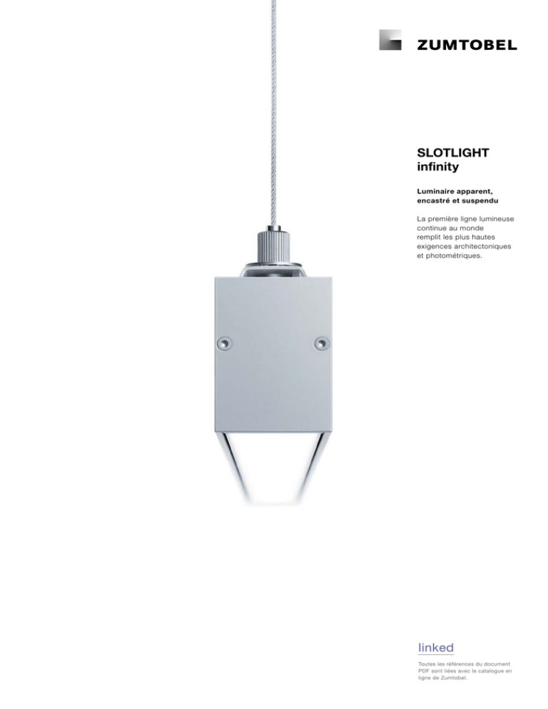 SLOTLIGHT infinity Luminaire apparent, encastré et suspendu La première ligne lumineuse continue au monde remplit les plus hautes exigences architectoniques et photométriques. linked Toutes les références du document PDF sont liées avec le catalogue en ligne de Zumtobel. Designed to be infinity 3 Consulting by Arup, Stephen Philips SLOTLIGHT infinity allie l'expérience en matière d'éclairage de Zumtobel et le savoir-faire en ingénierie multidisciplinaire d'Arup qui se base sur une profonde connaissance de l'éclairage, du design et de l'architecture. Le résultat est une veine lumineuse continue – un kit d'éclairage et de possibilités de commande, qui permet au client de réaliser une solution réellement intégrée et d'une grande efficacité énergétique. Avec la ligne lumineuse SLOTLIGHT infinity, Zumtobel offre aux architectes et concepteurs un outil qui leur permet de tracer des lignes rigoureusement précises. La lumière en rouleau est dès à présent disponible : les lignes lumineuses s‘étirent pratiquement à l‘infini sur une longueur allant jusqu‘à 20 mètres. Elles ne présentent pas de jonctions et sont uniformément éclairées, même en formant des angles. Encastrée dans le plafond, apparente ou suspendue, quel que soit le type de montage, la ligne lumineuse SLOTLIGHT infinity reste toujours fidèle au principe de la ligne parfaite. Sa construction innovante simplifie non seulement les différentes étapes de montage, mais garantit également une intégration esthétique de la version encastrée dans le plafond. Des joints creux précis perfectionnent la lumière. 5 tunableWhite Une luminosité et une couleur d’éclairage qui suivent la lumière du jour Des solutions d‘éclairage artificiel à action biologique s‘orientant sur la lumière du jour et sur les conditions météorologiques stabilisent le rythme circadien. Avec le système de gestion de l‘éclairage LITECOM qui permet le réglage continu des températures de couleur de 3000 K à 6000 K, SLOTLIGHT infinity tunableWhite s‘adapte parfaitement aux préférences individuelles et aux besoins biologiques des utilisateurs, car même si la température de couleur change, l‘éclairement reste toujours constant. La solution lumineuse tunableWhite la plus simple se compose d’un module de commande CIRCLE tune avec trois ambiances d’éclairage. Celles-ci peuvent être définies de manière individuelle : les températures de couleur comprises entre 3000 K et 6000 K, ainsi que l’intensité souhaitée, peuvent être ajustées facilement à l’aide de l’interrupteur à bascule. Aucune mise en service ni adressage n’est nécessaire. Effet biologique de la lumière Une étude utilisateurs réalisée en collaboration avec l‘Institut Fraunhofer IAO et portant sur la qualité de lumière perçue au bureau montre que les préférences en matière de température de couleur sont très différenciées. Les températures ressenties comme idéales se situent entre 3000 K et 6000 K, mais on note une sensible préférence pour les températures de 4000 K et 5000 K. L‘étude a également montré que les employés de bureau évaluent nettement mieux leur situation de travail lorsqu‘ils peuvent adapter l‘éclairage à leurs besoins. Vu que pendant les sombres mois d‘hiver la synchronisation de l‘horloge interne par la lumière du jour ne fonctionne pas à l‘intérieur, la DIN SPEC 67600:201304 donne des recommandations de conception concrètes pour un éclairage à action biologique. Des solutions d‘éclairage artificiel avec des grandes surfaces éclairantes diffuses comme SLOTLIGHT infinity tunableWhite, combinées avec une gestion de l‘éclairage sont la recette idéale pour stimuler l‘activité pendant la journée et offrir un sommeil réparateur la nuit. zumtobel.com/study-office zumtobel.com/study-office Impulsion matinale Température de couleur : 5000 K E h * (éclairage naturel et artificiel) : plus de 500 lx Objectif : synchronisation de l‘horloge interne, suppression totale de la production de mélatonine 7 De jour par ciel ensoleillé Température de couleur : 4000 K E h * (éclairage naturel et artificiel) : plus de 1000 lx De jour par ciel couvert Température de couleur : 6000 K E h * (éclairage naturel et artificiel) : plus de 800 lx Préparation au repos nocturne Température de couleur : 3000 K E h * (éclairage naturel et artificiel) : plus de 500 lx Objectif : fournir la température de couleur adaptée qui stimule le bien-être : couleur de lumière plus chaude par temps ensoleillé Objectif : fournir la température de couleur adaptée qui stimule le bien-être : couleur de lumière plus froide par ciel couvert Objectif : synchronisation de l‘horloge interne, pas de perturbation de la production de mélatonine, sommeil réparateur * E h = éclairement horizontal Un système pour une configuration aisée Les canaux d‘éclairage SLOTLIGHT infinity arrivent déjà complets et électrifiés, dotés d‘accessoires et de câblages de passage. Sur place, il ne reste qu‘à fixer la barre LED et à placer l‘optique correspondante de la bobine. Les lignes lumineuses standard et tunableWhite représentent des systèmes indépendants. Configurateur en ligne Avec une interface utilisateur facile à contrôler sur le site Internet de Zumtobel, la solution lumière SLOTLIGHT infinity peut être configurée rapidement. Il vous suffit de saisir les dimensions de la ligne d‘éclairage souhaitée et le configurateur assemble une liste de pièces complète – pour une ligne lumineuse linéaire ainsi que pour des lignes d‘éclairage dans les angles, en forme de U ou en forme de O. L‘exportation des données est effectuée dans un fichier Excel ou PDF. zumtobel.com/slotlightinfinity Lignes lumineuses tunableWhite Canal d‘installation tunableWhite Canal technique tunableWhite Canal de montage tunableWhite tunableWhite LED-Balken Optique opale Optique bureau
