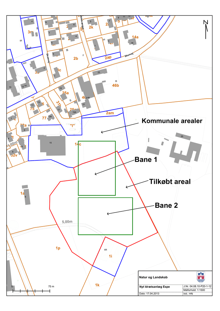 2c 6 3g m"" ""m 3m 3h 7 7 5 2l 2k 3 5 3f 1 2aæ 13 14r 2i 18 2h vveejj Skkoollee S 3 3d 2 jj vvvvee S Skkoo 22aapp 2b 3c 3b 11 14a 4 2m 2 1144qq 1144oo 9 ænnggeett A Asskkeevvæ 4 9 23 1 12 14 10 46b 19 25a 46c 21B ""kk"" bb 3311 13 11 76 75 17 77 7 32q 25c 15A 2am 13A 32a 32p 21 Kommunale arealer "l" 9 32t 4 25 m 00m 32x 11,,00 6 15 14c 8 32v Bane 1 Tilkøbt areal 1a 6 Bane 2 m 00m 5, 5,00 1p 6R 1i Natur og Landskab 12f 0 75 m 1k Nyt Idrætsanlæg Espe Dato: 17.04.2013 J.Nr. 04.08.10-P20-1-12 Målforhold: 1:1500 Init.: HN