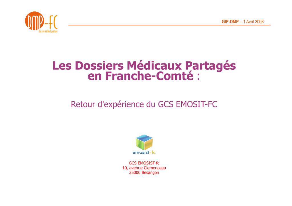 GIP-DMP – 1 Avril 2008 Les Dossiers Médicaux Partagés en Franche-Comté : Retour d'expérience du GCS EMOSIT-FC GCS EMOSIST-fc 10, avenue Clemenceau 25000 Besançon GIP-DMP – 1 Avril 2008 PLAN DE LA PRESENTATION 1 – La Franche-Comté & EMOSIST-FC 2 – Organiser le partage d’informations médicales 3 – Le DMP-FC 4 – Démonstration du dispositif GIP-DMP – 1 Avril 2008 La région Franche-Comté & La structure EMOSIST-FC GIP-DMP – 1 Avril 2008 La région Franche-Comté : Offre de soins • Population : 1,2 millions d’habitants • 340 médecins pour 100.000 habitants en moyenne, dont 166 généralistes et 173 spécialistes. (Picardie 256 médecins/100.000 h, l’Île-de-France avec 426 médecins/100.000 h) • Un CHU, #60 établissements de santé GIP-DMP – 1 Avril 2008 La structure EMOSIST-FC • Groupement de Coopération Sanitaire (GCS), créé en 2004 sous l’égide des Établissements de Santé et de l’ARH de Franche-Comté. • Rassemble plus de 40 établissements de santé privés et publics, 23 réseaux de santé au travers de la fédération des réseaux de santé de Franche-Comté (FRS-FC). • Missions : • • Intervient sur les projets de mutualisation et de coopération en matière de système d’information • Gère la plate-forme régionale Principaux projets en 2008 : • Projet Isys : Installation du dossier médical Millenium ® de la société CERNER, sur 6 établissements publics, infrastructure technique centralisée, 2185 lits (1869 MCO), >10 Millions d’euros. • Projet PSI: Dossier médical 13 établissements (2600 lits HL et SSR) • Plate-forme régionale de santé, DMP-FC, DCC … GIP-DMP – 1 Avril 2008 Organiser le partage d’informations médicales GIP-DMP – 1 Avril 2008 Organiser le partage d’informations : un constat Parcours de soins d’un patient : • Tous les acteurs de santé produisent des documents et de l’information concernant la santé du patient. • Chaque acteur identifie le patient différemment dans son système informatique (pas d’INS, pas d’utilisation directe du NIR pour l’identification). Impossible d’automatiser les échanges d’informations ! GIP-DMP – 1 Avril 2008 Organiser le partage d’informations : Identifier le patient L’identification des patients en Franche-Comté • Création d’une référence commune pour l’identification des patients pris en charge dans les établissements de FC (Idéopass, 800.000 patients identifiés). • Chaque acteur continue à utiliser son identifiant local, mais il est lié à un identifiant régional. Patient [id Régional, id local1, id local2, …]. GIP-DMP – 1 Avril 2008 Organiser le partage d’informations : Consolider l’information Consolider les informations de santé du patient • Il est possible de consolider toutes les informations produites pour un patient dans un dossier régional pour les partager. • Actuellement, 800.000 patients sont concernés GIP-DMP – 1 Avril 2008 Organiser le partage d’informations : Identifier les PS Respect de la confidentialité : On ne peut partager l’information qu’entre des acteurs identifiés et autorisés ! • Création d’un annuaire des professionnels de santé en recoupant les informations existantes : registre ADELI, base CPS, annuaire, établissements de santé … et demain le RPPS • Plus de 5.000 professionnels référencés dans l’annuaire des professionnels de santé de Franche-Comté Annuaire des patients, annuaire des professionnels de santé, DEUX prérequis pour partager l’information GIP-DMP – 1 Avril 2008 Organiser le partage d’informations : Identifier les besoins Il n’y a pas une seule façon de partager l’information ! • Réseaux de santé, Dossiers professionnels (dossier commun de cancérologie « DCC », dossiers inter-établissements …), maisons de santé, DMP, DP … • La nature des informations partagées dépend : • de la finalité des échanges (améliorer la prise en charge, continuité des soins, santé publique, maîtrise des dépenses …), • des professionnels impliqués (médecins spécialistes, généralises, pharmaciens, paramédicaux …) • du patient (ses pathologies, son âge, son accord pour partager de l’information le concernant). GIP-DMP – 1 Avril 2008 Organiser le partage d’informations : Identifier les besoins Intérêt pour le patient (DMP) DMP (continuité des soins) DCC, dossiers de réseau (amélioration de la prise en charge) Intérêt pour les professionnels de santé (dossier partagé professionnel) Il n’y a pas UN dossier médical partagé, mais des services de partage de l’information médicale GIP-DMP – 1 Avril 2008 Franche-Comté : Une culture du partage de l’information médicale • 23 réseaux de santé (20.000 dossiers structurés), organisés depuis 2002 autour d’un dossier partagé de réseau avec une architecture proche du DMP national, fortement axé sur l’information structurée. • Dossier régional de chimiothérapie (10.500 dossiers), Dossier commun de cancérologie « DCC » en cours de réalisation. • Dossier urgence (FC-Urgence) 200.000 passages analysés/an. • Transfusion du sang 4.000 dossiers/an. • Dossier mutualisé inter-établissement (Millenium®, PSI®). • Réseau régional d’images : 1000 télé-expertises/an pour les urgences neurologiques, 1000 télé-diagnostiques/an pour le scanner du CH de la ville de Gray. Depuis juin 2007 (appel à projet GIP-DMP), mise en place d’un nouveau service de partage de l’information médical organisé autour du patient sur la base du cahier des charges du DMP national : Le DMP-FC GIP-DMP – 1 Avril 2008 Partager l’information avec le DMP-fc GIP-DMP – 1 Avril 2008 DMP-FC : Le cahier des charges du service de partage • Finalité : Améliorer la continuité des soins du patient • Les acteurs de santé : Potentiellement, tous les professionnels de santé qui prennent en charge le patient • Le patient : Il dé