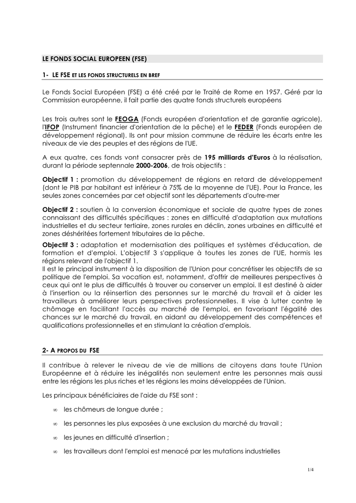 LE FONDS SOCIAL EUROPEEN (FSE) 1- LE FSE ET LES FONDS STRUCTURELS EN BREF Le Fonds Social Européen (FSE) a été créé par le Traité de Rome en 1957. Géré par la Commission européenne, il fait partie des quatre fonds structurels européens Les trois autres sont le FEOGA (Fonds européen d'orientation et de garantie agricole), l'IFOP (Instrument financier d'orientation de la pêche) et le FEDER (Fonds européen de développement régional). Ils ont pour mission commune de réduire les écarts entre les niveaux de vie des peuples et des régions de l'UE. A eux quatre, ces fonds vont consacrer près de 195 milliards d'Euros à la réalisation, durant la période septennale 2000-2006, de trois objectifs : Objectif 1 : promotion du développement de régions en retard de développement (dont le PIB par habitant est inférieur à 75% de la moyenne de l'UE). Pour la France, les seules zones concernées par cet objectif sont les départements d'outre-mer Objectif 2 : soutien à la conversion économique et sociale de quatre types de zones connaissant des difficultés spécifiques : zones en difficulté d'adaptation aux mutations industrielles et du secteur tertiaire, zones rurales en déclin, zones urbaines en difficulté et zones déshéritées fortement tributaires de la pêche. Objectif 3 : adaptation et modernisation des politiques et systèmes d'éducation, de formation et d'emploi. L'objectif 3 s'applique à toutes les zones de l'UE, hormis les régions relevant de l'objectif 1. Il est le principal instrument à la disposition de l'Union pour concrétiser les objectifs de sa politique de l'emploi. Sa vocation est, notamment, d'offrir de meilleures perspectives à ceux qui ont le plus de difficultés à trouver ou conserver un emploi. Il est destiné à aider à l'insertion ou la réinsertion des personnes sur le marché du travail et à aider les travailleurs à améliorer leurs perspectives professionnelles. Il vise à lutter contre le chômage en facilitant l'accès au marché de l'emploi, en favorisant l'égalité des chances sur le marché du travail, en aidant au développement des compétences et qualifications professionnelles et en stimulant la création d'emplois. 2- A PROPOS DU FSE Il contribue à relever le niveau de vie de millions de citoyens dans toute l'Union Européenne et à réduire les inégalités non seulement entre les personnes mais aussi entre les régions les plus riches et les régions les moins développées de l'Union. Les principaux bénéficiaires de l'aide du FSE sont : • les chômeurs de longue durée ; • les personnes les plus exposées à une exclusion du marché du travail ; • les jeunes en difficulté d'insertion ; • les travailleurs dont l'emploi est menacé par les mutations industrielles 1/4 Les priorités du FSE visent à compléter les actions de formation professionnelle, traditionnellement confiées en France aux organismes publics et à soutenir la politique française en faveur de la création d'emplois. La majeur partie des actions cofinancées par le FSE sont mises en oeuvre au niveau régional. 3- L'OBJECTIF 3, LE FSE ET LA FRANCE Dans le cadre de la programmation 1994-1999 des Fonds Structurels, l'objectif 3 a cofinancé de nombreuses actions visant à combattre le chômage de longue durée et à faciliter l'insertion professionnelle des personnes exposées à l'exclusion du marché du travail. 3.1- LA PROGRAMMATION DE L'OBJECTIF 3 EN FRANCE (2000-2006) Le DOCUP (document unique de programmation) de l'objectif 3 pour la France a été approuvé par la Commission européenne le 18 juillet 2000. L'aide communautaire apportée par le Fonds social européen au titre de l'objectif 3 est de 4,714 milliards d'euros (31 milliards de francs français). Dans la programmation 2000-2006 des Fonds Structurels, l'objectif 3 co-finance, notamment, des actions ayant pour objectif de soutenir l'adaptation et la modernisation des politiques et systèmes d'éducation de formation et d'emploi. 3.2- CONTEXTE DE LA STRATEGIE FRANÇAISE D'INTERVENTION DU FSE OBJECTIF 3 La stratégie française s'inscrit dans plusieurs dimensions: Les quatre piliers de la stratégie européenne pour l'emploi La mise en oeuvre de la PNAE (plan national d'action pour l'emploi) Les 5 domaines d'intervention du FSE et les 3 priorités transversales définis dans le règlement Les principes de programmation sont : visibilité, concentration, valeur ajoutée, approche préventive et partenariat 2/4 3.3- DOMAINES D'ACTION Pour la France, la programmation de l'objectif 3 se décompose en 6 axes et 11 mesures: AXE MESURES % DU PLAN FINANCIER A XE 1 : politiques actives du M ESURE 1 : Renforcer la politique du 21% marché du travail "Nouveau Départ" M ESURE 2 : accompagner les politiques de l'Etat pour l'insertion et l'exclusion AXE 2 : égalité des chances, c o n t r e 25% M ESURE 3 : appuyer les initiatives intégration sociale locales pour l'insertion et contre l'exclusion M ESURE 4 : faciliter le passage de l'école au travail A XE 3 : éducation et M ESURE 5 : améliorer l'information, formation tout au long de l'orientation et l'individualisation des 23% la vie formations, notamment par les TIC, et développer l'accès à la validation des acquis M ESURE 6 : moderniser les A XE 4 : adaptation des organisations du travail et travailleurs, e s p r i t développer les compétences 22% d'entreprise, innovation, M ESURE 7 : développer l'esprit recherche et technologie d'entreprise et favoriser la création d'activité et l'innovation M ESURE 8 : développer l'accès et la A XE 5 : amélioration de participation des femmes au l'accès et de la m a r c h é du travail 4% participation des femmes M ESURE 9 : favoriser l'articulation vie au marché du travail familiale, vie professionnelle et la professionnalisation des acteurs AXE 6 : actions transversales M ESURE 1 0 : initiatives locales 5% MESURE 11 : assistance technique EGALITE DES CHANCES ENTRE LES FEMMES ET LES HOMMES L