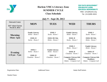 Harlem YMCA Literacy Zone SUMMER CYCLE Class Schedule Web: ymcalitzone.org Tel. (212)690-4024 July 9 – Sept 20, 2012 Outreach Center 2627 Adam Clayton Powell Jr, Blvd Morning 10am -1pm Evening 6:30 pm – 9 pm Registration Date: Student Name: MON TUES WED THURS Family Literacy Robin – Room 1 ESOL I Sacha - Room 1 Family Literacy Robin – Room 1 ESOL I Sacha - Room 1 ESOL II Sacha – Room 2 ESOL III Citiz Robin – Room 2 ESOL II Sacha – Room 2 ESOL III Citiz Robin – Room 2 ESOL I Robin – Room 1 Family Literacy Robin – Room 1 ESOL II Claudette - Room 2 ESOL IV Claudette – Room 2 Computer Literacy/Job Readiness Odalys – Computer Lab Computer Literacy/Job Readiness Odalys – Computer Lab ESOL I Robin – Room 1 Family Literacy Robin – Room 1 ESOL II Claudette – Room 2 ESOL IV Claudette – Room 2 Additional Notes: Intake Staff Initials: Harlem YMCA Literacy Zone SUMMER CYCLE Class Schedule Web: ymcalitzone.org Tel. (212)690-4024 9 de julio a 20 de septiembre, 2012 Outreach Center 2627 Adam Clayton Powell Jr, Blvd Mañana 10 am -1 pm Tarde 6:30 pm – 9 pm Registration Date: Student Name: LUN MAR MIÉ JUE Lectura-escritura para familia Robin ESL I Sacha Lectura-escritura para familia Robin ESL I Sacha ESL II Sacha ESL I Robin ESL II Claudette Ciudadanía/ESL III Robin Lectura-escritura para familia Robin ESL IV Claudette Additional Notes: Ciudadanía/ESL III Robin ESL II Sacha Lectura-escritura para familia Robin ESL I Robin ESL II Claudette Computación / Habilidades del trabajo Odalys ESL IV Claudette Computación / Habilidades del trabajo Odalys Intake Staff Initials: Harlem YMCA Literacy Zone SUMMER CYCLE Class Schedule Web: ymcalitzone.org Tel. (212)690-4024 Juillet 9 au 22 Septembre, 2012 Outreach Center 2627 Adam Clayton Powell Jr, Blvd Matin 10 am -1 pm Soir 6:30 pm – 9 pm Registration Date: Student Name: LUN MAR MER JEU L'alphabétisation pour la Famille Robin ESL I Sacha L'alphabétisation pour la Famille Robin ESL I Sacha ESL II Sacha ESL I Robin La Citoyenneté ESL III Robin L'alphabétisation pour la Famille Robin ESL II Claudette ESL IV Claudette Additional Notes: ESL II Sacha La Citoyenneté ESL III Robin ESL I Robin L'alphabétisation pour la Famille Robin ESL II Claudette ESL IV Claudette Ordinateur/ Compétences Professionnelles Odalys Ordinateur/ Compétences Professionnelles Odalys Intake Staff Initials: Harlem YMCA Literacy Zone SUMMER CYCLE Class Schedule Web: ymcalitzone.org Tel. (212)690-4024 Outreach Center 2627 Adam Clayton Powell Jr, Blvd Robin Sacha Robin Sacha Robin Robin Sacha Robin Robin Robin Claudette Registration Date: Student Name: Robin - Claudette Claudette Odalys Sacha Claudette Odalys Additional Notes: Intake Staff Initials: