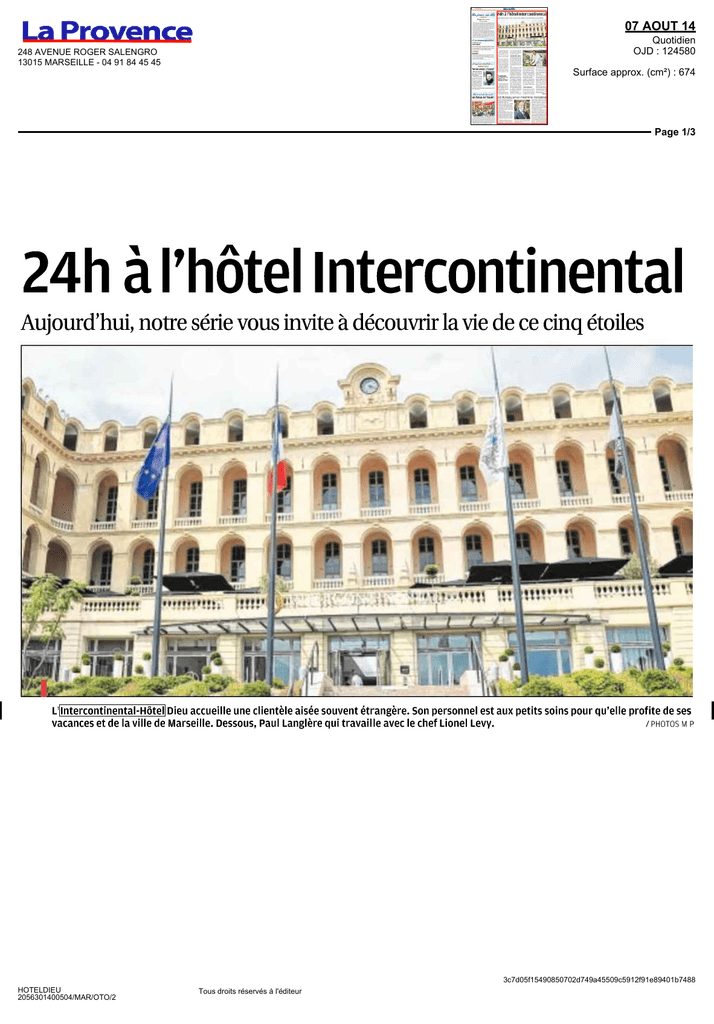 07 AOUT 14 Quotidien OJD : 124580 248 AVENUE ROGER SALENGRO 13015 MARSEILLE - 04 91 84 45 45 Surface approx. (cm²) : 674 Page 1/3 24h àPhôtel Intercontinental Aujourd'hui, notre série vous invite à découvrir la vie de ce cinq étoiles •^•~ ?, I- .« • iJLJL-i-JR * À ^ Al Jk.'«fc • '»- lt lf i ll "ll » ll « «" lj' vj >,- teu^ * *-** -t£r*-l i ^** £*' ^3r* ^fff «*jr 7 ^r m - V"V\ \ \ L'Intercontinental-Hôtel Dieu accueille une clientèle aisée souvent étrangère. Son personnel est aux petits soins pour qu'elle profite de ses vacances et de la ville de Marseille. Dessous, Paul Langlère qui travaille avec le chef Lionel Levy. /PHOTOS M p 3c7d05f15490850702d749a45509c5912f91e89401b7488 HOTELDIEU 2056301400504/MAR/OTO/2 Tous droits réservés à l'éditeur 07 AOUT 14 Quotidien OJD : 124580 248 AVENUE ROGER SALENGRO 13015 MARSEILLE - 04 91 84 45 45 Surface approx. (cm²) : 674 Page 2/3 L 'été, le personnel dè l'Intercontinental-Hôtel Dieu ne connaît pas les vacances. Le palace cinq étoiles, implanté dans un bâtiment construit au XVIIIe siècle, ancien hôpital est classé monument historique. Dès 7 heures, les femmes de chambres commencent leur journée et se répartissent le travail dans les étages. L'hôtel comprend 194 chambres dont 22 suites, chaque femme de chambre fait une dizaine de pièces par jour. Elles prennent le relais sur l'équipe de nuit, qui veille et répond aux demandes des clients. "La nuit les clients nous sollicitent. Il faut être en mesure de répondre à leurs exigences. ll peut s'agir de changer des draps, "Les gouvernantes sont les garantes de la qualité et dè la réputation de l'hôtel." d'amener des serviettes de bain etc. ", explique Alexandra Guenix, gouvernante générale. "Les gouvernantes sont les garantes de la qualité et de la réputation de l'hôtel. Notre travail est de satisfaire les clients et respecter leur besoin", poursuit Madame Guenix. Inauguré il y a tout juste un an, le personnel du cinq étoiles est aux petits soins pour ses clients aisés qui disposent au sein de l'hôtel d'un bar, d'un restaurant, d'une brasserie, d'un spa de I 000 m2 et d'une piscine intérieure. En cuisine dès 8 heures La journée commence elle aussi très tôt du côté des cuisines. Le chef étoile Lionel Levy, installe à Marseille depuis 13 ans, officie au restaurant avec l'aide de quatre sous-chefs, qui se partagent respectivement la responsabilité du bar, de la brasserie du room service, du banquet et du restaurant. Paul Langlère, l'un des sous-chefs, se définit: "Je dois assurer la ligne de conduire culinaire du chef, je suis un relais au quotidien afin de respecter la philosophie du goût que désire le chef. Dès 8 heures, ce Marseillais qui a commencé sa carrière chez Ducasse, débute sa journée au restaurant. Il veille à la bonne réception de la marchandise, élabore le plat du jour et donne les consignes à ses équipes, notamment pour la préparation du déjeuner. Il surveille les retours de la part des clients concernant le room-service et le petit-déjeuner. "Il faut être réactif et ingénieux. Les clients peuvent avoir des exigences culinaires, comme demander par exemple des sushis. Il faut répondre à leur demande et se débrouiller pour trouver les producteurs le plus rapidement possible", explique le chef Langlère. Le midi, le restaurant sert autour de cent couverts. Clients de l'hôtel comme clients d'affaires fréquentent les lieux. Depuis le début de l'été, le palace propose sur sa terrasse de 750 m2, de nombreuses soirées, ainsi que des banquets dont Paul Langlère à la charge. Le dimanche soir, les clients peuvent déguster une sélection de gambas, du homard grillé ou encore des côtes de bceuf à la moelle. L'après-midi, femmes de chambres et gouvernantes continuent leur tournée de ménage : "On respecte les horaires des clients, certains ne souhaitent pas être dérangés le matin. " explique la gouvernante générale. Un spa de 1000 de m2 Une j o u r n é e à l'Intercontinental est aussi rythmée par le Centre de Bien-être Clarins, qui propose tous les jours des soins de 10 heures à 19h. En été le Spa est rempli par une clientèle étrangère qui loge dans le palace : "En ce moment on voit beaucoup de Russes et d'Américains. Ils viennent le soir en rentrant de la plage pour se relaxer" explique Alexane Zuno, responsable du marketing du spa. Une piscine, deux saunas dont un de 1000 m2, une salle de fitness, mais aussi des douches sensorielles sont à la carte pour ses clients aisés. En journée, Nathalie Uro-Pinerd, coach sportive sept fois médaillée d'or de taekwendo et ancienne coach auxjo de Londres en 2012, propose des cours de zumba, fitness aux pensionnaires. Au total, 13 personnes travaillent quotidiennement à faire f o n c t i o n n e r le spa. L'Intercontinental, qui est aussi l'un des plus beaux monuments de Marseille, entend bien conserver son image de prestige et de marque. MilenaPElLLON 3c7d05f15490850702d749a45509c5912f91e89401b7488 HOTELDIEU 2056301400504/MAR/OTO/2 Tous droits réservés à l'éditeur 07 AOUT 14 Quotidien OJD : 124580 248 AVENUE ROGER SALENGRO 13015 MARSEILLE - 04 91 84 45 45 Surface approx. (cm²) : 674 Page 3/3 Eddy Montana, barman d'expérience internationale Formé à l'école hôtelière à Talence près de Bordeaux, cet ancien footballeur professionnel est aujourd'hui le responsable du bar de l'hôtel Intercontinental. Eddy Montana a fait le tour du monde avant de poser ses valises au bar de l'hôtel cinq étoiles, classé patrimoine historique. C'est en 1994, qu'Eddy commence sa carrière en partant ouvrir un hôtel à San Diego aux États-Unis, ou il y restera trois ans. Avant d'enchaîner ensuite un poste dans un club-restaurant branché, le Baoli à Palm Beach à Cannes. En 2005, Eddy décide cette fois-ci de partir en Australie, àBrisbane, "pour suivre ma petite amie", comme bannan. Il finira par y gérer au bout de six mois le club "Fa