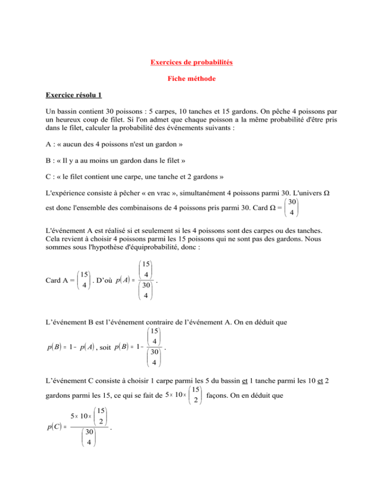 Exercices de probabilités Fiche méthode Exercice résolu 1 Un bassin contient 30 poissons : 5 carpes, 10 tanches et 15 gardons. On pêche 4 poissons par un heureux coup de filet. Si l'on admet que chaque poisson a la même probabilité d'être pris dans le filet, calculer la probabilité des événements suivants : A : « aucun des 4 poissons n'est un gardon » B : « Il y a au moins un gardon dans le filet » C : « le filet contient une carpe, une tanche et 2 gardons » L'expérience consiste à pêcher « en vrac », simultanément 4 poissons parmi 30. L'univers Ω 30 est donc l'ensemble des combinaisons de 4 poissons pris parmi 30. Card Ω = 4 L'événement A est réalisé si et seulement si les 4 poissons sont des carpes ou des tanches. Cela revient à choisir 4 poissons parmi les 15 poissons qui ne sont pas des gardons. Nous sommes sous l'hypothèse d'équiprobabilité, donc : 15 15 4 Card A = . D’où p ( A) = . 30 4 4 L’événement B est l’événement contraire de l’événement A. On en déduit que 15 4 p ( B ) = 1 − p ( A) , soit p ( B ) = 1 − . 30 4 L’événement C consiste à choisir 1 carpe parmi les 5 du bassin et 1 tanche parmi les 10 et 2 15 gardons parmi les 15, ce qui se fait de 5 × 10 × façons. On en déduit que 2 15 5 × 10 × 2 p( C ) = . 30 4 Exercice résolu 2 Une urne contient 12 boules blanches et 8 boules noires indiscernables au toucher. On effectue des tirages dans cette urne, chacune des 20 boules ayant la même probabilité d’être tirée. 1. On tire simultanément 5 boules. Quelle est la probabilité d’obtenir : • 3 boules blanches et 2 boules noires ? L’expérience consiste à prélever simultanément 5 boules parmi 20. L'univers Ω est donc 20 l'ensemble des combinaisons de 5 boules prises parmi 20. Card Ω = . 5 Appelons A l’événement « obtenir 3 boules blanches et 2 boules noires ». On choisit les 3 boules blanches parmi les 12 de l’urne et les 2 boules noires parmi les 8 de l’urne, ce qui se 12 8 12 8 3 2 fait de façons. D’où p ( A) = . (l’hypothèse d’équiprobabilité est vérifiée) 20 3 2 5 • Des boules de couleur différentes ? Appelons B l’événement « obtenir des boules de couleurs différentes ». B est réalisé si l’on obtient : (1 boule blanche et 4 boules noires) ou (2 boules blanches et 3 boules noires) ou (3 boules blanches et 2 boules noires) ou (4 boules blanches et 1 boule noire). Il semble donc plus raisonnable de considérer l’événement contraire de B. B = « obtenir des boules de même couleur ». B peut s’écrire comme la réunion disjointe des 2 événements suivants : C = « n’obtenir que des boules blanches » D = « n’obtenir que des boules noires » 12 8 + 5 5 p ( B ) = p( C ) + p ( D ) = . 20 5 12 8 + 916 5 5 D’où p ( B ) = 1 − , soit p ( B ) = . 20 969 5 2. On tire successivement 5 boules, la boule tirée étant remise dans l’urne après chaque tirage. Quelle est la probabilité d’obtenir : • 3 boules blanches et 2 boules noires dans cet ordre ? Appelons A l’événement « obtenir 3 boules blanches et 2 boules noires dans cet ordre ». 12 La probabilité d’amener la première boule blanche est de . Le tirage s’effectuant 20 11 successivement et sans remise, la probabilité d’amener la seconde boule blanche est de , et 19 10 la probabilité d’amener la 3ème boule blanche est de . Il ne reste plus que 17 boules dans 18 8 l’urne à ce moment. La probabilité d’amener la 1ère boule noire est donc de et celle 17 7 d’amener la seconde boule noire de . 16 12 11 10 8 7 77 × × × × On en déduit que p ( A) = , soit p ( A) = . 20 19 18 17 16 1938 • 3 boules blanches et 2 boules noires dans un ordre quelconque ? Appelons B l’événement « obtenir 3 boules blanches et 2 boules noires ». La probabilité d’obtenir 3 boules blanches et 2 boules noires dans un ordre fixé est de 77 1938 5! échantillons distincts composés de 3 boules blanches et 2 boules noires 3!2! (revoir le cours sur le dénombrement). On en déduit que la probabilité de l’événement B est 5! 77 385 égale à , soit p ( B ) = . 3!2! 1938 1938 (exo). Il y a