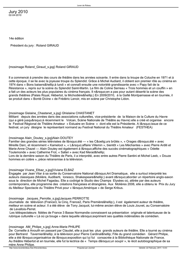 Lever de Rideau Jury 2010 02-04-2010 14e édition Président du jury : Roland GIRAUD {mosimage Roland_Giraud_s.jpg} Roland GIRAUD Il a commencé à prendre des cours de théâtre dans les années soixante. Il entre dans la troupe de Coluche en 1971 et à cette époque, il se lie avec la joyeuse troupe du Splendid. Grâce à Michel Audiard, il obtient son premier rôle au cinéma en 1974 dans « Bons baisers…à lundi » et connaît ensuite une notoriété grandissante avec « Papy fait de la Résistance », repris sur la scène du Splendid Saint-Martin. Le film de Coline Serreau « Trois hommes et un couffin » en a fait un des acteurs les plus populaires du cinéma français. Il n’en a pas pour autant déserté la scène des grands théâtres (Palais Royal, Hébertot, la Michodière…) En 2009/2010, à la Gaîté Montparnasse et en tournée, il se produit dans « Bonté Divine » de Frédéric Lenoir, mis en scène par Christophe Lidon. {mosimage Gislaine_Chastanet_s.jpg} Ghislaine CHASTANET Militant depuis des années dans des associations culturelles, vice-présidente de la Maison de la Culture du Havre (qui a géré jusqu’à récemment le Volcan, Scène Nationale de Théâtre au Havre) elle a créé et organise encore le Festival Régional de Théâtre Amateur « Estuaire en Scène » dont elle est la Présidente. A l’issue de ce festival, un jury désigne le représentant normand au Festival National du Théâtre Amateur (FESTHEA) {mosimage Alain_Doutey_s.jpg}Alain DOUTEY Familier des grandes séries télévisées de l’été --- « les Cœurs brûlés », « Orages d’été » avec Mireille Darc, et récemment « Kameloot », « L’affaire Villemin », bientôt « Les Méchantes » avec Pierre Arditi et Marie-Anne Chazel --- Alain Doutey est également à l’affiche des succès cinématographiques « Odette Toulemonde » avec Catherine Frot, « Safari » avec Kad Merad… Lors de la dernière saison du Théâtre de Paris, il a interprété, avec entre autres Pierre Santini et Michel Leeb, « Douze hommes en colère », pièce retransmise à la télévision. {mosimage Vivane_Elbaz_s.jpg}Viviane ELBAZ Engagée par Jean Vilar à sa sortie du Conservatoire National d’Art Dramatique, elle a surtout interprété les auteurs classiques (Molière, Audiberti, Ionesco, Shakespeare…) avant d’aborder un répertoire anglo-saxon sous la direction de Michel Fagadau. Elle a codirigé le Studio des Champs Elysées où, attirée par des auteurs contemporains, elle programme des créations françaises et étrangères. Aux Molières 2006, elle a obtenu le Prix du Jury du Meilleur Spectacle du Théâtre Privé pour « l’Amérique » de Serge Kribus. {mosimage Jacques_Perrotte_s.jpg}Jacques PERROTTE Journaliste de télévision (France3, la Cinq, France2, Paris Première…), il est également auteur de théâtre, metteur en scène et acteur. Il a été élève de Tony Jacquot, lui-même ancien élève de Louis Jouvet, au Conservatoire de Levallois-Perret. Les téléspectateurs fidèles de France 3 Basse Normandie connaissent sa présentation originale et talentueuse de la rubrique culturelle « Là où ça bouge » dans laquelle s’expriment ses qualités indéniables de comédien. {mosimage AM_Philipe_s.jpg} Anne-Marie PHILIPE De Corneille à Anouilh en passant par Claudel, elle a joué les plus grands auteurs de théâtre. Elle a tourné au cinéma pour Bertrand Tavernier… à la télévision pour Pierre Cardinal… Fille du grand comédien Gérard Philipe, elle a été l’organisatrice de l’exposition qui lui fut consacrée à la Bibliothèque Nationale de France. Au théâtre Hébertot et en tournée, elle fut la lectrice de « Temps d’un soupir », le récit autobiographique de sa mère Anne Philipe. http://www.leverderideau.free.fr/leverderideau Propulsé par Joomla! Généré: 22 February, 2017, 13:43 Lever de Rideau Les jeunes lecteurs connaissent « Danseur », son cheval lusitanien dont elle a fait le héros d’une série d’albums. Passionnée d’équitation, elle partage sa vie entre Paris et le Pays d’Auge. http://www.leverderideau.free.fr/leverderideau Propulsé par Joomla! Généré: 22 February, 2017, 13:43