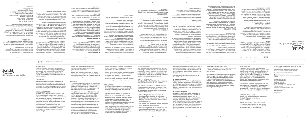 6 7 8 Instructions D’utilisation Du Test Cutané Bellafill 5 DESCRIPTION 4 SUNEVA MEDICAL, INC. 5870 Pacific Center Blvd. San Diego, CA 92121 United States of America Outside the U.S. Phone: ++1-858-550-9999 Fax: 858-550-9997 [email protected] www.sunevamedical.com www.bellafill.com use only. Caution: Federal law restricts this device to physician To place an order, contact Suneva Medical, Inc., or your local Bellafill® representative. Outside the United States, call ++1-858-550-9999. Orders may also be sent by fax to 858-550-9997, or email to [email protected]. Instructions D’utilisation Du Test Cutané Bellafill 3 Bellafill® Skin Test has a clear appearance. In the event that a syringe does not have a clear appearance, do not use the syringe, and notify Suneva Medical at ++1-858-550-9999. Bellafill® Skin Test syringes should be stored at standard refrigerator temperatures. DO NOT FREEZE. STORAGE DIRECTIONS Each syringe is sealed for single-patient use. The tip of the syringe is sealed with a tamper-evidence cover. The tray lid is also sealed with a tamperevidence cover. Do not use if package is damaged or the cover is broken or removed. Do not resterilize. The Bellafill Skin Test is an aseptic product packaged in configurations of 2 or 5 syringes in one sealed tray per box. Each syringe contains 0.3 cc of purified collagen gel. Each Bellafill® Skin Test consists of 3.5% bovine collagen, 2.7% phosphate buffer, 0.9% sodium chloride, 0.3% lidocaine hydrochloride, and 92.6% water for injection. Bellafill® Skin Test syringes are appropriate only for testing prior to treatment with Bellafill®. ® HOW SUPPLIED Le test cutané optionnel Bellafill® est un dispositif aseptique composé d’un gel de collagène purifié. Chaque test cutané Bellafill consiste en une solution contenant 3,5 % de collagène bovin, 2,7 % d’un tampon phosphate, 0,9 % de chlorure de sodium, 0,3 % de chlorhydrate de lidocaïne et 92,6 % d’eau pour injection. 3.After cleansing the site, 0.1 cc Bellafill® Skin Test should be implanted intradermally into a volar forearm surface. The results of the skin test must 2.The Bellafill® Skin Test syringe must be brought to room temperature before injection. 1.After verifying that contraindications to the proposed Bellafill® treatment do not exist, a Bellafill® Skin Test is administered. At the time of the initial evaluation, a complete medical history should be obtained. 7193 REV01 (10/2014) Clinical experience has shown that the importance of screening by means of the optional Bellafill® Skin Test cannot be overemphasized; however, it is at the physician’s discretion to determine whether a Skin Test may be necessary. A negative Skin Test does not preclude the possibility of the patient subsequently developing a delayed hypersensitivity response to the implant material following treatment exposure. TREATMENT WITH BELLAFILL® IS CONTRAINDICATED IN ANY PATIENT EXHIBITING A POSITIVE RESPONSE OR 2 EQUIVOCAL RESPONSES. Canada INDICATIONS • Use of Bellafill® Skin Test at specific sites in which an active inflammatory process (skin eruptions such as cysts, pimples, rashes, or hives) or infection is present should be deferred until the underlying process has been controlled. • Bellafill® Skin Test should be used with caution in patients who are atopic or have a history of allergies. This class of patient has a greater potential of ultimately exhibiting an allergic reaction to bovine collagen than do other patients. • Results of the skin test may be inaccurate if patients are on immunosuppressive therapy. b. Equivocal Response An equivocal response is one in which there is no localized skin reaction, but the patient does elicit a possible systemic reaction such as a rash, arthralgia (aching joints), or myalgia (aching muscles), that occurs at any time during the 4 week observation period. If an equivocal response is observed, a second injection in the opposite arm is required, with observation for an additional 4 weeks. Patients demonstrating a positive or equivocal response in this second test should not be treated. Canada Canada Canada Canada Canada • Le test cutané Bellafill est contre-indiqué pour les patients souffrant d’allergies graves qui se sont manifestées par des antécédents d’anaphylaxie ou de multiples allergies graves. • Le test cutané Bellafill contient de la lidocaïne et est contre-indiqué pour les patients qui présentent une hypersensibilité connue à la lidocaïne. • Le test cutané Bellafill est contre-indiqué pour les patients subissant ou prévoyant de subir des injections de désensibilisation aux produits carnés étant donné que ces injections peuvent contenir du collagène bovin. MISES EN GARDE • Si la réponse au test cutané est positive, le patient ne doit pas être traité avec le Bellafill. Si elle est ambiguë, il est recommandé qu’un deuxième test cutané soit administré dans le bras opposé et évalué avant l’amorce du traitement. • Certains médecins ont rapporté des maladies des tissus conjonctifs comme la polyarthrite rhumatoïde, le lupus érythémateux disséminé (LED), la polymyosite (PM) et la dermatomyosite (DM) à la suite de l’injection de collagène chez des patients sans antécédents de ces troubles. En outre, une augmentation de l’immunité humorale et cellulaire à différents types de collagènes a été découverte dans des maladies systémiques des tissus conjonctifs comme la polyarthrite rhumatoïde, l’arthrite rhumatoïde juvénile et la sclérose systémique progressive (sclérodermie). Les patients atteints de ces maladies peuvent ainsi présenter une susceptibilité accrue aux réactions d’hypersensibilité et/ou une résorption accélérée de leurs implants lorsqu’ils se font injecter des préparations dermiques de collagène bovin. Par conséquent, la prudence doit être de mise lors du traitement de ces patients, y compris l’utilisation de tests cutanés
