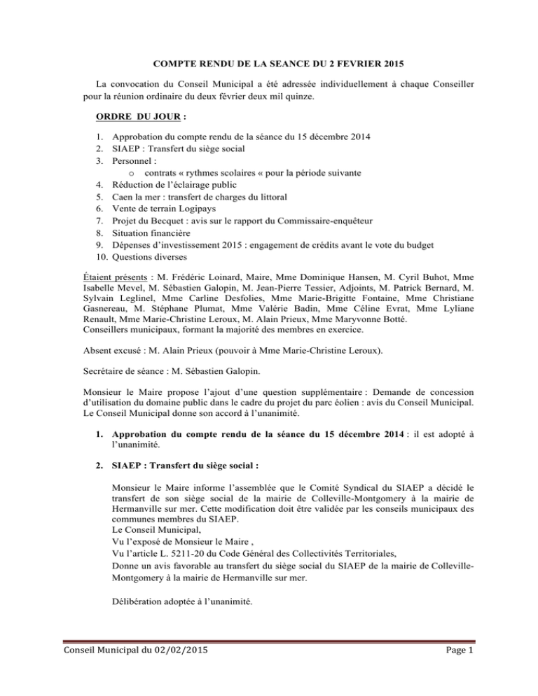 COMPTE RENDU DE LA SEANCE DU 2 FEVRIER 2015 La convocation du Conseil Municipal a été adressée individuellement à chaque Conseiller pour la réunion ordinaire du deux février deux mil quinze. ORDRE DU JOUR : 1. Approbation du compte rendu de la séance du 15 décembre 2014 2. SIAEP : Transfert du siège social 3. Personnel : o contrats « rythmes scolaires « pour la période suivante 4. Réduction de l’éclairage public 5. Caen la mer : transfert de charges du littoral 6. Vente de terrain Logipays 7. Projet du Becquet : avis sur le rapport du Commissaire-enquêteur 8. Situation financière 9. Dépenses d’investissement 2015 : engagement de crédits avant le vote du budget 10. Questions diverses Étaient présents : M. Frédéric Loinard, Maire, Mme Dominique Hansen, M. Cyril Buhot, Mme Isabelle Mevel, M. Sébastien Galopin, M. Jean-Pierre Tessier, Adjoints, M. Patrick Bernard, M. Sylvain Leglinel, Mme Carline Desfolies, Mme Marie-Brigitte Fontaine, Mme Christiane Gasnereau, M. Stéphane Plumat, Mme Valérie Badin, Mme Céline Evrat, Mme Lyliane Renault, Mme Marie-Christine Leroux, M. Alain Prieux, Mme Maryvonne Botté. Conseillers municipaux, formant la majorité des membres en exercice. Absent excusé : M. Alain Prieux (pouvoir à Mme Marie-Christine Leroux). Secrétaire de séance : M. Sébastien Galopin. Monsieur le Maire propose l’ajout d’une question supplémentaire : Demande de concession d’utilisation du domaine public dans le cadre du projet du parc éolien : avis du Conseil Municipal. Le Conseil Municipal donne son accord à l’unanimité. 1. Approbation du compte rendu de la séance du 15 décembre 2014 : il est adopté à l’unanimité. 2. SIAEP : Transfert du siège social : Monsieur le Maire informe l’assemblée que le Comité Syndical du SIAEP a décidé le transfert de son siège social de la mairie de Colleville-Montgomery à la mairie de Hermanville sur mer. Cette modification doit être validée par les conseils municipaux des communes membres du SIAEP. Le Conseil Municipal, Vu l’exposé de Monsieur le Maire , Vu l’article L. 5211-20 du Code Général des Collectivités Territoriales, Donne un avis favorable au transfert du siège social du SIAEP de la mairie de CollevilleMontgomery à la mairie de Hermanville sur mer. Délibération adoptée à l’unanimité. Conseil Municipal du 02/02/2015 Page 1 3. Personnel : contrat rythmes scolaires pour la période suivante, doit du 23 février au 10 avril 2015 : Madame Hansen, Maire-adjointe chargée du personnel, indique que les plannings sont en cours de préparation en partenariat avec la MJCI. Le Conseil Municipal charge Monsieur le Maire de la signature des contrats avec les différents intervenants. Délibération adoptée à l’unanimité. 4. Réduction de l’éclairage public : Le Conseil Municipal, Vu l’exposé de Madame Mevel, Maire-adjointe chargée de l’environnement, Vu le contexte budgétaire, Vu l’incitation à réduire les dépenses d’énergie, Vu l’étude du SDEC, Vu la proposition de la commission Environnement, DECIDE : La réduction de l’éclairage public à compter du 28 mars 2015, selon les modalités suivantes : -‐ -‐ En semaine (du dimanche soir au vendredi matin inclus) : éclairage interrompu de minuit à 6 heures du matin Le week-end (du vendredi soir au dimanche matin inclus) : éclairage interrompu de 2 heures du matin à 6 heures. Ce fonctionnement permettra une réduction de consommation électrique de 48,5 %. Délibération adoptée à l’unanimité. 5. Caen la mer : transfert de charges du littoral : Madame Hansen, chargée des finances, indique qu’en complément de la délibération du 24 novembre 2014, le Conseil Municipal sollicite auprès de Caen la mer : -‐ -‐ -‐ le classement de la plage de Colleville-Montgomery en plage d’intérêt communautaire relevant de la compétence de l’agglomération, le transfert de l’entretien et la gestion des épis et de la dune, de l’ensemble des moyens permettant le balisage et la surveillance des lieux de baignade et des activités nautiques, le transfert de la surveillance et de l’entretien de la plage déclarée d’intérêt communautaire. Délibération adoptée à l’unanimité. 6. Vente de terrain à Logipays : Monsieur le Maire rappelle que par délibération du 22 septembre 2014, le Conseil Municipal a décidé la cession de la parcelle cadastrée section AK n° 157 d’une superficie de 2653 m² à Logipays (bailleur social) au prix de 150 000 €. Le service France Domaine, dont l’avis est obligatoire, a estimé ce terrain au prix de 232 000 €. Vu la différence entre le prix de cession convenu entre les deux parties et l’avis de France Domaine, Conseil Municipal du 02/02/2015 Page 2 Vu l’avis de Maître Coquelin, Notaire, chargé du dossier de transaction, Vu les observations de la Préfecture, Le Conseil Municipal, Décide le retrait de la délibération du 22 septembre 2014, Charge Monsieur le Maire de mener de nouvelles négociations avec l’acheteur pour arriver à un accord plus favorable pour la commune, au vu de l’avis du service de France Domaine. Délibération adoptée à l’unanimité. 7. Projet du Becquet : Monsieur le Maire donne la parole à Monsieur Buhot, Maire-adjoint chargé de l’urbanisme. Il indique que les éléments nécessaires, en vue de prendre la délibération sont incomplets. C’est pourquoi, il y a lieu de la reporter au prochain conseil. Monsieur Buhot rappelle les conclusions du commissaire-enquêteur : le commissaire-enquêteur émet un avis favorable à la demande de mise en compatibilité du POS de la commune de Colleville-Montgomery avec le projet du quartier du Becquet, sous réserve que la municipalité obtienne de l’aménageur, documents à l’appui, l’assurance que l’évacuation des eaux de toutes natures ou origines soit assurée quelles que soient les circonstances ». Il poursuit ensuite en indiquant que l’ensemble des r