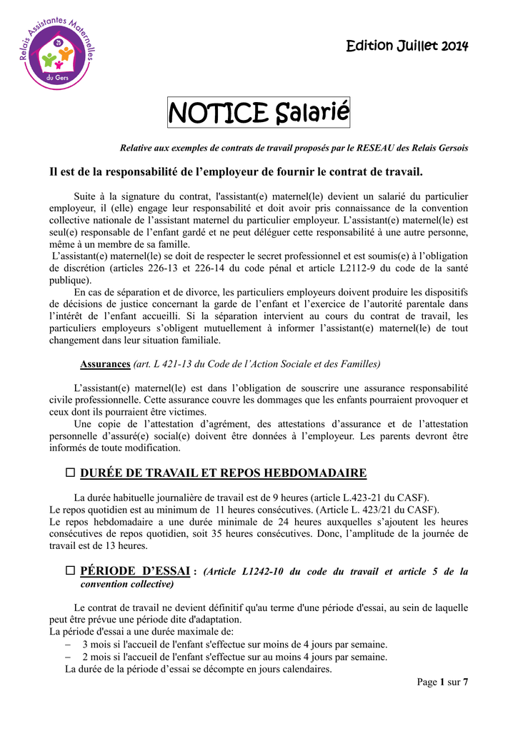 Edition Juillet 2014 NOTICE Salarié Relative aux exemples de contrats de travail proposés par le RESEAU des Relais Gersois Il est de la responsabilité de l’employeur de fournir le contrat de travail. Suite à la signature du contrat, l'assistant(e) maternel(le) devient un salarié du particulier employeur, il (elle) engage leur responsabilité et doit avoir pris connaissance de la convention collective nationale de l’assistant maternel du particulier employeur. L’assistant(e) maternel(le) est seul(e) responsable de l’enfant gardé et ne peut déléguer cette responsabilité à une autre personne, même à un membre de sa famille. L’assistant(e) maternel(le) se doit de respecter le secret professionnel et est soumis(e) à l’obligation de discrétion (articles 226-13 et 226-14 du code pénal et article L2112-9 du code de la santé publique). En cas de séparation et de divorce, les particuliers employeurs doivent produire les dispositifs de décisions de justice concernant la garde de l’enfant et l’exercice de l’autorité parentale dans l’intérêt de l’enfant accueilli. Si la séparation intervient au cours du contrat de travail, les particuliers employeurs s’obligent mutuellement à informer l’assistant(e) maternel(le) de tout changement dans leur situation familiale. Assurances (art. L 421-13 du Code de l’Action Sociale et des Familles) L’assistant(e) maternel(le) est dans l’obligation de souscrire une assurance responsabilité civile professionnelle. Cette assurance couvre les dommages que les enfants pourraient provoquer et ceux dont ils pourraient être victimes. Une copie de l’attestation d’agrément, des attestations d’assurance et de l’attestation personnelle d’assuré(e) social(e) doivent être données à l’employeur. Les parents devront être informés de toute modification. DURÉE DE TRAVAIL ET REPOS HEBDOMADAIRE La durée habituelle journalière de travail est de 9 heures (article L.423-21 du CASF). Le repos quotidien est au minimum de 11 heures consécutives. (Article L. 423/21 du CASF). Le repos hebdomadaire a une durée minimale de 24 heures auxquelles s’ajoutent les heures consécutives de repos quotidien, soit 35 heures consécutives. Donc, l’amplitude de la journée de travail est de 13 heures. PÉRIODE D’ESSAI : (Article L1242-10 du code du travail et article 5 de la convention collective) Le contrat de travail ne devient définitif qu'au terme d'une période d'essai, au sein de laquelle peut être prévue une période dite d'adaptation. La période d'essai a une durée maximale de: 3 mois si l'accueil de l'enfant s'effectue sur moins de 4 jours par semaine. 2 mois si l'accueil de l'enfant s'effectue sur au moins 4 jours par semaine. La durée de la période d’essai se décompte en jours calendaires. Page 1 sur 7 Période d’adaptation (elle est obligatoirement intégrée dans la période d’essai): Durant les premiers jours de l'accueil et au plus, durant le premier mois de la période d'essai, une période d'adaptation peut être définie tenant compte des besoins d'adaptation de l'enfant, de la famille et de l'assistant(e) maternel(le). PÉRIODE D’ESSAI en CDD Si le CDD, ou la durée initiale, est inférieur(e) ou égal(e) à 6 mois, calcul de la période d’essai : compter 1 jour par semaine prévue sur la durée du contrat. Ex : pour 12 semaines ; 12 jours de période d’essai. Au-delà de 6 mois, la période d’essai est plafonnée à 1 mois. JOURS FÉRIÉS : (convention collective, article 11) Décidé par l’employeur, le chômage des jours fériés ordinaires, tombant un jour habituellement travaillé ne pourra être la cause d’une diminution de la rémunération si le salarié remplit les conditions suivantes, avec le même employeur : Avoir 3 mois d’ancienneté Avoir accompli au moins 200 heures de travail au cours des deux mois précédant le jour férié pour un accueil de 40 heures par semaine. Avoir habituellement travaillé le jour d’accueil qui précède et le jour d’accueil suivant le jour férié. Les jours fériés travaillés sont prévus au contrat. L’accueil un jour férié non prévu au contrat peut être refusé par le salarié. CONGÉS : (convention collective, articles 12 & 13) 1 – Congés payés : Le salarié a droit à des congés payés à compter du premier jour de travail effectif chez le même employeur, quelle que soit sa durée du travail (article 50 de la loi « Warsmann » n° 2012-387 du 22 mars 2012 et article L.3141-3 du code du travail modifié). La durée des congés acquis se calcule sur une période de un mois de date à date (art.12 conv. Coll.) ou, pour les années incomplètes, par équivalence, toutes les quatre semaines ou tous les 24 jours de travail. L’année de référence court du 1e juin de l’année précédente au 31 mai de l’année en cours. A cette date, le point devra être fait sur le nombre de congés acquis et la rémunération brute versée au salarié pendant l’année de référence (hors indemnités). S’informer mutuellement et annuellement sur les modalités de prises de congés (à compter du 1e janvier et au plus tard le 1e mars de chaque année). Ce sont les employeurs qui fixent les dates de congés, ou en cas de plusieurs employeurs, ces derniers doivent s’entendre. Ainsi le parent employeur pourra exiger que l’assistante maternelle lui transmette les coordonnées des autres parents employeurs. Et seulement en cas de mésentente, le salarié pourra fixer les dates souhaitées. La rémunération brute des congés est égale : - soit à la rémunération brute hors indemnités que le (la) salarié(e) aurait perçue s’il (si elle) avait travaillé - soit au 1/10° de la rémunération totale brute (y compris celle versée au titre des congés payés) perçue par le salarié au cours de l’année de référence. Page 2 sur 7 La solution la plus avantageuse pour le salarié doit être appliquée. Dans ce cas, la r