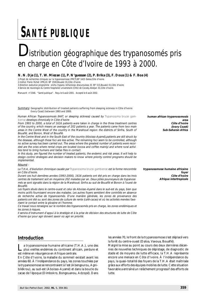 S ANTÉ PUBLIQUE Distribution géographique des trypanosomés pris en charge en Côte d’Ivoire de 1993 à 2000. N. N. Dje (1), T. W. Miezan (1), P. N’guessan (2), P. Brika (3), F. Doua (1) & F. Boa (4) 1.Projet de recherches cliniques sur la trypanosomiase (PRCT),BP 1425 Daloa,Côte d’Ivoire. 2.Institut Pierre Richet (IPR),01 BP 1500,Bouaké 01,Côte d’Ivoire. 3.Direction exécutive programme oncho. trypano. bilharziose. dracunculose, 01 BP 515,Bouaké 01,Côte d’Ivoire. 4.Service de neurologie du Centre hospitalier universitaire (CHU) de Cocody, Abidjan 01,Côte d’Ivoire. Manuscrit n°2346. “Santé publique”. Reçu le 6 août 2001. Accepté le 6 août 2002. Summary: Geographic distribution of treated patients suffering from sleeping sickness in Côte d’Ivoire (Ivory Coast) between 1993 and 2000. Human African Trypanosomosis (HAT, or sleeping sickness) caused by Trypanosoma brucei gambiense develops chronically in Côte d’Ivoire. From 1993 to 2000, a total of 1616 patients were taken in charge in the three treatment centres of the countr y, which means an average of 202 patients a year. The patients came from two main areas in the Centre West of the country in the Marahoué region: the districts of Sinfra, South of Bouaflé, and Bonon, West of Bouaflé. In the Centre West and in the South East of the country (Aboisso-Ayamé),patients are still struck by the desease, although these foci are less active. The remaining foci seem to be controlled, although no active survey has been carried out. The areas where the greatest number of patients were recor ded are the ones where rental crops are located (cocoa and coffee mainly) and where rural activi ties tend to bring humans and tsetse flies in contact. In this study, are figured the number of treated patients, the endemic and risk areas. It will help to design control strategies and decision makers to know where priority control programs should be implemented. human african trypanosomosis area Côte d’Ivoire (Ivory Coast) Sub-Saharan Africa Résumé : La T.H.A, d’évolution chronique causée par Trypanosoma brucei gambiense est la forme rencontrée en Côte d’Ivoire. Durant ces huit dernières années (1993-2000), 1616 patients ont été pris en charge dans les trois centres de traitement soit en moyenne 202 malades par an. Deux pôles pourvoyeurs de trypanoso més se sont signalés dans la région de la Marahoué; Sinfra au sud de Bouaflé et Bonon à l’ouest de Bouaflé. Les foyers situés dans le centre-ouest et celui de Aboisso-Ayamé dans le sud-est du pays, bien que moins actifs fournissent encore des malades. Les autres foyers semblent être contrôlés en absence de recherche active de trypanosomés. D’une manière générale, les zones de provenance des patients ont été ou sont des zones de culture de rente (café-cacao) et où les activités menées favo risent le contact entre la glossine et l’homme. Ce travail nous renseigne sur le nombre des trypanosomés pris en charge, les zones endémiques et les zones à risques. Il servira d’instrument d’appui à la stratégie et à la prise de décision des structures de lutte de Côte d’Ivoire qui pour agir doivent savoir où agir en priorité. Introduction L a trypanosomose humaine africaine (T.H.A.), une des plus vieilles endémies du continent africain, perdure et est même en résurgence en Afrique centrale. En Côte d’Ivoire, la maladie du sommeil existait avant les années 60. À l’indépendance du pays, les zones touchées par la trypanosomose se rencontraient à l’est (Abengourou, Agnibilékrou), au sud-est (Aboisso-Ayamé) et dans la boucle du cacao de l’époque (Dimbokro, Bongouanou, Adzopé). Dans Bull Soc Pathol Exot, 2002, 95, 5, 359-361 trypanosomose humaine africaine foyer Côte d’Ivoire Afrique intertropicale les années 70, le front de la trypanosomose s’est déplacé vers la forêt du centre-ouest (Daloa, Vavoua, Bouaflé). Malgré la mise au point au cours des deux dernières décennies de nouvelles techniques de dépistage, de diagnostic de stade et de moyens de lutte efficace, la T.H.A représente encore une menace en Côte d’Ivoire. À l’indépendance du pays, la quasi-totalité des foyers de la T.H.A était maîtrisée grâce aux efforts des équipes mobiles de lutte. Cette situation favorable a entraîné un relâchement progressif des efforts de lutte. 359 N. Dje, T. W. Miezan, P. N’guessan et al. En dépit de la résurgence au cours des années 70 de certains foyers “historiques” que sont Bouaflé, Vavoua et Daloa, et l’éclosion de nouveaux micro- foyers (Sinfra, Bonon), il n’y a plus eu d’activités de prospections médicales menées par les districts sanitaires. La T.H.A d’évolution chronique causée par Trypanosoma brucei gambiense est la forme rencontrée en Côte d’Ivoire. Selon l’OMS (6), en Côte d’Ivoire, la prévalence est moyenne mais en augmentation. Cette situation nous amène à nous interroger sur l’état d’activité des foyers de la Côte d’Ivoire. Méthodes N ous avons eu recours aux registres des malades des trois centres de traitement existants en Côte d’Ivoire que sont le projet de recherches cliniques sur la trypanosomiase (PRCT), le district sanitaire de Bouaflé et celui d’Aboisso, pendant la période couverte. Les données ont été collectées et saisies sur support informatique. Nous avons relevé les renseignements suivants : la dernière résidence du patient avant sa prise en charge, la sous-préfecture dont relève le village ou le campement. Ces trypanosomés ont été dépistés par l’association ou non des différentes méthodes classiques. Pour la sérologie, la méthode du CATT a été utilisée. Pour la mise en évidence du parasite dans le sang : la mAECT (3) ou le QBC (1) a été mise en œuvre, tandis que dans le liquide céphalo rachidien (LCR), la double centrifugation (2) et/ou le tube effilé (MSC) (5) ont été utilisés. Certains s