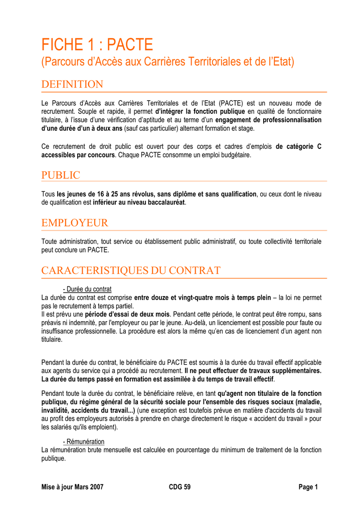 FICHE 1 : PACTE (Parcours d’Accès aux Carrières Territoriales et de l’Etat) DEFINITION Le Parcours d’Accès aux Carrières Territoriales et de l’Etat (PACTE) est un nouveau mode de recrutement. Souple et rapide, il permet d’intégrer la fonction publique en qualité de fonctionnaire titulaire, à l’issue d’une vérification d’aptitude et au terme d’un engagement de professionnalisation d’une durée d’un à deux ans (sauf cas particulier) alternant formation et stage. Ce recrutement de droit public est ouvert pour des corps et cadres d’emplois de catégorie C accessibles par concours. Chaque PACTE consomme un emploi budgétaire. PUBLIC Tous les jeunes de 16 à 25 ans révolus, sans diplôme et sans qualification, ou ceux dont le niveau de qualification est inférieur au niveau baccalauréat. EMPLOYEUR Toute administration, tout service ou établissement public administratif, ou toute collectivité territoriale peut conclure un PACTE. CARACTERISTIQUES DU CONTRAT - Durée du contrat La durée du contrat est comprise entre douze et vingt-quatre mois à temps plein – la loi ne permet pas le recrutement à temps partiel. Il est prévu une période d’essai de deux mois. Pendant cette période, le contrat peut être rompu, sans préavis ni indemnité, par l'employeur ou par le jeune. Au-delà, un licenciement est possible pour faute ou insuffisance professionnelle. La procédure est alors la même qu’en cas de licenciement d’un agent non titulaire. Pendant la durée du contrat, le bénéficiaire du PACTE est soumis à la durée du travail effectif applicable aux agents du service qui a procédé au recrutement. Il ne peut effectuer de travaux supplémentaires. La durée du temps passé en formation est assimilée à du temps de travail effectif. Pendant toute la durée du contrat, le bénéficiaire relève, en tant qu'agent non titulaire de la fonction publique, du régime général de la sécurité sociale pour l'ensemble des risques sociaux (maladie, invalidité, accidents du travail...) (une exception est toutefois prévue en matière d'accidents du travail au profit des employeurs autorisés à prendre en charge directement le risque « accident du travail » pour les salariés qu'ils emploient). - Rémunération La rémunération brute mensuelle est calculée en pourcentage du minimum de traitement de la fonction publique. Mise à jour Mars 2007 CDG 59 Page 1 Elle ne peut être inférieure à 55% de ce montant si le jeune est âgé de moins de 21 ans, à 70% audelà de 21 ans. - Formation Pendant son contrat, le jeune suit une formation en alternance. La qualification, le titre ou le diplôme ainsi préparé doit porter sur un domaine d’activité en rapport avec l’emploi occupé pendant le contrat et être enregistré au Répertoire National des Certifications Professionnelles (RNCP). Le temps consacré à la formation représente au moins 20% de la durée totale du contrat. Il peut être inégalement réparti sur la durée totale du PACTE : plus intense au début, plus ponctuel à la fin, par exemple. ORGANISATION DE LA FORMATION Le PACTE vise à l’accès à l’emploi par une formation qualifiante. Ce peut être un diplôme ou une qualification certifiée. En signant un PACTE, l’employeur et l’agent s’engagent réciproquement sur une trajectoire de formation en alternance et sur un emploi de titularisation. En plus du PACTE, une convention doit être conclue avec un centre de formation, ce peut être l’AFPA, un GRETA, un CFA, un IPAG/CPAG , un IRA, le CNFPT, un lycée professionnel ou tout autre organisme de formation public ou privé. Cette convention donne lieu à la prise en charge par l’administration d’emploi des frais de formation engendrés par le PACTE. TUTEUR Un agent de la collectivité territoriale ou de l’établissement public sera désigné comme tuteur avec pour mission d’accueillir le jeune, de le guider, de suivre son activité dans et hors du service ainsi que son parcours de formation. Il émet un avis sur l’aptitude du jeune et établit un carnet de suivi sur le déroulement du PACTE qui est joint au dossier dont dispose la commission de titularisation. Le tuteur doit être volontaire et justifier d’une ancienneté de service d’au moins deux ans. Il peut bénéficier d’actions de formation pour accomplir sa mission. Sa fonction de tuteur peut être reconnue dans le cadre des régimes indemnitaires existants. AVANTAGES POUR L’EMPLOYEUR - Rémunération Les PACTE conclus avant le 1er janvier 2010 ouvrent droit à une exonération des cotisations patronales au titre des assurances sociales (maladie, maternité, invalidité, décès, vieillesse) et des allocations familiales qui sont assises sur les rémunérations versées au cours d’un mois civil aux bénéficiaires. - Aide à la formation Pour encourager le développement des PACTE, une prime de 1000 euros par PACTE et par an sera versée aux employeurs publics. Cette prime concerne l’ensemble des PACTE conclus avant le 1er janvier 2010. Mise à jour Mars 2007 CDG 59 Page 1 Afin de percevoir cette aide, chaque employeur devra adresser au CNASEA, qui procède au versement effectif de la prime une copie de la convention de formation et une copie du contrat de PACTE (Formulaire Cerfa n°12592*01). - Engagement de l’agent Au terme du contrat, après validation de l’aptitude de l’agent à exercer ses fonctions par la commission de titularisation et obtention du titre ou diplôme requis, l’agent est titularisé par l’autorité territoriale sur l’emploi qu’il occupait pendant son PACTE après avis de la commission administrative paritaire. La titularisation est soumise à une obligation de servir dans la collectivité ayant procédé au recrutement. La durée de l’engagement de servir est fixée à deux fois la durée du contrat (majorée, le cas échéant, des périodes de renouvellement). FORMALITES A ACCOMPLIR Le PACTE fait l'objet d'un con