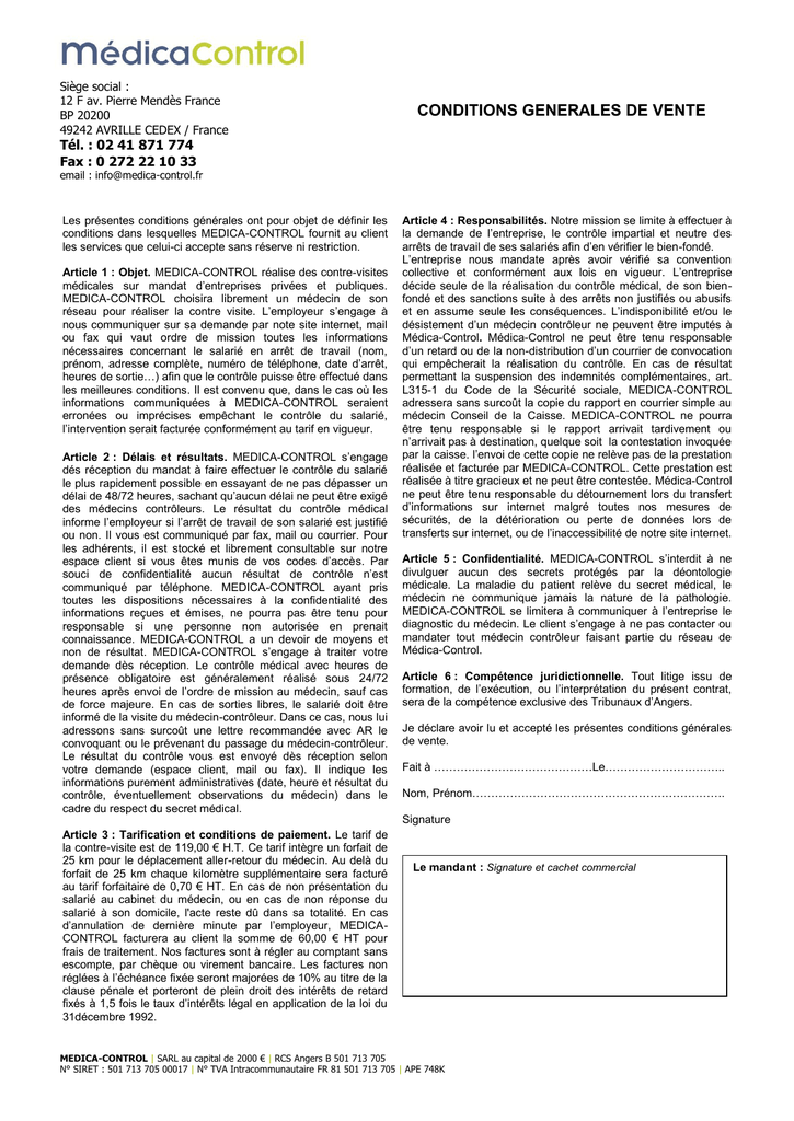 Siège social : 12 F av. Pierre Mendès France BP 20200 49242 AVRILLE CEDEX / France CONDITIONS GENERALES DE VENTE Tél. : 02 41 871 774 Fax : 0 272 22 10 33 email : [email protected] Les présentes conditions générales ont pour objet de définir les conditions dans lesquelles MEDICA-CONTROL fournit au client les services que celui-ci accepte sans réserve ni restriction. Article 1 : Objet. MEDICA-CONTROL réalise des contre-visites médicales sur mandat d’entreprises privées et publiques. MEDICA-CONTROL choisira librement un médecin de son réseau pour réaliser la contre visite. L’employeur s’engage à nous communiquer sur sa demande par note site internet, mail ou fax qui vaut ordre de mission toutes les informations nécessaires concernant le salarié en arrêt de travail (nom, prénom, adresse complète, numéro de téléphone, date d’arrêt, heures de sortie…) afin que le contrôle puisse être effectué dans les meilleures conditions. Il est convenu que, dans le cas où les informations communiquées à MEDICA-CONTROL seraient erronées ou imprécises empêchant le contrôle du salarié, l’intervention serait facturée conformément au tarif en vigueur. Article 2 : Délais et résultats. MEDICA-CONTROL s’engage dés réception du mandat à faire effectuer le contrôle du salarié le plus rapidement possible en essayant de ne pas dépasser un délai de 48/72 heures, sachant qu’aucun délai ne peut être exigé des médecins contrôleurs. Le résultat du contrôle médical informe l’employeur si l’arrêt de travail de son salarié est justifié ou non. Il vous est communiqué par fax, mail ou courrier. Pour les adhérents, il est stocké et librement consultable sur notre espace client si vous êtes munis de vos codes d’accès. Par souci de confidentialité aucun résultat de contrôle n’est communiqué par téléphone. MEDICA-CONTROL ayant pris toutes les dispositions nécessaires à la confidentialité des informations reçues et émises, ne pourra pas être tenu pour responsable si une personne non autorisée en prenait connaissance. MEDICA-CONTROL a un devoir de moyens et non de résultat. MEDICA-CONTROL s’engage à traiter votre demande dès réception. Le contrôle médical avec heures de présence obligatoire est généralement réalisé sous 24/72 heures après envoi de l’ordre de mission au médecin, sauf cas de force majeure. En cas de sorties libres, le salarié doit être informé de la visite du médecin-contrôleur. Dans ce cas, nous lui adressons sans surcoût une lettre recommandée avec AR le convoquant ou le prévenant du passage du médecin-contrôleur. Le résultat du contrôle vous est envoyé dès réception selon votre demande (espace client, mail ou fax). Il indique les informations purement administratives (date, heure et résultat du contrôle, éventuellement observations du médecin) dans le cadre du respect du secret médical. Article 4 : Responsabilités. Notre mission se limite à effectuer à la demande de l’entreprise, le contrôle impartial et neutre des arrêts de travail de ses salariés afin d’en vérifier le bien-fondé. L’entreprise nous mandate après avoir vérifié sa convention collective et conformément aux lois en vigueur. L’entreprise décide seule de la réalisation du contrôle médical, de son bienfondé et des sanctions suite à des arrêts non justifiés ou abusifs et en assume seule les conséquences. L’indisponibilité et/ou le désistement d’un médecin contrôleur ne peuvent être imputés à Médica-Control. Médica-Control ne peut être tenu responsable d’un retard ou de la non-distribution d’un courrier de convocation qui empêcherait la réalisation du contrôle. En cas de résultat permettant la suspension des indemnités complémentaires, art. L315-1 du Code de la Sécurité sociale, MEDICA-CONTROL adressera sans surcoût la copie du rapport en courrier simple au médecin Conseil de la Caisse. MEDICA-CONTROL ne pourra être tenu responsable si le rapport arrivait tardivement ou n’arrivait pas à destination, quelque soit la contestation invoquée par la caisse. l’envoi de cette copie ne relève pas de la prestation réalisée et facturée par MEDICA-CONTROL. Cette prestation est réalisée à titre gracieux et ne peut être contestée. Médica-Control ne peut être tenu responsable du détournement lors du transfert d’informations sur internet malgré toutes nos mesures de sécurités, de la détérioration ou perte de données lors de transferts sur internet, ou de l’inaccessibilité de notre site internet. Article 5 : Confidentialité. MEDICA-CONTROL s’interdit à ne divulguer aucun des secrets protégés par la déontologie médicale. La maladie du patient relève du secret médical, le médecin ne communique jamais la nature de la pathologie. MEDICA-CONTROL se limitera à communiquer à l’entreprise le diagnostic du médecin. Le client s’engage à ne pas contacter ou mandater tout médecin contrôleur faisant partie du réseau de Médica-Control. Article 6 : Compétence juridictionnelle. Tout litige issu de formation, de l’exécution, ou l’interprétation du présent contrat, sera de la compétence exclusive des Tribunaux d’Angers. Je déclare avoir lu et accepté les présentes conditions générales de vente. Fait à ……………………………………Le………………………….. Nom, Prénom…………………………………………………………. Signature Article 3 : Tarification et conditions de paiement. Le tarif de la contre-visite est de 119,00 € H.T. Ce tarif intègre un forfait de 25 km pour le déplacement aller-retour du médecin. Au delà du forfait de 25 km chaque kilomètre supplémentaire sera facturé au tarif forfaitaire de 0,70 € HT. En cas de non présentation du salarié au cabinet du médecin, ou en cas de non réponse du salarié à son domicile, l'acte reste dû dans sa totalité. En cas d’annulati